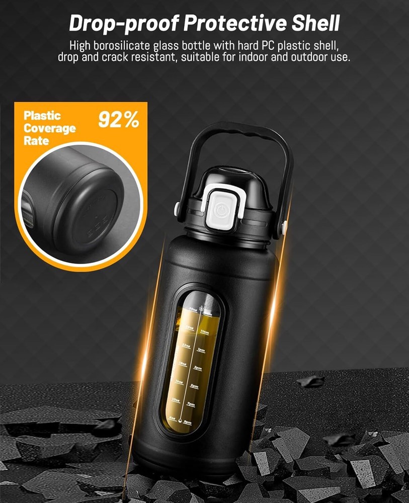 t50 oz Glass Water Bottles - Large Motivational Glass Water Bottle with Time Mar UNBREAKABLE GLASS WATER BOTTLE: The heavy-duty protective sleeve is made of hard shatterproof PC which provides strong protection for the internal high borosilicate glass water bottle. It has better protection effect than conventional Neoprene or silicone sleeve. No longer afraid of falling and hitting. Frosted surface of external protective shell let you easy to grip, and reduces sweats or condensation. WATER INTAKE TRACKER & TIME MARKER DESIGN: The glass water bottle with motivational time marker and scale line allows you keep track of your daily water intake and meet your fitness and hydration goals, keeps you hydrated all the day, helps you to develop good habits of drinking water. You can use it at home as a daily water intake bottle, or take the water bottle with measurements to anywhere to solve the problem of drinking too little water every day. LARGE CAPACITY WATER BOTTLE WITH HANDLE: The 50oz/1500ml glass drinking bottles with lids ensures you drink enough water without having to refill the big water bottle with straw frequently. Perfect for the on-the-go lifestyle, workouts, or busy workday! The sturdy handle is ergonomically designed for easy gripping and long term use. LEAKPROOF ONE TOUCH FLIP LID: The reusable glass water bottles is equipped with an auto flip lid, you can easily open it and drink with one hand when you are busy or inconvenient. For better leak-proof effects, please twist the lid tightly, close the clear cap, and flip the leakproof lock upwards to lock it. With silicone gasket, silicone spout stopper and safety lock, triple leak protection ensures sealing and prevents leakage. Shipping We offer FREE shipping on all orders! We ship within Three business days of payment, usually sooner. We use a selection of shipping services such as UPS, FedEx, USPS etc. We only ship to the lower 48 states, no APO/FPO addresses or PO Boxes allowed. Local pickups and combined shipping options are not provided at this time. Return You can return a product for up to 30 days from the date you purchased it. Any product you return must be in the same condition you received it and in the original packaging. Please keep the receipt. Customer satisfaction is very important to us. If you have any problem with your order, please contact us and we will do our best to make you satisfied. Contact Us If you have any queries, please contact us via ebay. We usually respond within 24 hours on weekdays. Please visit our eBay store to check out other items for sale! Thank you for shopping at our store.