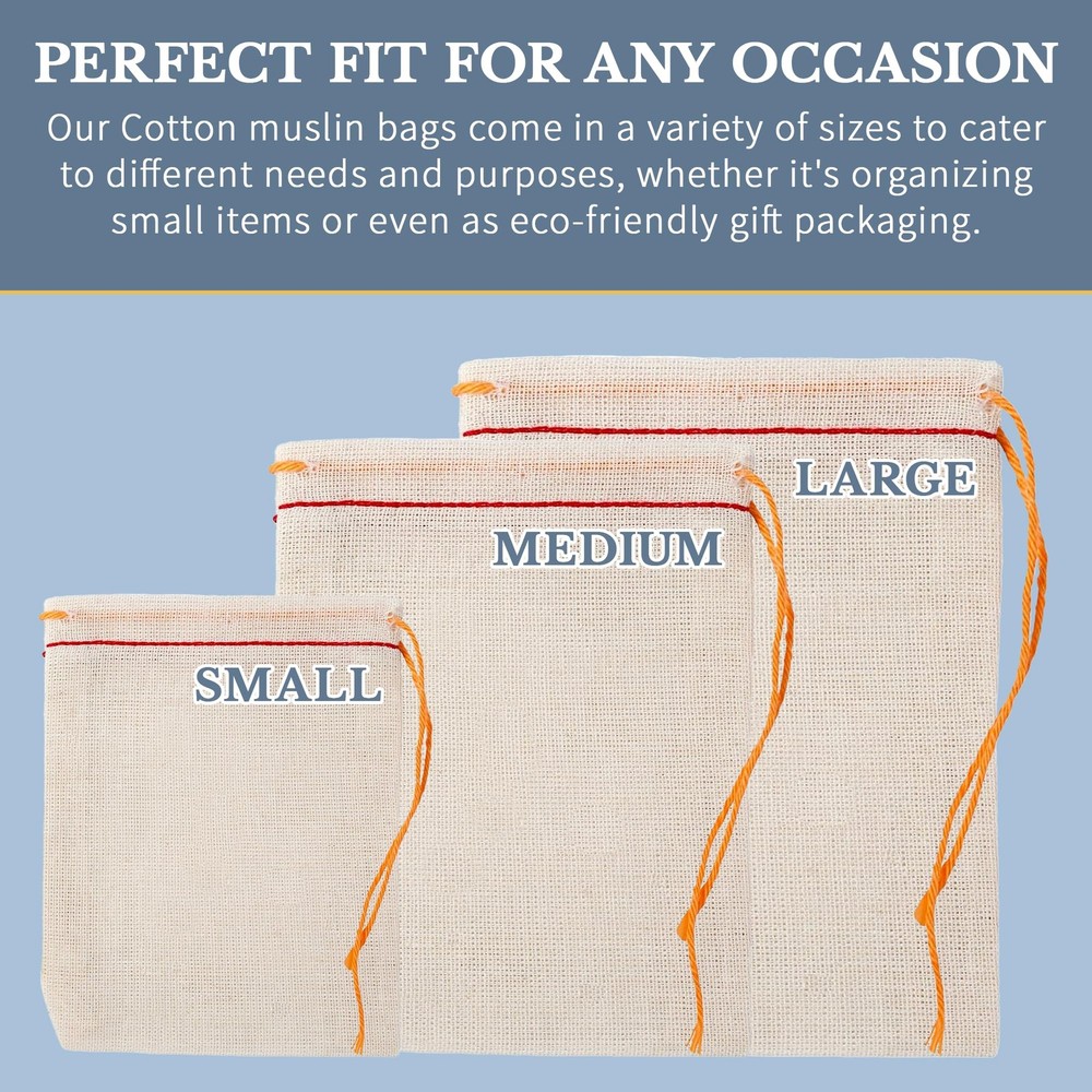 Imagine the convenience of ' Cotton Muslin Bags with Drawstrings. These sturdy bags, made from top-quality cotton, keep your items safe with easy-to-use drawstring closures. Whether you're straining, brewing tea, or spicing up a dish, these bags are versatile. Plus, they come in various sizes to fit your needs, from jewelry to gifts. With plenty in each pack, you can use them for various occasions, from making sachet bags to unique fabric gift bags. Their breathable material ensures items stay fresh. ' Cotton Muslin Bags with Drawstrings are simple yet versatile, making them perfect for storage, gifting, and more. Explore the endless possibilities they offer! DURABLE DRAWSTRING BAGS: Our Cotton Muslin Bags with Drawstrings, proudly made in the USA by , are designed to last. Crafted from high-quality cotton, they are perfect for storing jewelry, herbs, or spices. These bags are not only sturdy but also versatile, making them an excellent choice for your drawstring gift bag needs. SECURE AND VERSATILE: Our Cotton Muslin Bags feature reliable drawstring closures, ensuring your items are securely stored. Whether you're using them as cheese cloth bags for straining, reusable tea bags, or spice bags for cooking, these versatile muslin bags keep your contents safe and fresh. AMPLE SUPPLY FOR ALL NEEDS: provides an extensive collection of natural-colored Muslin Bags with Drawstrings, available in bulk. These multipurpose cotton bags cater to all your storage and gifting needs. Customize them to create unique sachet bags, fabric gift bags with drawstrings, or drawstring bags for various occasions. Enjoy the generous quantity and superior quality of our reusable muslin bags. SMALL & VERSATILE: Discover our small Cotton Muslin Bags with Drawstrings, ideal for jewelry, spices, or reusable tea bags. These compact drawstring bags snugly accommodate your smaller items, keeping them secure SIMPLE YET VERSATILE: Embrace the timeless charm and versatility of ' Cotton Muslin Bags with Drawstrings, proudly made in the USA. They are ideal for jewelry, herbs, spices, fruit, candies, or small gifts, enhancing your storage solutions. Whether used as muslin gift bags, small cloth bags with drawstrings, or cotton drawstring bags, these delightful muslin bags offer endless possibilities for storage and gifting. Their simplicity is what makes them so versatile and appealing.
