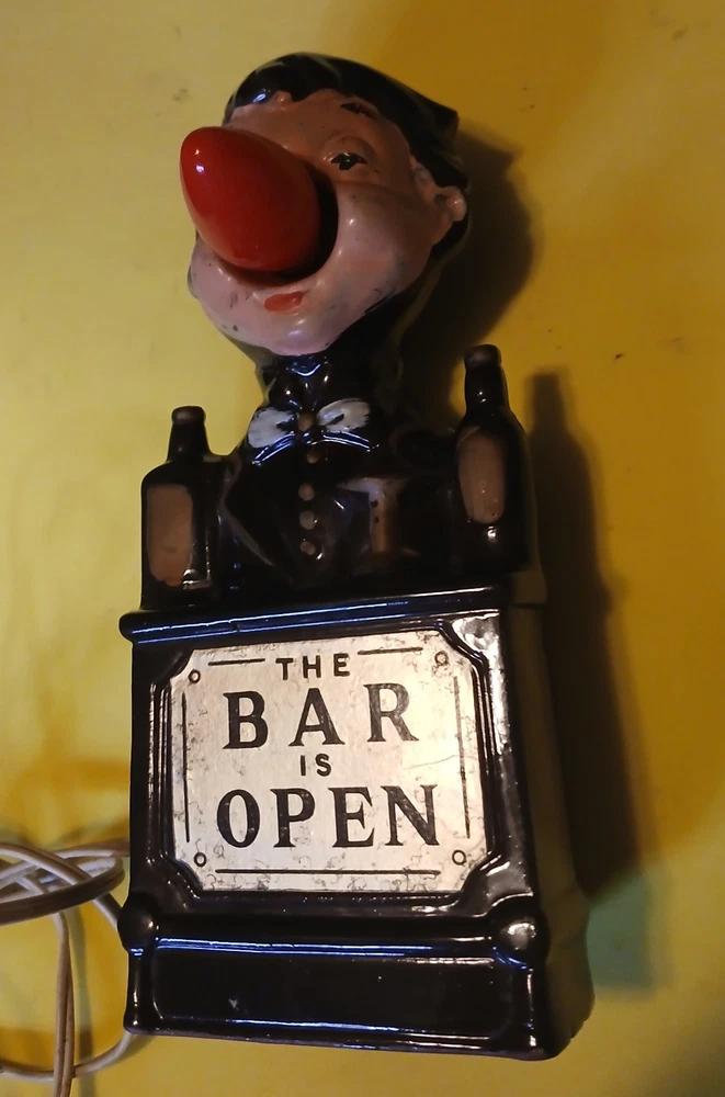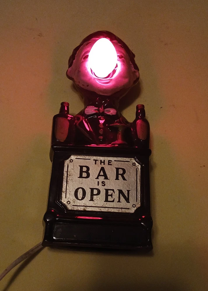 See pictures for description. This vintage 1950s ceramic table lamp from Japan features a unique design of a bartender with a red nose, fittingly named "The Bar Is Open." The lamp stands at 7.5 inches in height with a diameter of 8 inches, showcasing a drunk bartender pattern that adds a touch of whimsy to any cocktail lounge decor. The bartender's nose lights up with a C7 bulb, adding to the lamp's charm and vintage appeal. Perfect for MCM (Mid-Century Modern) enthusiasts looking to add a playful and retro vibe to their space. SELLING AS IS Buyers with less than 10 purchases must pay immediately after winning or their bid will be cancelled. We will not change anyone's address after purchase. See photos for more detailed description - ask for more if needed. Selling As Is. Use shipping tab to determine your shipping fee. Ebay may assess sales tax on their end. Prompt payment is required. If you are bidding on more than one item of ours within a few days, we will discount your shipping fee - please let us know if you are bidding on more than one item and we will wait and combine shipping and apply a discount - wait to pay until we invoice you separately for the combined items. Although we ship within one business day, actual delivery time may be delayed due to pandemic/USPS issues. Thanks for looking! Good luck on bidding!