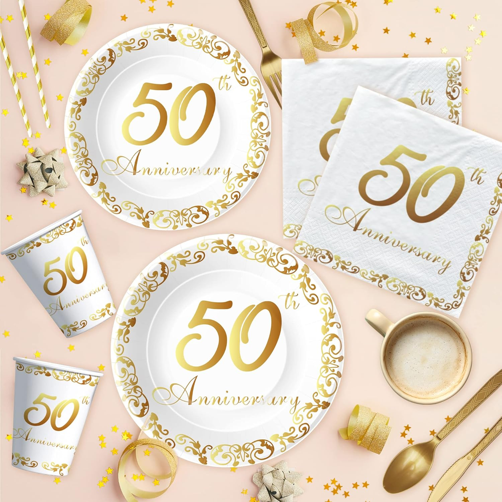 【Package Included】Our 50th wedding anniversary plates dinnerware included 24pcs 9'' 50th anniversary dinner plates, 24pcs 7'' 50th dessert plates, 24pcs 50th paper napkins, 24pcs paper cups, 24set cutlery, 24pcs paper straws, 2pcs 50th anniversary tablecloth, for happy 50th wedding decorations party supplies 【50th Anniversary Table Decorations】Happy anniversary! Our 50th-anniversary party decorations dinnerware set is designed in gold color, this wedding anniversary decorations set can completely meet your needs, classic gold colors match perfectly making the party impressed 【Save Time】These happy anniversary decorations for 50th wedding are perfect for your party. The disposable tableware and party tablecloth can save you from the hassle of cleaning after the party, you can enjoy more time with friends and family at this party 【Premium Quality Materials】Crafted from quality materials, these 50th anniversary plates and napkins party supplies are both stylish and reliable. The plates and cups are sturdy enough for meals, while the lightweight design ensures safe and comfortable use 【Versatile & Timeless】50th wedding anniversary party supplies is nice for couples’ milestone anniversaries, vow renewals, or romantic dinner parties. The chic and modern look fits both casual gatherings and formal celebrations Product description