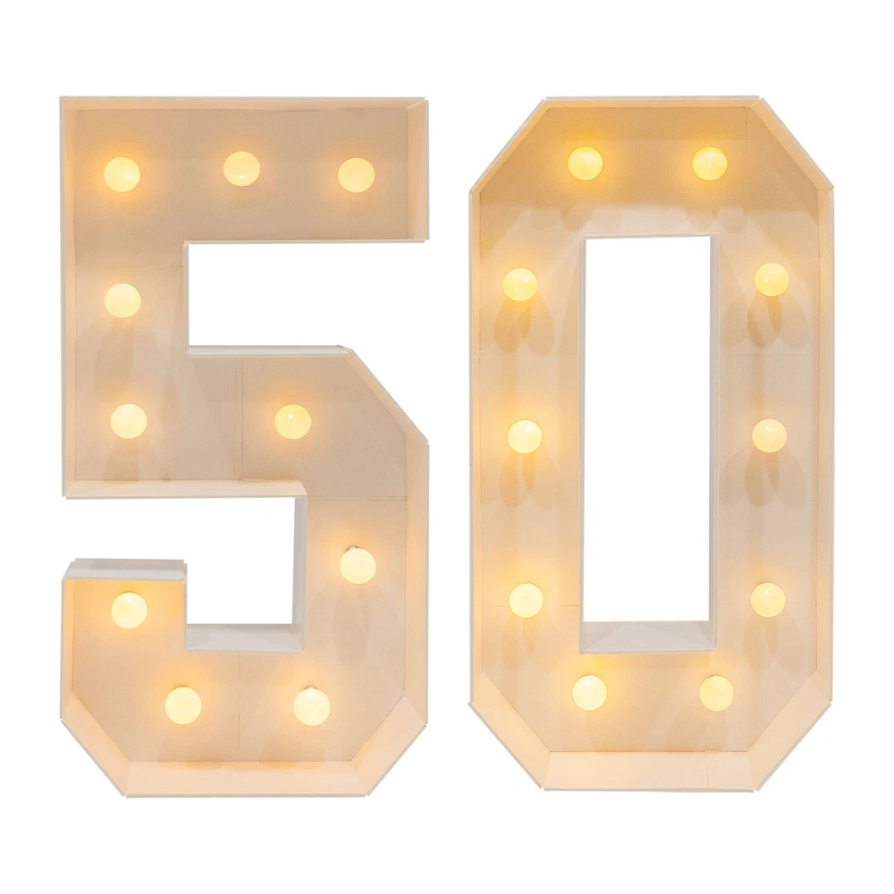 Specifications Color: White Material: KT Board Process: Machine Cutting Style: Vintage Indoor/Outdoor Usage: Indoor Assembly Required: Yes Mounting Type: Floor Standing Power Source: Battery Powered EU Energy Label Efficiency Labeling Class: A++to E Efficiency: E Battery Type: 6* AA Batteries(Not Included) Light Source: 20* LED Bulbs(Included) Light Color: Warm Color Temperature: 2000-3000K Product Height: 100cm/39.37in Package Size: 41*25*19cm/16.14*9.84*7.48in Gross Weight: 1.25kg/2.76lbs Net Weight: 1.1kg/2.43lbs Package Included 1 Pair* 50 Light Up Numbers 2* Double-sided Tapes 2* Battery Boxes 20* LED Bulbs 1* English Manual Other Accessories for Assembly 50th Birthday Decorations Numbers Birthday Number Light Marquee Light up 39.37in Description Eager to add a touch of extraordinary style to your birth celebration? These light-up numbers combine light and numbers to create a favorable atmosphere. It is not only a witness to time, but also an engraver of emotions and memories, tailor-made for your birthday party or anniversary. Use it at your birthday party or anniversary event, it will surely impress your guests and become an unforgettable memory! Key Features Build to Last : This product is mainly made of KT board with a machine cutting process, which is hard, abrasion, and corrosion- resistant to ensure long-term use. Excellent Light Source : 20 LED bulbs in warm colors with a color temperature of 2000-3000K not only give a warm and bright glow but are also energy-saving and create a great atmosphere. Battery Powered : Each digit is powered by 3 AA batteries (not included) and has a switch on its battery compartment that can be used to control the light, which can be turned on/switched off when needed for special occasions. Great Decoration : These numbers stand at 39.37in tall and come with a white number color and warm light color, presenting a retro style. It can make your birthday or anniversary party more beautiful and eye-catching. When the light is turned on, it becomes a number ornament. Great Gift : Thanks to its beauty and practicality, you can bring this product home to yourself, your lovers, or your family to enjoy a happy 50th birthday party. Personalize Your Backdrop : You can use balloons, flowers, or other decorations to decorate this product, creating a unique backdrop. Easy to Assemble : The frames are pre-cut, you just need to use double-sided tape to make them into 50 shapes and then put the LED bulbs into them, which is convenient and easy. Easy to Carry and Store : Its lightweight (2.43lbs) and detachable design allow you to take it around and it can be stored easily when it is not in use. Quality Service : We stand behind all our guests and look forward to assisting you with your purchase. It is our pleasure to answer your confusion and questions. The end of the story between us is not "we sell and you buy". Details Wide Bottom : The wide bottom makes the force area large, making the overall stability of the product good, and not easy to tip over. Smooth Edges : They not only enhance the aesthetics of the product but also improve safety during installation and use. Application It is suitable for birthday parties, anniversaries, and other celebration activities. Specifications Color: White Material: KT Board Process: Machine Cutting Style: Vintage Indoor/Outdoor Usage: Indoor Assembly Required: Yes Mounting Type: Floor Standing Power Source: Battery Powered EU Energy Label Efficiency Labeling Class: A++to E Efficiency: E Battery Type: 6* AA Batteries(Not Included) Light Source: 20* LED Bulbs(Included) Light Color: Warm Color Temperature: 2000-3000K Product Height: 100cm/39.37in Package Size: 41*25*19cm/16.14*9.84*7.48in Gross Weight: 1.25kg/2.76lbs Net Weight: 1.1kg/2.43lbs Package Included 1 Pair* 50 Light Up Numbers 2* Double-sided Tapes 2* Battery Boxes 20* LED Bulbs 1* English Manual Other Accessories for Assembly Notes Please do not use it in a high-temperature environment. Please note that batteries are not included in this product. Please read the instructions carefully and take note of the safety precautions contained therein. Please allow the slight color difference caused by the shooting light and the 1-3 cm error due to manual measurement, and make sure you do not mind before ordering. Payment Delivery details Terms of sales About us Contact us Payment We accept ebay payment 。 Fees such as import duties, taxes are not included in the item price or shipping costs. These charges are the buyer's responsibility. Delivery details Shipping: 2-9 working days to: USA Terms of sales We maintain high standards of excellence and strive for hundred percent customer satisfaction. Feedback is very important to us. We hope that you contact us immediately before you give neutral or negative feedback, so that we can address your concerns. It is impossible to address issues if we do not know about them! About us Your satis faction is our ultimate goal. We work hard to earn your trust and future business. Our certified technicians have tested each item before shipping. The unit comes with 1 year limited warranty on all manufacturing defects. a) If you receive a defective item, you may return it or ask for a discount. Please contact us within 14 days after you receive the package. b) What you returned must be intact and in its original packaging as re? u. Customer is responsible for shipping costs of the returned item. c) We will cover the cost of shipping back t with the shipping rate indicated in the registration page. We will send you a new unit or refund the full payment you paid. Thank you. Contact us Business Hour Business Hour: Monday To Friday: 8:30 AM to 5:00 PM (Beijing China time) Due to time zones, our reply to your questions may not be immediately. But within above working time, we will reply your email within 24 hours. If it's non-workdays, please kindly be patient and wait till Monday. Please contact us with ebay message. Please feel free to contact 
