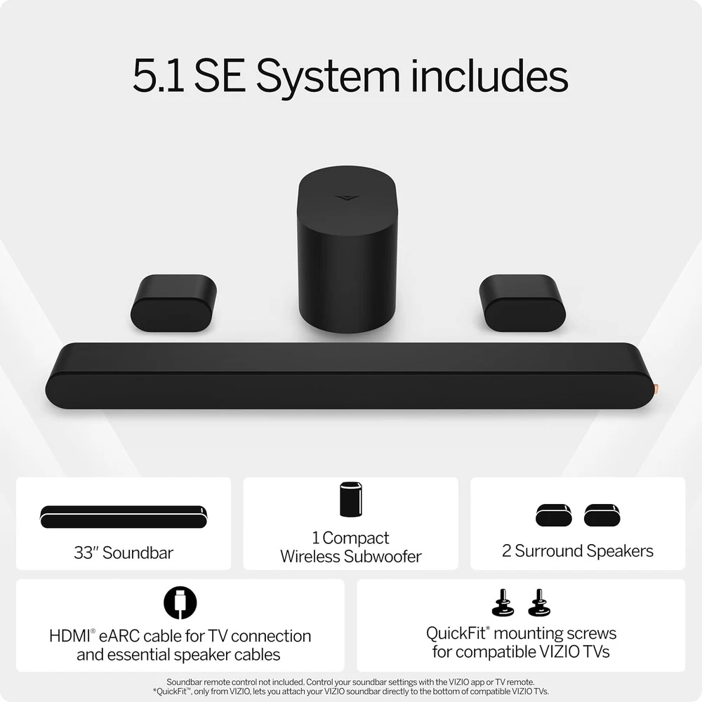 Includes Mp3 Player?: No Recommended Uses For Product: For Televisions Subwoofer Connectivity Technology: Wired Smart Home Compatibility: None Compatible Devices: Television, Smartphone Unit Count: 1.0 Count Type: Soundbar Compatible Model: Universal Item Width: VIZIO Soundbar with Subwoofer Specific Uses For Product: Home Theater, Television Audio Enhancement Material: Plastic Item Weight: 16.02 pounds Style: 5.1 Number Of Items: 1 Shape: Rectangular Impedance: 8 Ohms Item Length: VIZIO Soundbar with Subwoofer Frequency Response: 5e+1 Hz Wireless Communication Technology: Bluetooth Speaker Maximum Output Power: 180 Watts Water Resistance Level: Not Water Resistant Speaker Type: Soundbar Is Waterproof: False Model: VIZIO Soundbar with Subwoofer Brand: Unbranded Audio Inputs: HDMI, Optical Surround Sound Formats: Dolby Atmos, DTS:X Surround Sound Channel Configuration: 5.1 Features: Compact, DTS:X, Bluetooth Streaming, Dolby Atmos, QuickFit Special Feature: Dts:x, Bluetooth Streaming, Dolby Atmos, Quickfit RMS Power: 180 W Power Source: Corded Electric UPC: Does Not Apply Series Number: 5 Connectivity Protocol: Bluetooth System Configuration: 5.1 Channel Speaker Size: 5.25 Inches Item Height: VIZIO Soundbar with Subwoofer Driver Size: 5.25 in Control Method: App Product Dimensions: 3.23"d X 33"w X 2.28"h Color: Black Connectivity: Bluetooth, HDMI, Optical gtin13: Does Not Apply