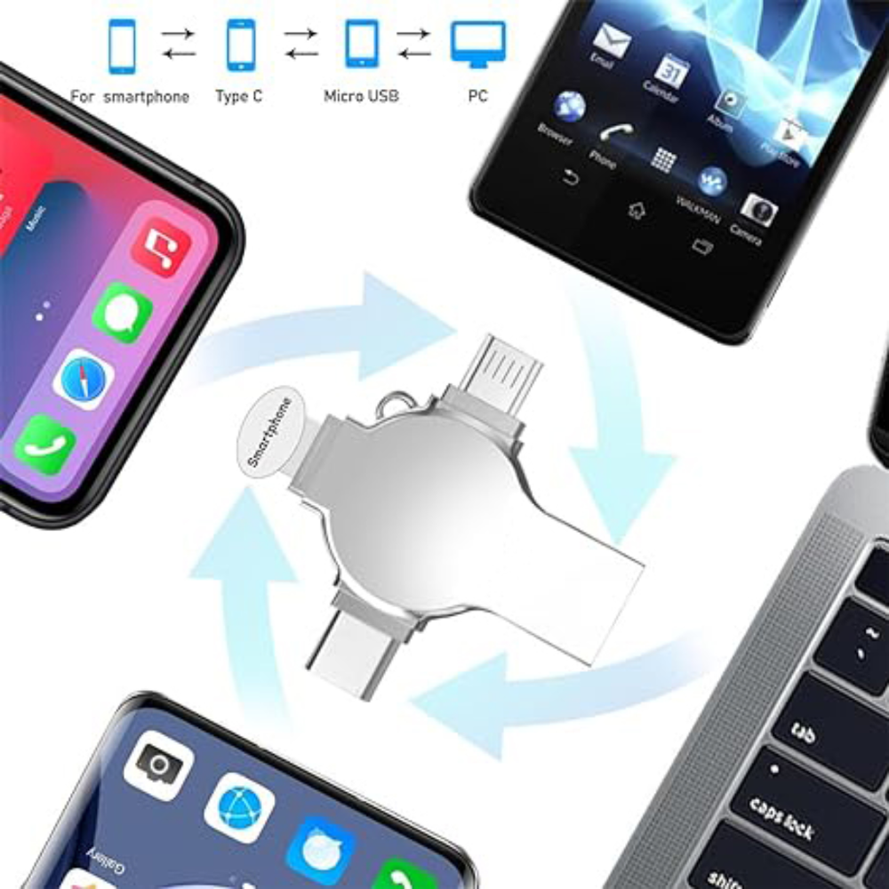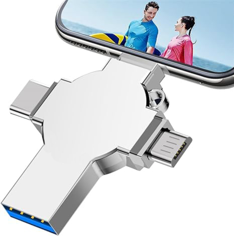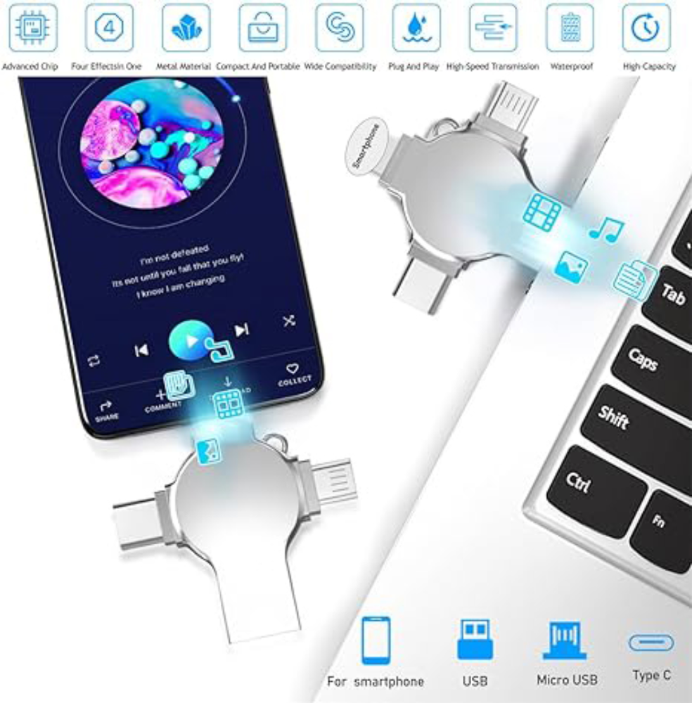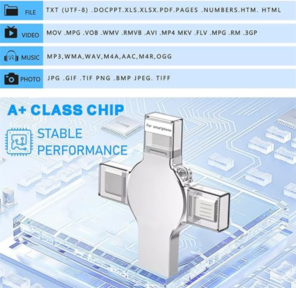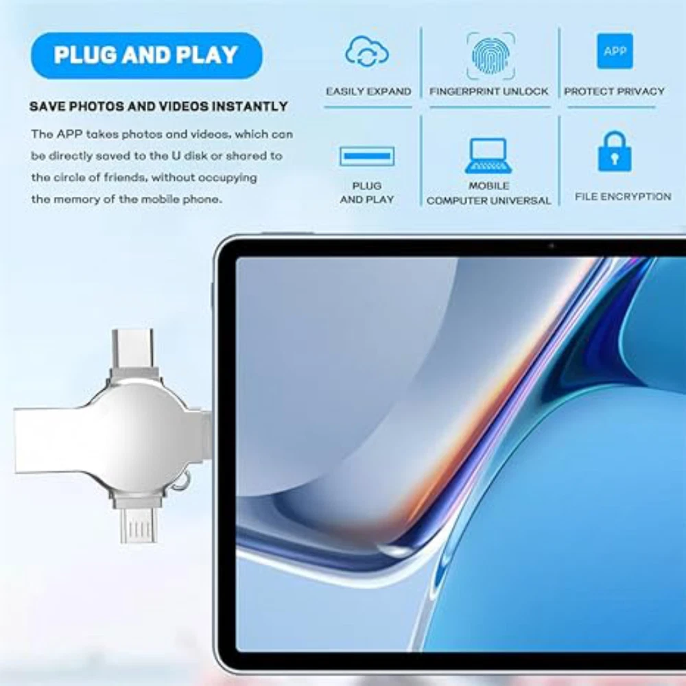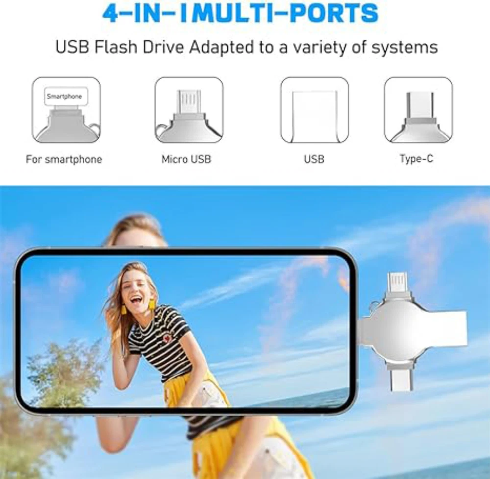 Note: Please check compatibility before purchasing. Features: 【4-in-1 Multi-Function Interface】The flash drive has four interfaces (smartphone USB + micro USB + type C + computer USB), which is more convenient for data transfer between different devices, thus getting rid of the trouble of data cables and allowing you to switch easily storage. 【Security Protection of Personal Privacy】The 4 in 1 USB flash drive can fully protect privacy and support some or all file encryption. The encrypted files will not be displayed on the computer. When sharing files, photos and videos with colleagues and friends, there is no need to worry about personal privacy leakage, providing you with comfort and security use experience. 【One-Click Easy Backup】With this flash drive, you can easily back up files, photos, videos and phonebooks on your phone with one click through the APP, eliminating the trouble of pasting and copying, and you can also use the USB port to store your own data backup on the computer as a dual Insurance. (Android phones need to turn on the OTG function, no need to download APP.) 【Stable & High-Speed Transfers】The USB 3.0 memory stick with premium chip guarantees fast and stable data transfer, allowing you to transfer photos, videos and files within seconds. The transfer speed of this USB is faster than ordinary 2.0 version, which has higher performance than ordinary traditional USB storage flash drives, save time and get more work done. 【Portable Streaming Media】There is a metal hole on the USB stick, you can connect it to your backpack. The 256GB storage space allows you to watch movies/play music directly on the flash drive, and you can also share photos and videos taken during the trip to Facebook, Twitter and other social media to share beautiful moments. Watch Videos Directly: Store your favorite movies or music downloaded from websites on your flash drive and watch them anytime, anywhere. Media Formats Supported: Music: M4A / AIFF / CAF / MP3 / WAV Image: GIF / JPG / PNG / JPEG Video: AVI / FLV / M4V / MKV / MOV / MP4 / RMVB Document: DOC / PPT / XLS / XLSX / PDF / HTML / TX Please Note: 1. For Mobile Devices needs to download app ''Y-Disk'', you can search the app from the App Store. 2. For Android Devices must have OTG function in order to use this flash drive, no need to download APP. 3. It should be noted that due to different factory algorithms, the actual capacity will be slightly less than the display capacity. This is a normal phenomenon, please don’t worry. Package: 1* Flash Drive Note: 1.The display capacity and nominal capacity are different because the calculation methods are different. Manufacturer standard: 1GB=1,000MB / 1MB=1,000KB. Operation system standard: 1GB=1,024MB / 1MB=1,024KB. About the usable capacity: please kindly note the memo about the capacity for the storage products: 4GB =approximately 3.4GB-3.8GB 32GB = approximately 28GB-30GB 64GB = approximately 58GB-60GB 128GB = approximately 119GB-124GB 256GB = approximately 249GB-250GB 512GB = approximately 498GB-500GB 1TB = approximately 998GB-1002GB 2TB = approximately 1950GB-1960GB (1.9T)
