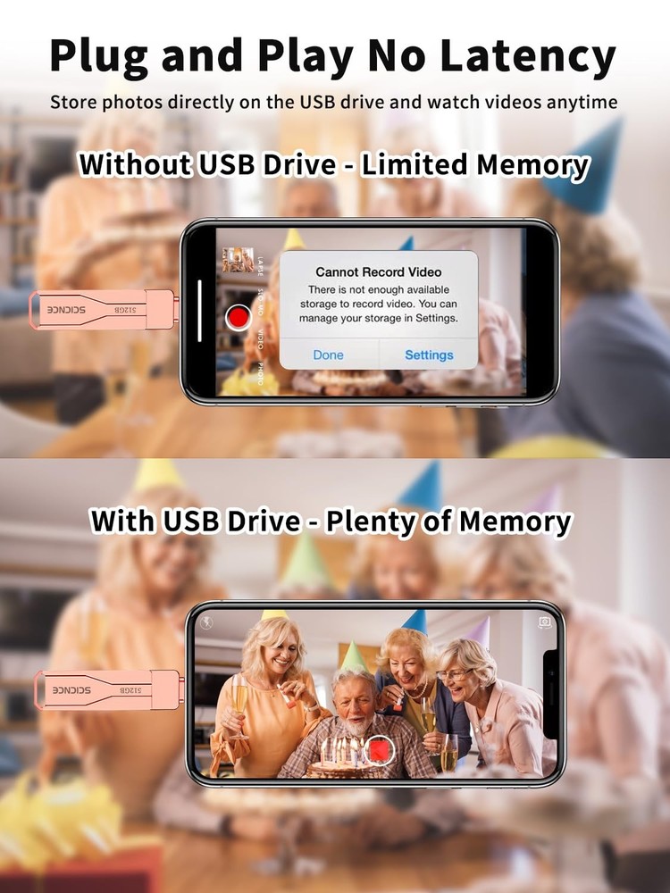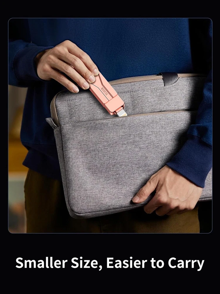 Do you want to make your Phone more convenient? Are you tired of your Phone running out of memory? Do you want to keep enough Phone memory during your trip? Plug and Play, No Application Required! Never lose important documents, videos, photos again thanks to large and reliable Phone flash drives. Free up iPhone and iPad Memory Space Immediately If your iPhone or iPad has almost used up all the memory space, this iPhone USB storage flash drive can help alleviate 512GB of storage space. Whether you like to shoot short videos or take selfies, our iPhone memory stick are perfect for you. One-Click Backup You can easily backup with one click and manage files at any time. No need of iTunes, manage files, pictures and videos through the mobile app to quickly backup to iPhone flash drive, save the storage space of the mobile phone, and at the same time, operations such as forwarding files on the USB drive can be performed. Plug and Play Share your photos, videos, songs and other files between iPhone picture stick easily. You don't have to pay extra for additional storage, just insert iPhone external storage and enjoy the extra space of your flash drive. High Transfer Speed Smart and upgraded chip with high efficiency and stability. read speed up to 30MB/s and write speed up to 20MB/s. The upgraded chip provides you with more efficient storage experience. How to transfer in iPhone iPad Requires iOS 13 and higher: Simply insert the flash drive into your iPhone iPad, then go to the "Files" app to find "NoName" and move files to your iPad or iPhone as needed. How to transfer in Android Phones Android phones need to support OTG, and flash drives can be found in the “File Manager” of most Android devices. 【Plug and Play, No Application Required, Instantly Increases iPhone and iPad Memory Space】If you almost used up all space on your iPhone or iPad, this photo stick for iPhone helps to expand your memory at full storage with 512GB. And usb memory stick for photos is also a great partner for traveling photographers editing on iPad. Using this memory device for your iPhone, iPad or Computers, no worries with the iPhone storage anymore! 【Multi-Interface USB Stick Device】This iphone photo transfer stick features USB-L/USB-C/USB interfaces (with separate adapters), facilitating easy data transfer between different devices. No longer reliant on data cables, iTunes, or iCloud, you can securely store important files, photos, and other data. Never worry about running out of iPhone storage space again—you can also back up your files to a computer via the USB port for added security, and access and share them anytime. (For iPhone/iPad: System Version Requires iOS 13 or Higher. For Android smartphones: Need to open OTG function) 【High Transfer Speed】Transfer photos, videos, and files in seconds with our USB stick. With a write speed of up to 20 MB/s and a read speed of up to 30 MB/s, our flash drive for iphone have higher performance than conventional usb storage flash drive. Save time and get more done with iPhone photo storage stick. Enjoy the whole relaxing trip with never stuttering or buffering video play on the go. (Tip: No Third-Party Apps Required, Simply insert the flash drive into the iPhone iPad and go to "Files" app) 【Watch Movies, Photos and Play Music Directly From Phone Flash Drive】Store your favorite videos, audios and music on your iPhone's Photo Stick, then seamlessly plug and play on your iPhone or iPad anytime, anywhere. No more need for Internet or WiFi. This iPhone storage device plays videos in many different formats. Pictures stored on the Phone storage device also support different formats. Great way to store all your pictures and videos on an phone external storage device. 【How to transfer in iPhone iPad】Requires iOS 13 and higher: Simply insert the flash drive into your iPhone iPad, then go to the "Files" app to find "NoName" and move files to your iPad or iPhone as needed. 【How to transfer in Android Phones】Android phones need to support OTG, and flash drives can be found in the “File Manager” of most Android devices. 【Reliable After-Sales Service】Experience the convenience of high-quality USB memory stick and enjoy our premium customer service at the same time. For the phone flash drive, if you have any questions, we are willing to provide help. (Note: The phone case may prevent the proper connection between a phone and a usb flash drive, which could result in the phone being unable to recognize the usb flash drive. In this situation, please do not conclude that the usb flash drive cannot be used, remove the phone case and try again) 【Kindly Note】For Flash Media Devices, 1 megabyte = 1 million bytes; 1 gigabyte = 1 billion bytes. Actual useable capacity may vary. Some of the listed capacity is used for formatting and other functions, and thus is not available for data storage. 【Kindly Note】Up to 30MB/s read speed, write speed is lower. Based on internal testing; performance may be lower depending on the host devices and user’s settings and configurations.
