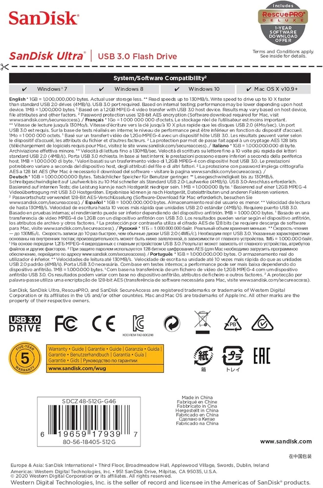 Transfer speeds up to 10x faster than standard USB 2.0 drives (4MB/s); up to 130MB/s read speed; USB 3.0 port required. Based on internal testing; performance may be lower depending upon host device. 1MB=1,000,000 bytes Backward compatible with USB 2.0 Secure file encryption and password protection(2) Step up to high-speed USB 3 0 and transfer your videos photos and files up to ten times faster than standard USB 2 0 drives SanDisk Ultra USB 3 0 Flash Drive takes the wait out of moving sharing or backing up big filesnow you can transfer a full-length movie from your laptop to your flash drive in less than a minute(1) Password protection lets you keep your private files private(2) and still generously share with family and friends And with a sleek sturdy SanDisk Ultra USB 3 0 Flash Drive in your pocket you wont need an Internet connection to access those photos and videos anyplace and anytime you want For more than 25 years SanDisk has been known for quality and reliability all around the world Thats why your flash drive comes with a five-year limited (3) 1GB=1 000 000 000 bytes Actual user storage less Transfer to drive up to 10 times faster than standard USB 2 0 drives (4MB/s) up to 100MB/s read speed USB 3 0 port required Based on internal testing performance may be lower depending upon host device 1MB=1 000 000 bytes (1)Based on 1 2GB MPEG-4 video transfer with USB 3 0 host device Results may vary based on host device file attributes and other factors (2)Password protection uses 128-bit AES encryption and is supported by Windows 7 Windows 8 Windows 10 and macOS v10 9+ (Software download required for Mac visit the official SanDisk website for SecureAccess details) (3)Visit the official SanDisk website for details (4)Registration required terms and conditions apply.