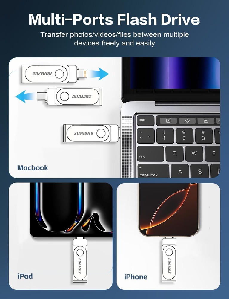 Do you want to make your Phone more convenient? Are you tired of your Phone running out of memory? Do you want to keep enough Phone memory during your trip? Plug and Play, No Application Required! Never lose important documents, videos, photos again thanks to large and reliable Phone flash drives. Free up iPhone and iPad Memory Space Immediately If your iPhone or iPad has almost used up all the memory space, this iPhone USB storage flash drive can help alleviate 512GB of storage space. Whether you like to shoot short videos or take selfies, our iPhone memory stick are perfect for you. One-Click Backup With the phone drive 512GB, easily backup and manage files without relying on iTunes. Use our mobile app to conveniently manage files, contacts, photos, and videos on your phone, and quickly backup to the mini flash drive, saving space on your device. Additionally, share files on the usb thumb drive and store captured videos, photos, or favorite movies directly on the usb memory stick for instant viewing. Plug and Play Share your photos, videos, songs and other files between iPhone picture stick easily. You don't have to pay extra for additional storage, just insert iPhone external storage and enjoy the extra space of your flash drive. High Transfer Speed Smart and upgraded chip with high efficiency and stability. read speed up to 30MB/s and write speed up to 20MB/s. The upgraded chip provides you with more efficient storage experience. How to transfer in iPhone iPad Requires iOS 13 and higher: Simply insert the flash drive into your iPhone iPad, then go to the "Files" app to find "Untitled" and move files to your iPad or iPhone as needed. How to transfer in Android Phones Android phones need to support OTG, and flash drives can be found in the “File Manager” of most Android devices. 【Plug and Play, No Application Required, Instantly Increases iPhone and iPad Memory Space】If you almost used up all space on your iPhone or iPad, this photo stick for iPhone helps to expand your memory at full storage with 512GB. And usb memory stick for photos is also a great partner for traveling photographers editing on iPad. Using this memory device for your iPhone, iPad or Computers, no worries with the iPhone storage anymore! 【Multi-Port USB Drive】The 3 IN 1 phone photo stick with USB-C Port/ USB-L Port/ USB Port (Independent interface), which is more convenient for data transfer between different devices, so as to get rid of the data cable and iTunes and iCloud, let you switch easily storage space. The Phone thumb drive is designed for use with a wide range of devices, Compatibility iPhone 16/15/14/13/12/11/8/7/6S/SE/XR/XS/XS Max/X Series/iPad Air Series/iPad Pro Series. Also support Android smartphones/Computers and other devices with USB-C Ports. (Tip: For iPhone system version requires iOS 13 or higher, For Android smartphones need to open OTG function) 【Watch Movies, Photos and Play Music Directly From Phone Flash Drive】Store your favorite videos, audios and music on your iPhone's Photo Stick, then seamlessly plug and play on your iPhone or iPad anytime, anywhere. No more need for Internet or WiFi. This iPhone storage device plays videos in many different formats.Pictures stored on the Phone storage device also support different formats. Great way to store all your pictures and videos on an phone external storage device. 【High Transfer Speed】Transfer photos, videos, and files in seconds with our USB stick. With a write speed of up to 15 MB/s and a read speed of up to 30 MB/s, our flash drive for iphone have higher performance than conventional usb storage flash drive. Save time and get more done with iphone photo storage stick. Enjoy the whole relaxing trip with never stuttering or buffering video play on the go. (Tip: No Third-Party Apps Required, Simply insert the flash drive into the iPhone iPad and go to "Files" app) 【How to transfer in iPhone iPad】Requires iOS 13 and higher: Simply insert the flash drive into your iPhone iPad, then go to the "Files" app to find "Untitled" and move files to your iPad or iPhone as needed. 【How to transfer in Android Phones】Android phones need to support OTG, and flash drives can be found in the “File Manager” of most Android devices. 【Kindly Note】1) For Flash Media Devices, 1 megabyte = 1 million bytes; 1 gigabyte = 1 billion bytes. Actual useable capacity may vary. Some of the listed capacity is used for formatting and other functions, and thus is not available for data storage. 2) Up to 30MB/s read speed, write speed is lower. Based on internal testing; performance may be lower depending on the host devices and user’s settings and configurations. 【Kindly Note】The phone case may prevent the proper connection between a phone and a usb flash drive, which could result in the phone being unable to recognize the usb flash drive. In this situation, please do not conclude that the usb flash drive cannot be used, remove the phone case and try again. 【Reliable After-Sales Service】Experience the convenience of high-quality USB memory stick and enjoy our premium customer service at the same time. For the phone flash drive, if you have any questions, we are willing to provide help.