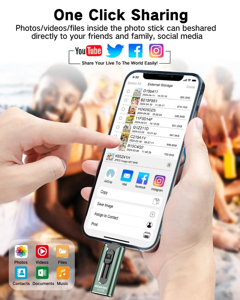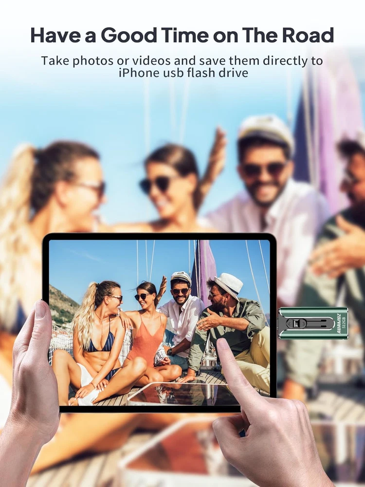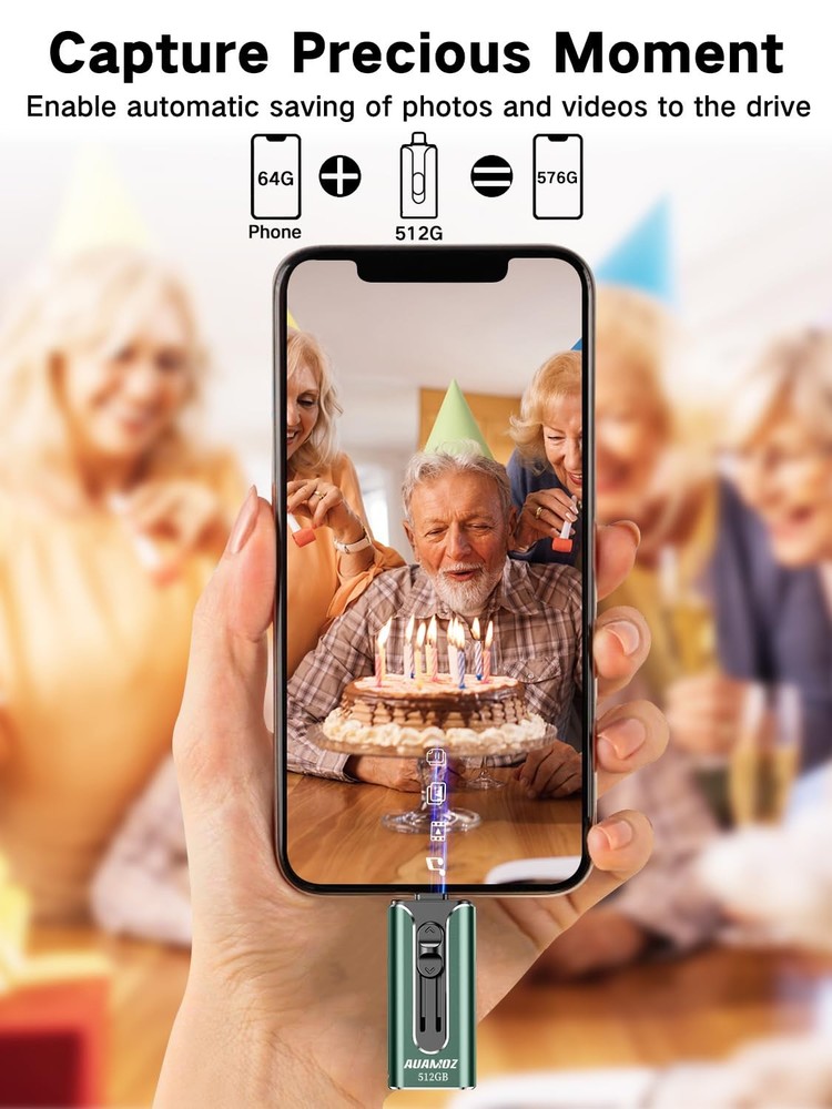 Do you want to make your Phone more convenient? Are you tired of your Phone running out of memory? Do you want to keep enough Phone memory during your trip? Plug and Play, No Application Required! Never lose important documents, videos, photos again thanks to large and reliable Phone flash drives. Free up iPhone and iPad Memory Space Immediately If your iPhone or iPad has almost used up all the memory space, this iPhone USB storage flash drive can help alleviate 512GB of storage space. Whether you like to shoot short videos or take selfies, our iPhone memory stick are perfect for you. One-Click Backup With the phone drive 512GB, easily backup and manage files without relying on iTunes. Use our mobile app to conveniently manage files, contacts, photos, and videos on your phone, and quickly backup to the mini flash drive, saving space on your device. Additionally, share files on the usb thumb drive and store captured videos, photos, or favorite movies directly on the usb memory stick for instant viewing. Plug and Play Share your photos, videos, songs and other files between iPhone picture stick easily. You don't have to pay extra for additional storage, just insert iPhone external storage and enjoy the extra space of your flash drive. High Transfer Speed Smart and upgraded chip with high efficiency and stability. read speed up to 30MB/s and write speed up to 20MB/s. The upgraded chip provides you with more efficient storage experience. How to transfer in iPhone iPad Requires iOS 13 and higher: Simply insert the flash drive into your iPhone iPad, then go to the "Files" app to find "NoName" and move files to your iPad or iPhone as needed. How to transfer in Android Phones Android phones need to support OTG, and flash drives can be found in the “File Manager” of most Android devices. 【Plug and Play, No Application Required, Instantly Increases iPhone and iPad Memory Space】If you almost used up all space on your iPhone or iPad, this photo stick for iPhone helps to expand your memory at full storage with 512GB. And usb memory stick for photos is also a great partner for traveling photographers editing on iPad. Using this memory device for your iPhone, iPad or Computers, no worries with the iPhone storage anymore! 【Universal Compatibility】The phone usb stick has a USB Port/ L Port/Micro USB Port/ USB C (independent adapter) interface, which is convenient for data transmission between different devices and gets rid of the shackles of data cables and iCloud. You can store your favorite videos, photos, movies, and music directly on the memory stick and watch them on your mobile phone at any time. Compatibility iPhone 16/15/14/13/12/11/8/7/6/SE/XR/XS/XS Max/X Series, iPad Air/iPad Pro Series/Android smartphones Series. (Tip: For iPhone/iPad System Version Requires iOS 13 or Higher. For Android smartphones Need to open OTG function) 【High Transfer Speed】Transfer photos, videos, and files in seconds with our USB stick. With a write speed of up to 20 MB/s and a read speed of up to 30 MB/s, our flash drive for iphone have higher performance than conventional usb storage flash drive. Save time and get more done with iphone photo storage stick. Enjoy the whole relaxing trip with never stuttering or buffering video play on the go. (Tip: No Third-Party Apps Required, Simply insert the flash drive into the iPhone iPad and go to "Files" app) 【Watch Movies, Photos and Play Music Directly From Phone Flash Drive】Store your favorite videos, audios and music on your iPhone's Photo Stick, then seamlessly plug and play on your iPhone or iPad anytime, anywhere. No more need for Internet or WiFi. This iPhone storage device plays videos in many different formats. Pictures stored on the Phone storage device also support different formats. Great way to store all your pictures and videos on an phone external storage device. 【How to transfer in iPhone iPad】Requires iOS 13 and higher: Simply insert the flash drive into your iPhone iPad, then go to the "Files" app to find "NoName" and move files to your iPad or iPhone as needed. 【How to transfer in Android Phones】Android phones need to support OTG, and flash drives can be found in the “File Manager” of most Android devices. 【Kindly Note】The phone case may prevent the proper connection between a phone and a USB flash drive, which could result in the phone being unable to recognize the USB flash drive. In this situation, please do not conclude that the usb flash drive cannot be used, remove the phone case and try again. 【Kindly Note】Up to 30MB/s read speed, write speed is lower. Based on internal testing; performance may be lower depending on the host devices and user’s settings and configurations. 【Kindly Note】For Flash Media Devices, 1 megabyte = 1 million bytes; 1 gigabyte = 1 billion bytes. Actual useable capacity may vary. Some of the listed capacity is used for formatting and other functions, and thus is not available for data storage.