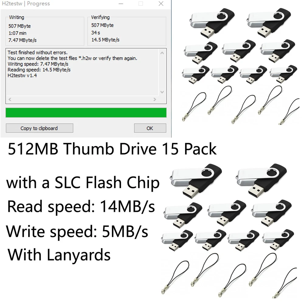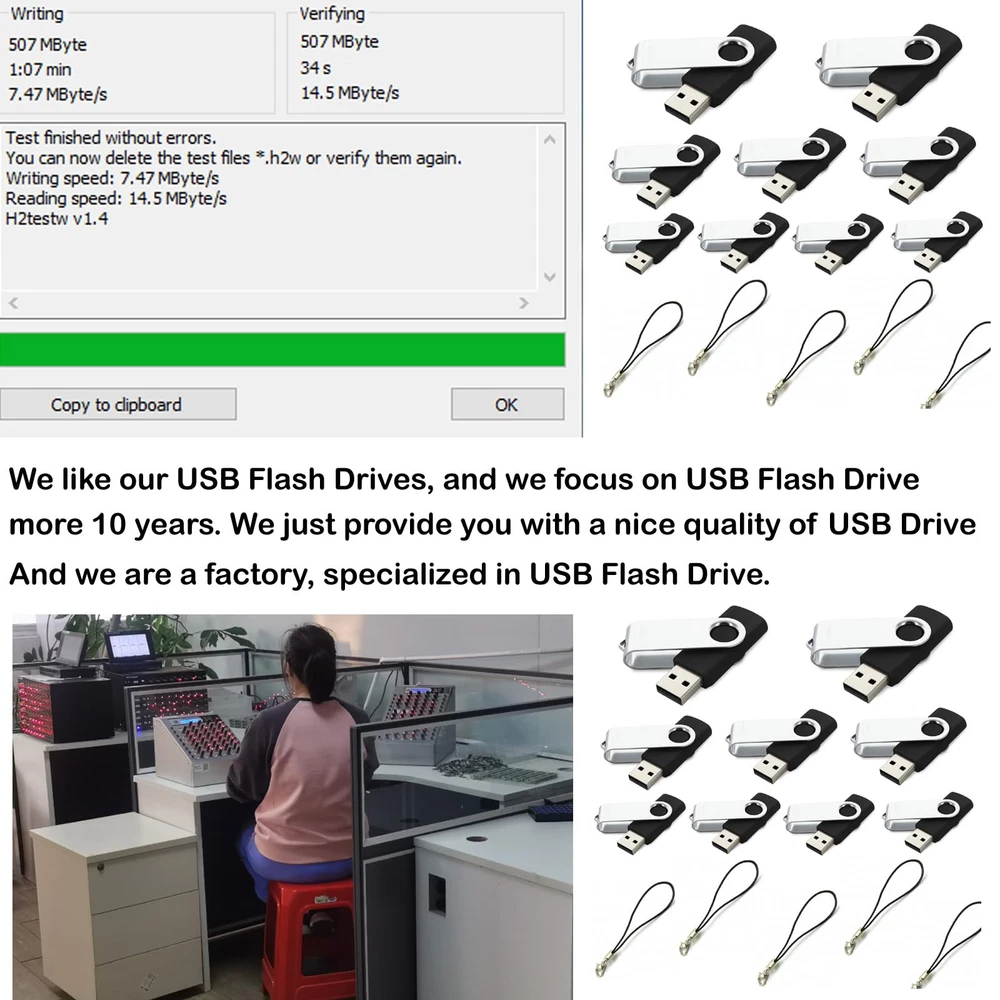 [1] No.: U840 [2] Capacity: 512MB (SLC flash chip) [3] Colour: Black [4] Material: Metal and ABS [5] Size: 2.32*0.75*0.39 Inches [6] Quantity: 15 Pieces [7] Write speed: 5MB/s [8] Read speed: 14MB/s [9] Package: One white paper box [10] Accessory: 15 lanyards [11] Warranty: one year [12] Support windows7 / 8 / 10 / Vista / XP / 2000 / ME / NT Linux and Mac OS [13] All USB flash drives passed H2/H5 software test 512MB USB flash drive 15 Pack: Read speed: 14MB/s, Write speed: 5MB/s, with a SLC flash chip. The real capacity is about 490MB. And there is FAT format. 512MB pen drive 15 Pack Plug then starts to transfer. Operating temperature range of 512MB thumb drive 15 Pack USB2.0 flash drive 512MB 15 Pack are between -8℃ and 42℃. 512MB thumb drives 15 Pack USB memory stick. The size is 2.32*0.75*0.39 inches, mini USB drives are easy to carry. Twister USB flash drives 15 Pack 512MB, 512MB USB stick, with Metal clip and plastic housing body with 360° rotated design. We are specialized in USB flash drive more 10 years. We focus on German market on B2B. We also can do customized logo for you.