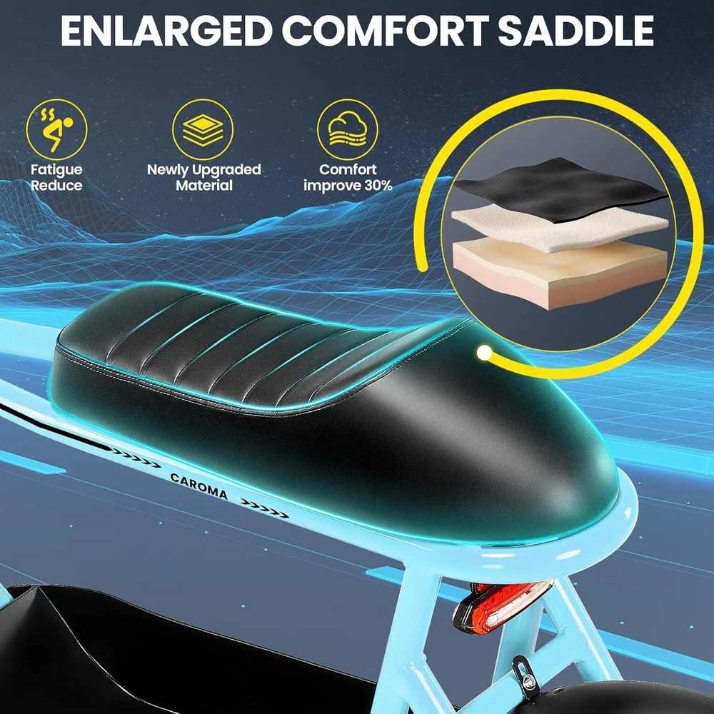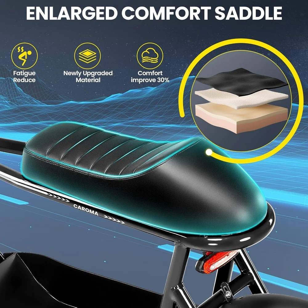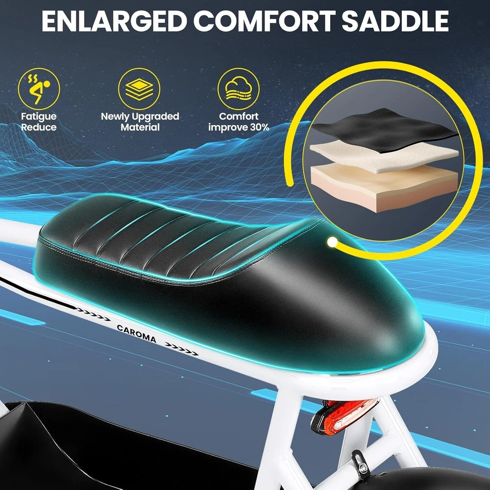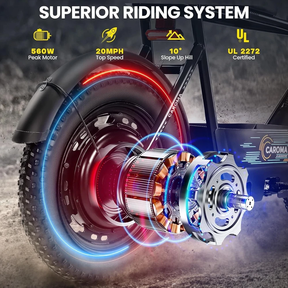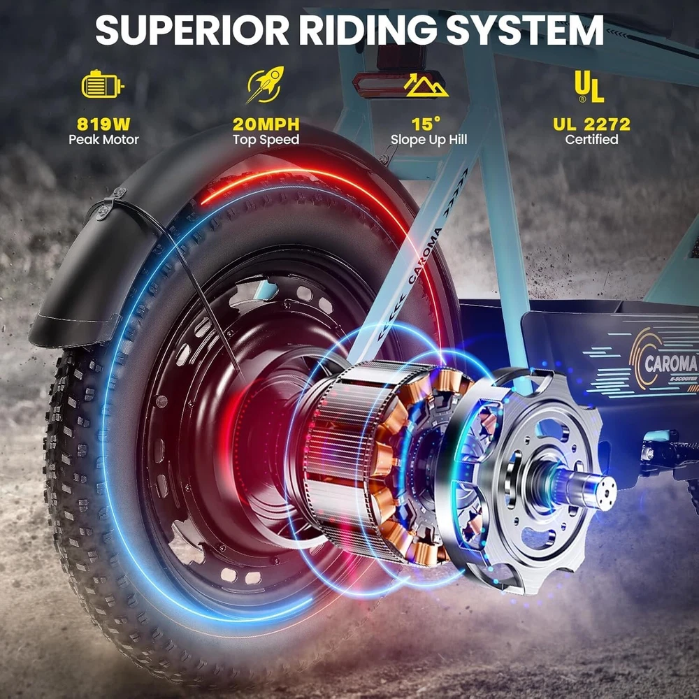 Product Description About this item ใ๐๐ฃ๐๐ฆ๐ช๐ ๐๐ฉ๐ฎ๐ก๐ & ๐๐ฅ๐ค๐ง๐ฉ๐จ ๐๐๐จ๐๐ค๐ฃใ:This ๐บ๐ผ๐๐ผ๐ฟ๐ฐ๐๐ฐ๐น๐ฒ ๐๐๐๐น๐ฒ electric scooter for adults features a ๐๐ป๐ถ๐พ๐๐ฒ ๐ฎ๐ป๐ฑ ๐ถ๐บ๐ฎ๐ด๐ถ๐ป๐ฎ๐๐ถ๐๐ฒ ๐ฑ๐ฒ๐๐ถ๐ด๐ป. The saddle is both delicate and soft, with a strengthened pole that creates a thrilling sports adventure experience. You'll turn heads with this bike and be the envy of others. Join us and try out the latest fashion trend. ใ๐ผ๐ก๐ก-๐๐๐ง๐ง๐๐๐ฃ ๐๐๐จ๐ฉ๐๐ง๐ฎใ:๐ญ๐ฒ*๐ฏ" ๐ณ๐ฎ๐ ๐๐ถ๐ฟ๐ฒ๐ provide a larger contact area, giving the scooter better stability and grip on a variety of surfaces. Fat tires better absorb vibrations on the road, providing a smooth and comfortable ride even on uneven roads,๐ฟ๐ฒ๐ฑ๐๐ฐ๐ถ๐ป๐ด ๐๐ต๐ฒ ๐ฟ๐ถ๐๐ธ of a blowout when driving over sharp objects, more suitable for extreme or irregular terrain, such as off-road mountain or beach, expanding the range of riding environments. ใ๐๐๐๐ ๐ญ๐ฎ๐ฌ๐ฌ๐ช ๐๐ค๐ฉ๐ค๐ง & ๐ฑ๐ฌ๐ฌ๐๐ ๐ฝ๐๐ฉ๐ฉ๐๐ง๐ฎใ: ๐๐๐ฅ๐ข๐ ๐ ๐๐ฏ ๐ฒ๐น๐ฒ๐ฐ๐๐ฟ๐ถ๐ฐ ๐๐ฐ๐ผ๐ผ๐๐ฒ๐ฟ with seat is equipped with a ๐ณ๐ฑ๐ฌ๐ช(๐ฃ๐ฒ๐ฎ๐ธ ๐ญ๐ฎ๐ฌ๐ฌ๐ช) brushless hub motor and ๐ฑ๐ฌ๐ฌ๐ช๐ต long lasting battery, so that it can reach ๐ฎ๐ฌ๐ ๐ฃ๐ top speed and travel up to ๐ฏ๐ฌ ๐บ๐ถ๐น๐ฒ๐ on a single charge. The E sooter can run smoothly even on a ๐ฎ๐ฌยฐ road. ใ๐๐๐ง๐๐๐๐ฉ ๐๐ก๐๐๐ฉ๐ง๐๐ ๐ฝ๐๐ ๐ ๐๐ค๐ง ๐ผ๐๐ช๐ก๐ฉ๐จ ๐๐ฃ๐๐๐ง $๐ฑ๐ญ๐ฌใ:๐๐๐ฅ๐ข๐ ๐ ๐๐ฏ ๐ฒ๐น๐ฒ๐ฐ๐๐ฟ๐ถ๐ฐ ๐๐ฐ๐ผ๐ผ๐๐ฒ๐ฟ is a standout choice with its unbeatable price/performance ratio. Not only does it excel in its price range, but its unique design ensuring you turn heads wherever you go. Electric scooter arrives ๐ด๐ฑ% ๐ฝ๐ฟ๐ฒ-๐ฎ๐๐๐ฒ๐บ๐ฏ๐น๐ฒ๐ฑ. Simply install the front wheel, handlebars, pedal and basket, you're ready to hit the road with ease. ใ๐๐ง๐ช๐จ๐ฉ๐๐ ๐๐ช๐๐ก๐๐ฉ๐ฎ ๐ผ๐จ๐จ๐ช๐ง๐๐ฃ๐๐ใ:The caroma electric scooter is UL 2272 certified. We provide a ๐ญ๐ฎ-๐บ๐ผ๐ป๐๐ต ๐๐ฎ๐ฟ๐ฟ๐ฎ๐ป๐๐ for this electric scooter. If you encounter problems when using the product, please refer to the manual. If the problem cannot be solved, feel free to contact our customer service. ใ๐๐พ๐ฟ ๐ฟ๐๐จ๐ฅ๐ก๐๐ฎ & ๐๐๐๐ ๐ฉ๐ค ๐๐๐๐ใ:The LCD monitor shows the ๐ฏ๐ฎ๐๐๐ฒ๐ฟ๐ ๐น๐ฒ๐๐ฒ๐น of the e scooter, so you can get a clear picture of your riding. The effective front and rear disc brake on the e-scooters provide excellent stability and control. Complete with a ๐ฐ๐ผ๐ผ๐น ๐ต๐ฒ๐ฎ๐ฑ๐น๐ถ๐ด๐ต๐ for optimal safety during night rides. The high-brightness headlight and rear brake light ๐ธ๐ฒ๐ฒ๐ฝ ๐๐ผ๐๐ฟ ๐ฟ๐ถ๐ฑ๐ถ๐ป๐ด ๐๐ฎ๐ณ๐ฒ at night.