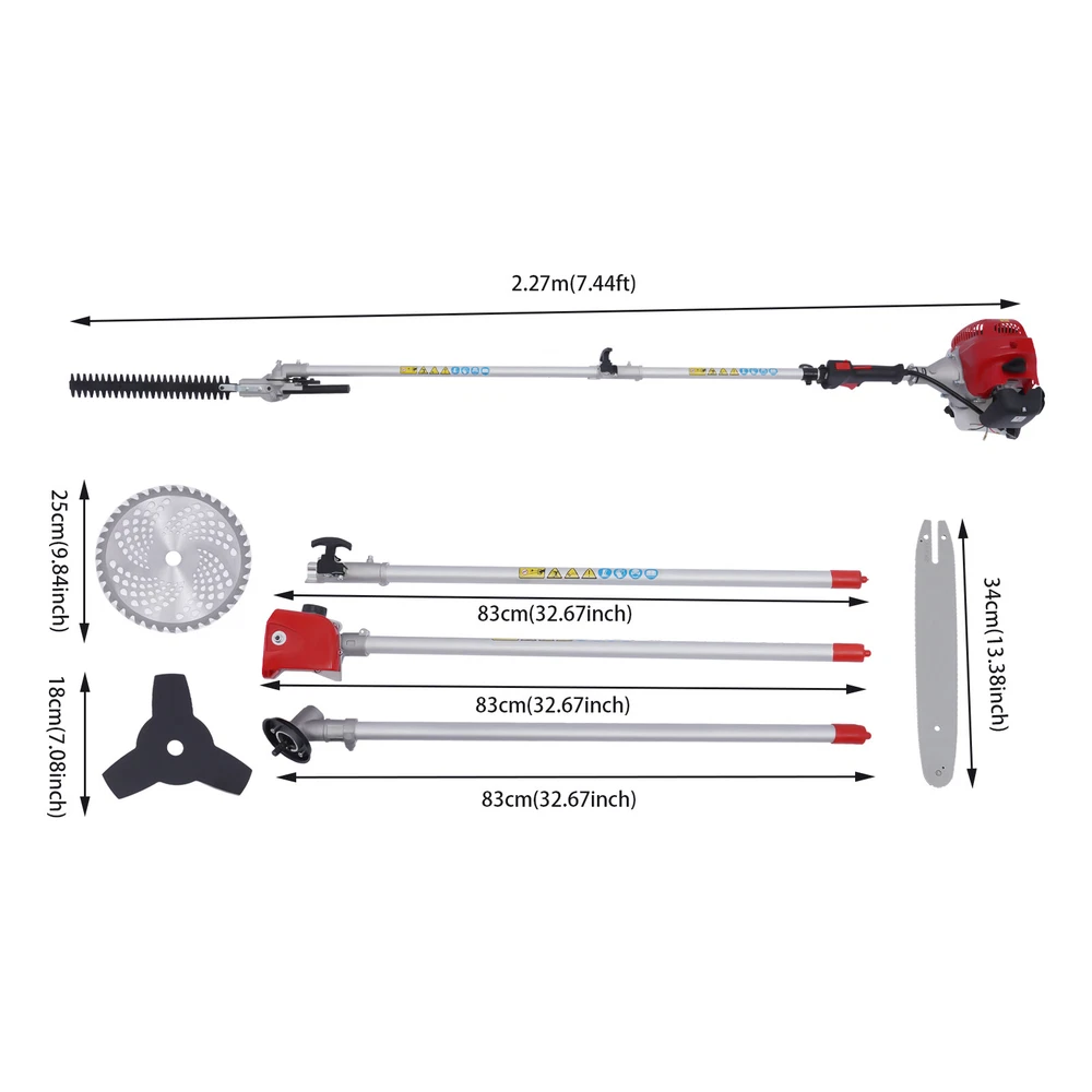 Package Included 1* 2-stroke Motor 1* Rod 1* Extension Rod 1* High Pruning Shear 1* High Branch Saw 1* Working Rod 1* Guide Plate 1* Guide Plate Guard 1* Round Blade 1* 3-tooth Blade 1* English Manual Other Accessories for Assembly 51.7CC 2-Stroke Gas Powered Pole Saw Brush Cutter Gas Tree Weed Hedge Trimmer Description If you have a garden maintenance plan and need a handy and effective tool to keep your garden in tip-top shape, this product is your best choice. The 2-stroke lawn mower is made of high-quality plastic and aluminum. The motor has a high power of 1.4kw and a speed of 6500rpm to achieve efficient working, which can save you a lot of time and energy. Package Included 1* 2-stroke Motor 1* Rod 1* Extension Rod 1* High Pruning Shear 1* High Branch Saw 1* Working Rod 1* Guide Plate 1* Guide Plate Guard 1* Round Blade 1* 3-tooth Blade 1* English Manual Other Accessories for Assembly Key Features High-quality Materials: This product is made of high-quality plastic and aluminum, which is strong, durable, and not easy to deform. High Efficiency: The 2-stroke motor has a high power of 1.4kw and a speed of 6500rpm to achieve efficient working, which can save you a lot of time and energy. 4-in-1 Function: Thanks to the quick fasteners, this product can be easily converted from lawn edge cutter to brush cutter, hedge trimmer, or chainsaw to meet your different needs and can be stowed away to save space. Extension Function: The extension bar can extend the product to a fabulous height to help you trim high branches and grass in the distance. Large Cutting Width: It has a durable metal blade with a maximum cutting width of 25cm/9.84inch, which can meet your daily cutting needs. Easy to Clean: Its surface is smooth and each part of this product is detachable, making it easy to clean. Large Fuel Tank Capacity: The capacity of the fuel tank is 1.2L/0.3gal, which is large enough for you to use and can avoid adding oil and petrol frequently. Complete Kit: This product includes several different working rods and complete working accessories, which can meet your different use needs as well as be more convenient and safe to use. Details Heat Dissipation Holes: There are heat dissipation holes on the top of the product, which can dissipate heat in time and prolong the service life of this product. Brush Cutter: The practical brush cutter is ideal for the precise cutting of hard-to-reach grass surfaces, where the use of a lawn mower is no longer or only partially suitable. Grass edges on walls, stairs, or fences are no longer obstacles and can be easily processed. Handle: This item has an ergonomic handle to facilitate your grip, which is very labor-saving and a very thoughtful design. Application It is suitable for cutting and sawing lawn edges, lawns, weeds, high hedges, and thick branches in gardens, parks, yards, etc. Specification Model: CG520 Color: Red, White, Black Material: Plastic, Aluminum Type: 2-Stroke Style: Modern Power: 1.4kw Speed: 6500rpm Displacement: 51.7cc Oil Petrol Mixing Ratio: 1: 25 Fuel Tank Capacity: 1.2L/0.3gal Net Weight: 16.5kg/36.38lbs Gross Weight: 17.5kg/38.58lbs Package Size: 99.5*31.5*21.5cm/39*12*8inch Product Length with Rod: 2.27m/7.44ft Extension Rod Length: 83cm/32.67inch High Branch Saw Length: 83cm/32.67inch Working Rod Length: 83cm/32.67inch Round Blade Diameter(Max Cutting Width): 25cm/9.84inch Guide Plate Length: 34cm/13.38inch Motor Size: 20*30*30cm/7.87*11.81*11.81inch Notes Please read the manual completely before installation and use, and pay particular attention to the safety instructions included. Please allow the slight color difference caused by the shooting light and 1-3cm error due to manual measurement, and make sure you do not mind before ordering. Payment Delivery details Terms of sales About us Contact us Payment We accept ebay payment 。 Fees such as import duties, taxes are not included in the item price or shipping costs. These charges are the buyer's responsibility. Delivery details Shipping: 2-9 working days to: USA Terms of sales We maintain high standards of excellence and strive for hundred percent customer satisfaction. Feedback is very important to us. We hope that you contact us immediately before you give neutral or negative feedback, so that we can address your concerns. It is impossible to address issues if we do not know about them! About us Your satis faction is our ultimate goal. We work hard to earn your trust and future business. Our certified technicians have tested each item before shipping. The unit comes with 1 year limited warranty on all manufacturing defects. a) If you receive a defective item, you may return it or ask for a discount. Please contact us within 14 days after you receive the package. b) What you returned must be intact and in its original packaging as re? u. Customer is responsible for shipping costs of the returned item. c) We will cover the cost of shipping back t with the shipping rate indicated in the registration page. We will send you a new unit or refund the full payment you paid. Thank you. Contact us Business Hour Business Hour: Monday To Friday: 8:30 AM to 5:00 PM (Beijing China time) Due to time zones, our reply to your questions may not be immediately. But within above working time, we will reply your email within 24 hours. If it's non-workdays, please kindly be patient and wait till Monday. Please contact us with ebay message. Please feel free to contact us if you have any questions. Monday To Friday: 8:30 AM to 5:00 PM (Beijing China time) Due to time zones, our reply to your questions may not be immediately. But within above working time, we will reply your email within 24 hours. If it's non-workdays, please kindly be patient and wait till Monday. Please contact us with ebay message. Please feel free to contact us if you have any questions. Feature 3 stable performance,reliable quality * Feature *1 Fast shipping *Feature-2* Easy Operation *Feature-*1 Convenient Use Assembly Required Ye