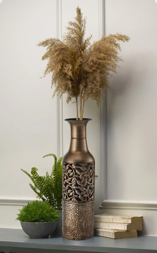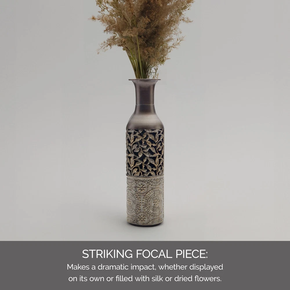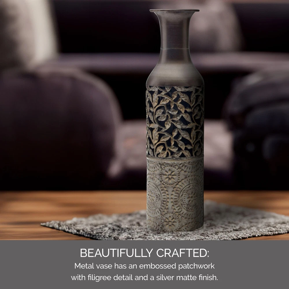 Timeless style meets a modern touch with this Silver embossed decorative vase. Beautifully crafted of metal, this vase features a patchwork embossment with filagree detail. This vase looks great styled alone and when displaying your favorite dried or artificial flowers. For decorative use only; vase should not be used with water. Measures 4.5x4.5x17 inches. INTRIGUING FINISH: This Silver vase features an elegant patchwork embossment with filagree detail DISTINCTIVE DISPLAY PIECE: Use this 17-inch vase for your favorite dried or faux blooms with casual elegance. USE AND CARE: Wipe clean with soft damp cloth, not for use with real flowers. Does not hold water. MEASURES: 4.5x4.5x17 inches METAL: Made of Metal