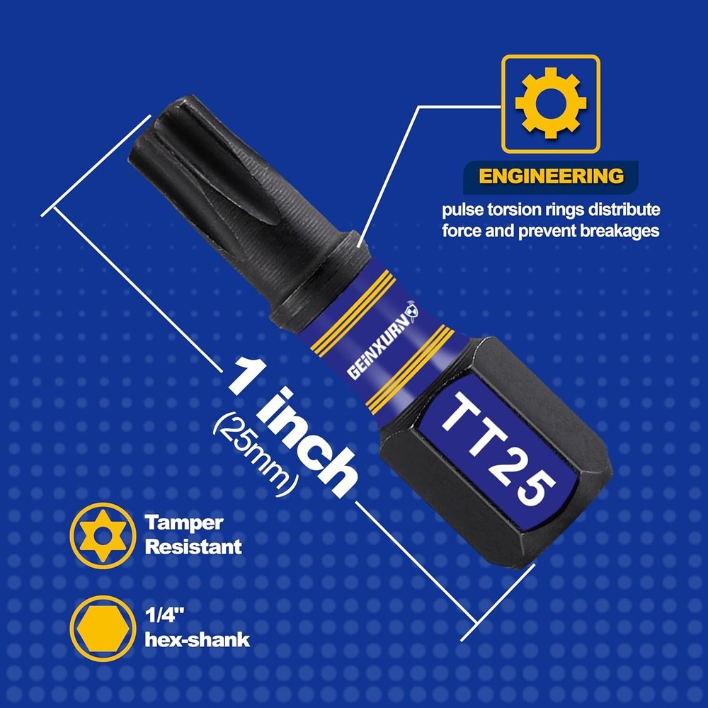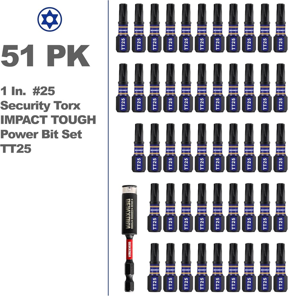 51 Pieces Security T25 Impact Magnetic Screwdriver Bit Set, 1 In. #25 Torx Head Insert Bit Set, S2 Alloy Steel Hollow Star Bit Set with 1 Pcs Impact Bit Holder About this item 【Impact Tough Star Bits】50 Pieces 1 inches #25 Torx Head bits and 1 pieces Magnetic impact bit holder, Impact Shock Absorbent Zone stands up to punishment from high-torque impact driver 【Strong Magnetic Bit Set】Strong magnetic to pick up and hold screws easily with no slipping or stripping S2 Alloy Steel: it owns the features of high hardness and good toughness and resistance through strictly heat treatment, durable and suitable for any industrial use 【Precision Star Tips Head】 Precision-engineered bit tips, deliver a better fit and less cam-out, each edge can accurately lock the screw, stabilizes without slipping, and improves work efficiency. Avoid damaging the screw and screwdriver head Wide Range of Uses: Made to fit 1/4 In. hex impact drivers drill screw bit set is not only work with impact driver, but also magnetic screwdriver bit perfect for any regular drill, electric and hand screwdrivers and more