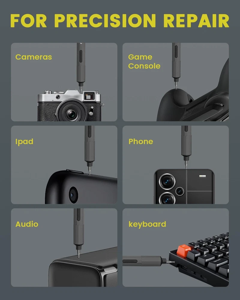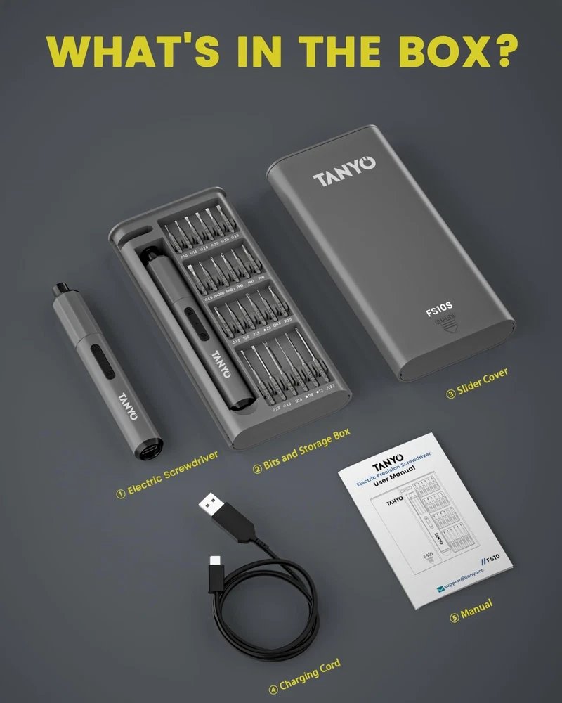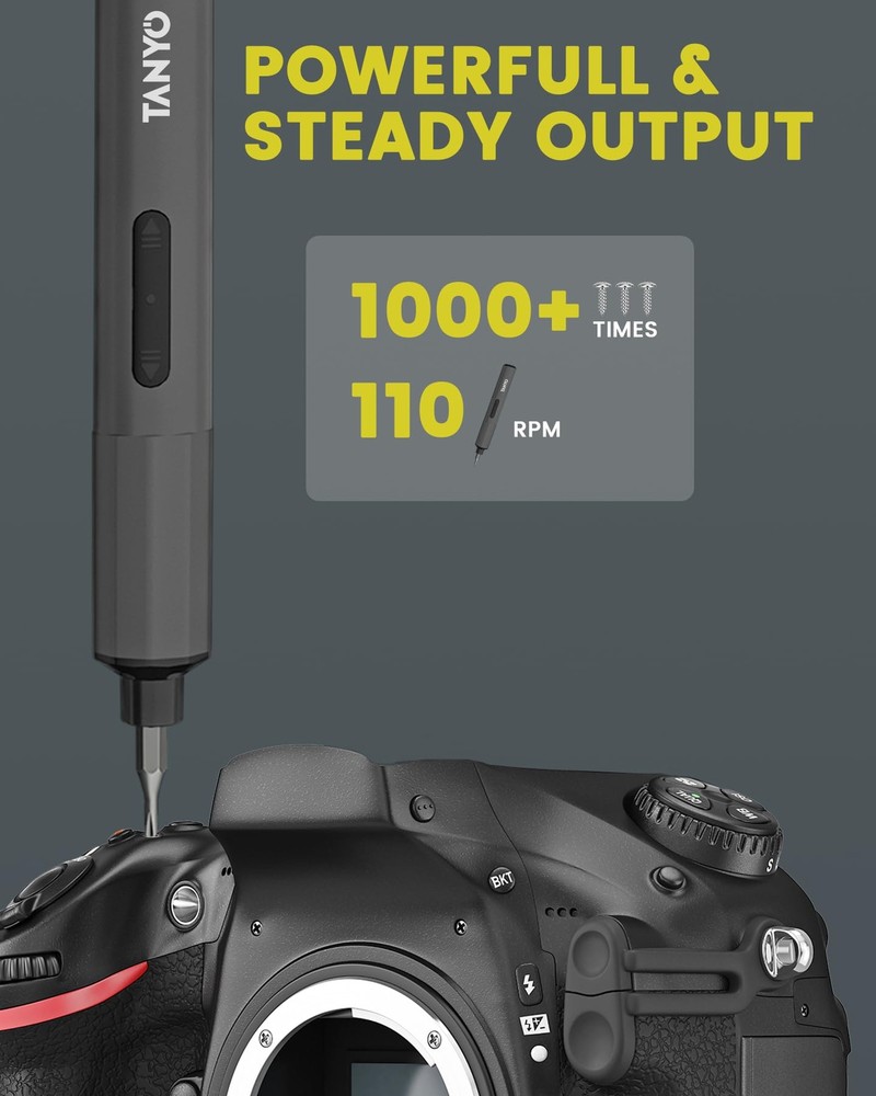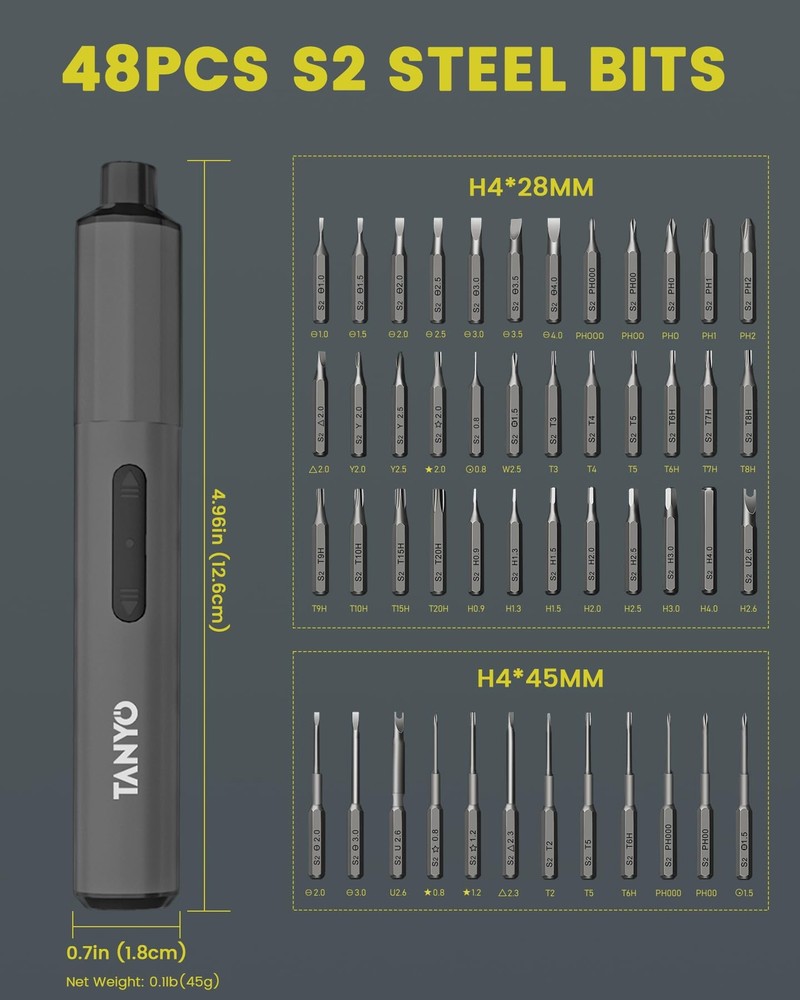 SMALL BUT POWERFUL: You can master two torques with mini electric screwdriver, 0.3 N-m in electric mode and up to 3.5 N-m in manual mode. The precision cordless screwdriver delivers a consistent torque output for all of your needs, including PCs, computers, laptops, mobile phones, Macbooks, RC cars, drones, keyboards, PS4s, PS5s, and other electronic devices. STRONG CONTROL: S2 hardened steel ensures long life and safety, and all 48 bits of the electric screwdriver are 60 HRC hardened for rock-solid durability. Quality tools for quality work! The bits of the power screwdriver orderly in a place every time you open and close the housing, box with magnetised area for easy handling and adaptation to precision tasks. LARGE CAPACITY, MULTIPLE SCREWS: Built-in 400mAh rechargeable lithium battery, can screw more than 1000 screws in one charge. When do you need to charge it? Just plug it into the Type-C port to start charging. The small screwdriver is equipped with a powerful motor with a no-load speed of 120 RPM, which provides a more stable load capacity and saves you time and energy. FULL VISIBILITY: With a convenient forward/reverse switch, it's easy to switch between screwing in and screwing out. The built-in 4 LEDs illuminate poorly lit corners, perfect for assembling computers and small tech devices. The lights automatically come on when you use the electric screwdriver and turn off when you stop working for 10S. DIY DREAM KIT: Unleash your DIY potential with this screwdriver kit. 1 x Rechargeable Screwdriver, 1 x Set of 48 Bits, 1 x Storage Case, 1 x USB Type-C Charging Cable, 1 x User Manual.