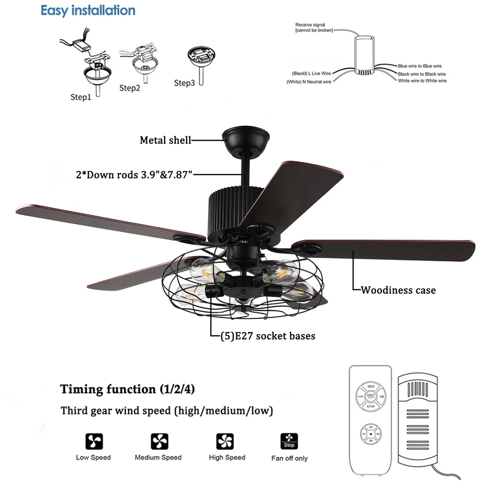 52'' Farmhouse Ceiling Fan Lamp Industrial Rustic Cage Metal LED Light W/ Remote 52'' Farmhouse Ceiling Fan Lamp Industrial Rustic Cage Metal LED Light W/ Remote Product description Specification: Name: Ceiling Fans with Lights Type: Retro Industrial Size: 52 Inch Material: Metal Cage Blade Material: wood leaves Light Kit: E27 light bulbs *5 (not included) Motor:153 high-quiet motor, 110V Control Method:remote control (included) Downrod Length: 2 downrod of3.93 and 7.87inch (included) Wind Speed: 3 (high, medium, low), Maximum Wind 5203CFM Applicable Place: living room/ bedroom /office and restaurant Installation Instruction: ①For your safety, Please turn off the power before installation ② Please check parts against the packing list to see if the accessories are available. ③We provide install instructions for you. please referred to install manual or have a professional electrician. If need any help, please contact us. What you get: Retractable ceiling fan x 1 Screws sets x 1 Down rods x 2 (10CM & 20CM) Remote control x 1 Instruction Manual x 1 Modern Fan Light Chandelier: 52 inches when the fan is extended, Includes two lower bars, one for 3.9 inches and the other for 7.8 inches, you can choose one to install 【Ceiling Fan Light Source Type】Need 5 * E27 Screw (Edison bulb / LED / CFL / Incandescent),Recommended 20-60W,without light bulb. 【3 Speed Remote 】The ceiling fan provides 3 fan speeds (high/medium/low) ;operate fan speed and lights by remote control with timing function. 【Reversible Blade 】5 Reversible Wood Blade,Cooling down air temperature in summer and Help air flow in winter 【Quiet, Durable Motor】Motor made from copper delivers powerful air movement and quiet performance,with heat sink hole,it can reduce the internal temperature of the host,extend the life of motor Modern Fan Light Chandelier: 52 inches when the fan is extended, Includes two lower bars, one for 3.9 inches and the other for 7.8 inches, you can choose one to install Welcome to chengdukangten-4 Thank you for your support! If you have any questions, please feel free to contact us!!! Payment Delivery details Terms of sales About us Contact us Payment We accept ebay payment 。 Fees such as import duties, taxes are not included in the item price or shipping costs. These charges are the buyer's responsibility. Delivery details Shipping: 2-9 working days to: USA Terms of sales We maintain high standards of excellence and strive for hundred percent customer satisfaction. Feedback is very important to us. We hope that you contact us immediately before you give neutral or negative feedback, so that we can address your concerns. It is impossible to address issues if we do not know about them! About us Your satis faction is our ultimate goal. We work hard to earn your trust and future business. Our certified technicians have tested each item before shipping. The unit comes with 1 year limited warranty on all manufacturing defects. a) If you receive a defective item, you may return it or ask for a discount. Please contact us within 14 days after you receive the package. b) What you returned must be intact and in its original packaging as re? u. Customer is responsible for shipping costs of the returned item. c) We will cover the cost of shipping back t with the shipping rate indicated in the registration page. We will send you a new unit or refund the full payment you paid. Thank you. Contact us Business Hour Business Hour: Monday To Friday: 8:30 AM to 5:00 PM (Beijing China time) Due to time zones, our reply to your questions may not be immediately. But within above working time, we will reply your email within 24 hours. If it's non-workdays, please kindly be patient and wait till Monday. Please contact us with ebay message. Please feel free to contact us if you have any questions. Monday To Friday: 8:30 AM to 5:00 PM (Beijing China time) Due to time zones, our reply to your questions may not be immediately. But within above working time, we will reply your email within 24 hours. If it's non-workdays, please kindly be patient and wait till Monday. Please contact us with ebay message. Please feel free to contact us if you have any questions. Feature 1 Compact Design,Unique Appearance,high reliability * Feature * Nice and Practical, High Quality Packaging Features: Fast shipping from US Warehouse Feature 3 Nice and Practical Feature 4 High Quality Packaging 🔥Feature🔥 high quality material ★Features★ 🔥Good Stability🔥Reliable Quality🔥High Performance🔥 1.Feature High-quality Service If you have any question, please contact us! Feature * Fast Shipping Country/Region of Manufacture Unknown UPC Does not apply Mounting Ceiling Mounted Type Ceiling Fan Sensor Type Light Power Source Corded Assembly Required Yes LED String/Strip Type / Shipping Note Cannot ship to Puerto Rico & Hawaii Color Brown Item location: CA /NJ /Austell Motor 153 high-quiet motor, 110V Voltage 110V Light Source LED Model Ceiling fan Style Traditional Material Wood ISBN Does not apply Fan Width 52" Diameter 52" (1320mm) IP Rating no Features Remote Control Number of Lights 5 Room Bedroom, Dining Room, Living Room Brand Unbranded Number of Blades 5 On Nov 19, 2024 at 22:56:05 PST, seller added the following information: