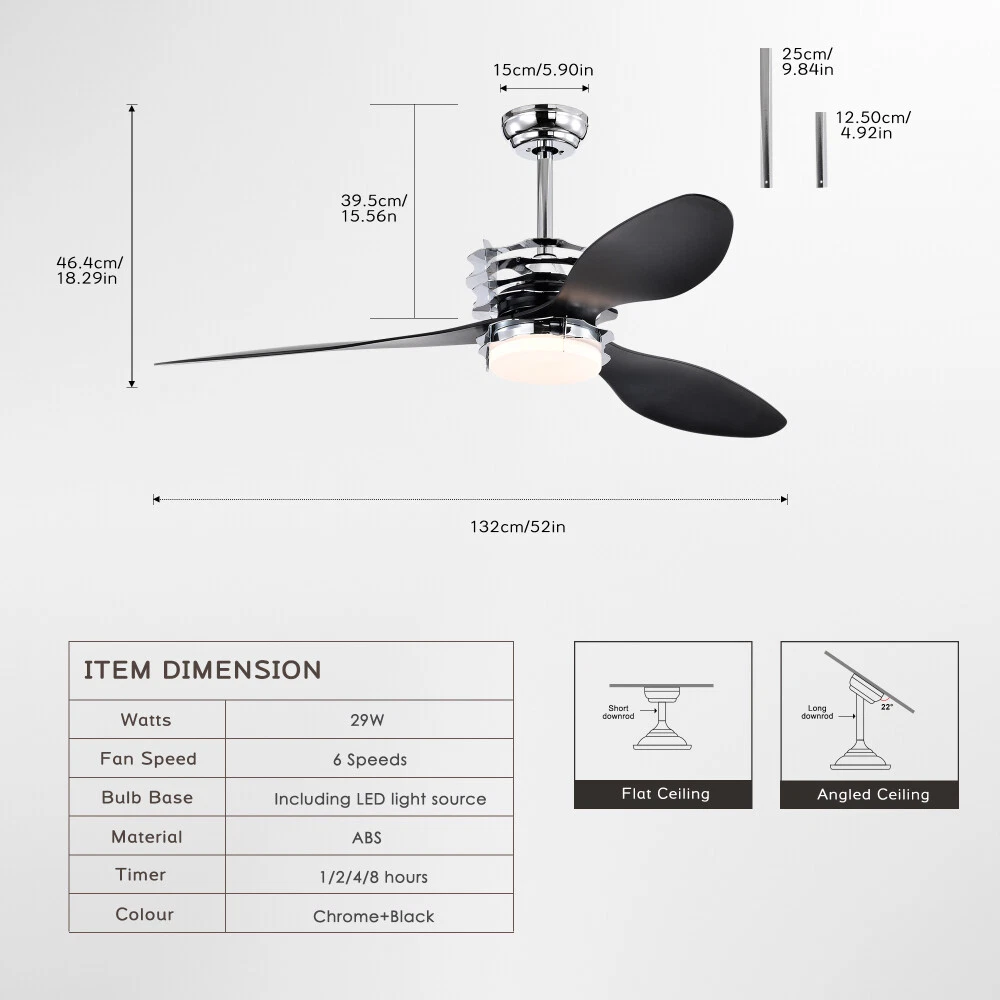 MINIMALIST STYLE: ABS blades, this 52-inch ceiling fan offers an ideal blend of style and function. Ideal for a modern rustic room decor, this ceiling fan is damp rated for use on covered patios and porches. DURABLE CONSTRUCTION: The elegantly crafted polymer (ABS) blades sweep from the motor housing to form graceful curves, perfectly complementing modern and contemporary decors. 6 SPEEDS DUAL-DIRECTION FAN: A stylish 5 speed remote control is included as standard and offers fan reversing, natural breeze mode, energy-efficient 1, 2, 4 and 8-hour timer. LED LIGHT KIT & DC MOTOR: An integrated LED light source is included (18W, 3000K/4500K/6000K). You can use the fan with or without the light. The fan features an energy-efficient DC motor for cost efficiency savings and has convenient wall holder for remote storage. They save up to 65% more efficient than traditional AC fa EASY INSTALLATION: With a 52-inch blade span, this ceiling fan is perfect for circulating the air in a bedroom or home office. 4.9" and 9.8" downrod included. Compatible with sloped ceilings up to 15 degrees. Designed for use in damp locations only.