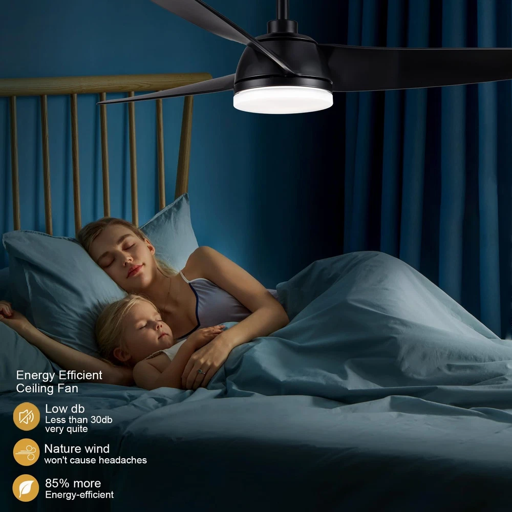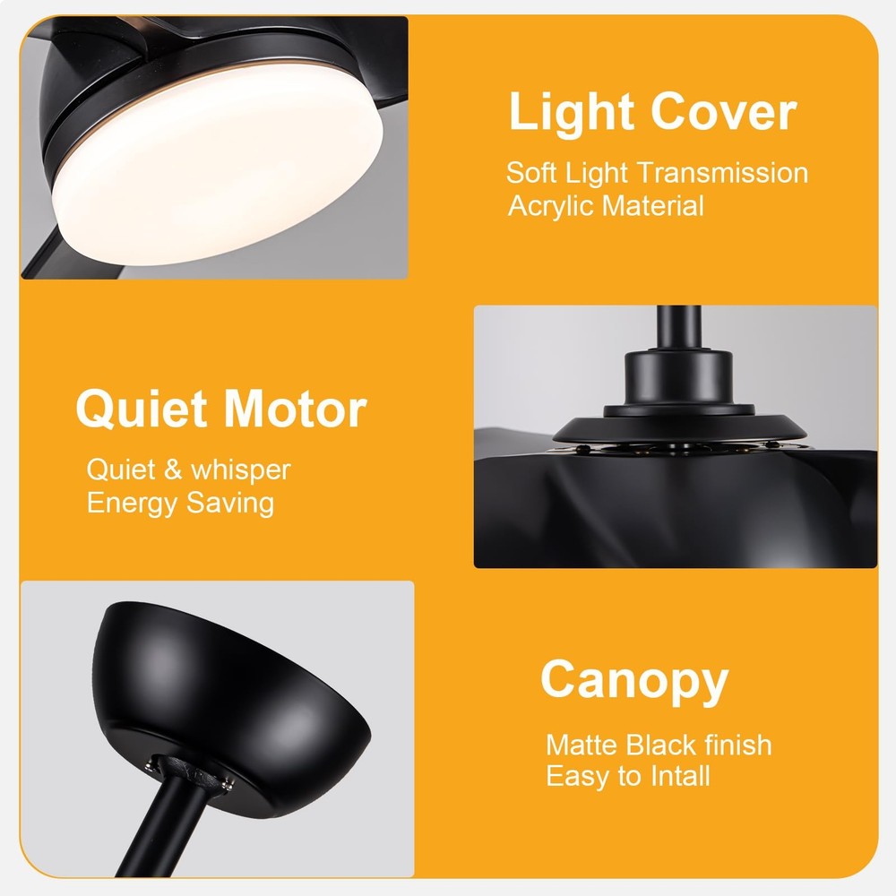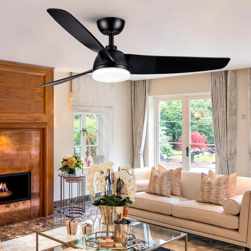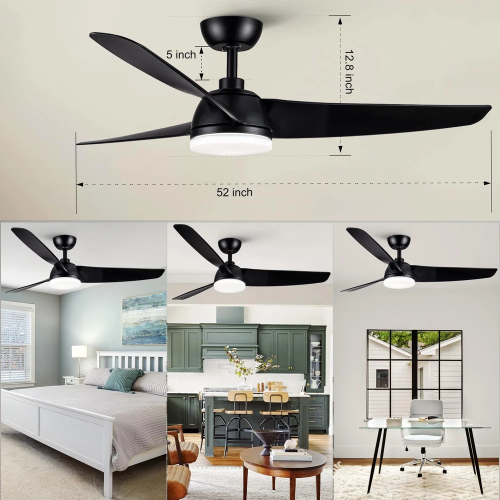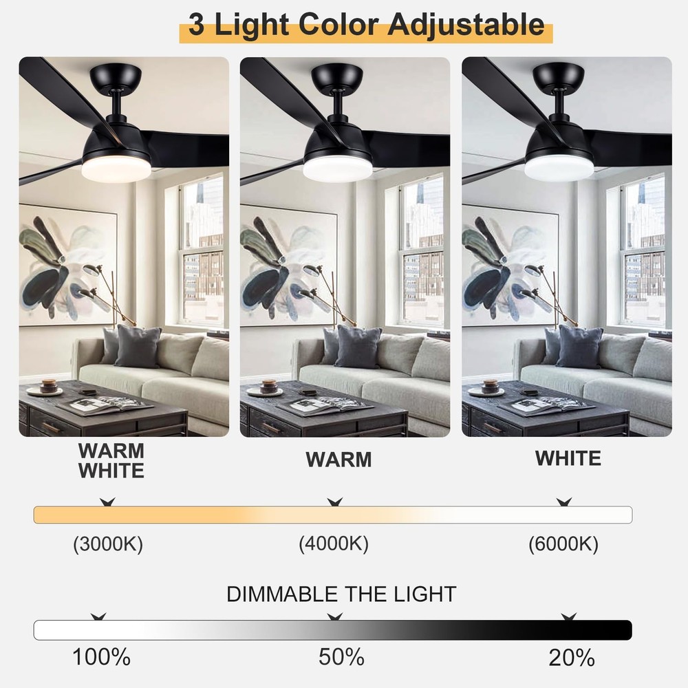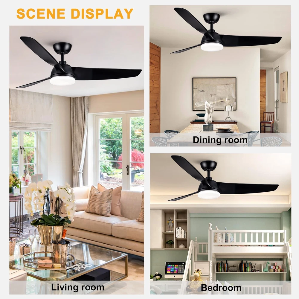 52 Inch Ceiling Fan with Light and Remote Control,6 speed adjustable remote control,3 color Dimmable LED,1/3/6 Hours Timer,Reversible DC motor, Black Modern Design For Living Room Bedroom Kids Room Dining Room Warehouse Patio 52 inch Ceiling Fan with Light and Remote Control,this Minimalist Modern Ceiling Fan is pretty matched with modern home decoration.Comes with both Matte Black Blades;Its medium size matches with most of home scenarios.This low profile ceiling fan makes your home more comfortable,moves more fresh air to your home,brings you bright environment Ceiling fan with LED Light and DC motor, 24W LED can illuminates all home spaces,3 colors dimmable LED, with Cold to Warm(3000/4000/6000K) / Dim to Bright(20%~100%) adjusting; 6 speeds Quiet DC motor with Reversible Function is suitable for all seasons, Double colored/dual sided blades with high quality CMF. It runs ultra quiet(lower than 30dB),makes all family members can enjoy peace,coolness and fresh air absolutely New Generation Remote Control, attached bracket kit, could be fixed on wall as wall-switch.Comes with richer functionality :Light ON/OFF, supports 3-color temperature + adjustable brightness. Supports adjustable Speed levels: 1-2 Soft,3-4 Natural,5-6 Cooling, and One-click FAN OFF; Control Forward/Reversible dual-mode air circulation for all seasons;1/3/6 Hours Timer for your choice;One-click sleep mode for more convenience Modularity design, makes installation very easy.Packaging with Easy-assemble 3 Blades,plug-in LED light Module and Remote Control Module,DC Motor Kit and User Guide inside.Downrod Ceiling Fan with Low profile design,it could be installed in dining room,living room,bedroom,warehouse,kitchen and all indoor spaces,even outdoor as patio ceiling fans are designed for your home life and beneficial for household expense.Energy-efficient DC Motor makes air circulation(Max to 6000 CFM) in all seasons but less power consumption.LED lighting your home also with low power consumption.ETL certified and listed relying powerful factory provides a wide range of products, also provides professional After Sales Service and support includes return service and spare part supplying for repair