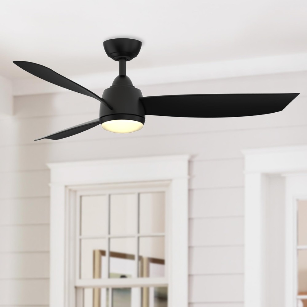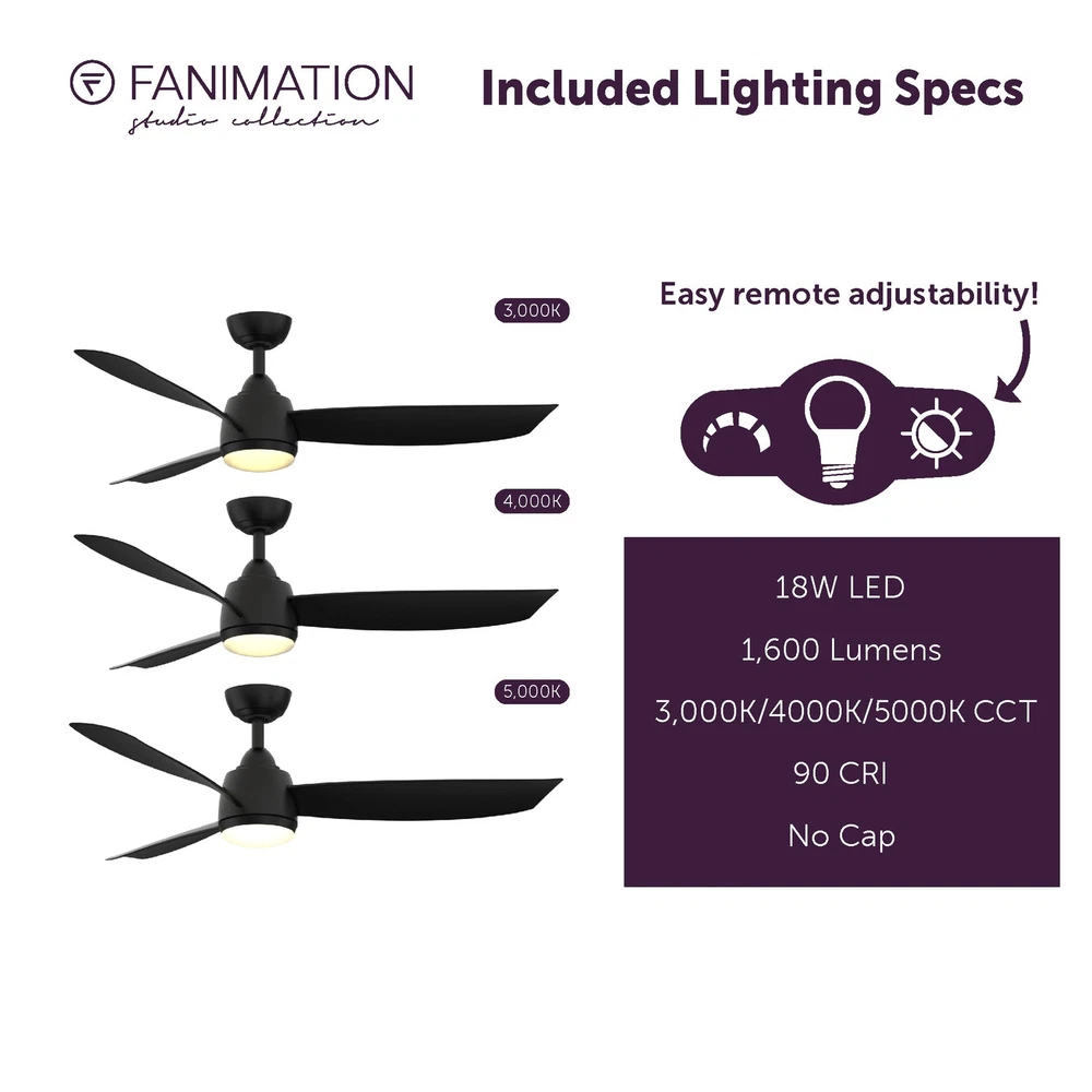 The 52 inch Fanimation Studio Collection AireFlex ceiling fan features a black finish and 3 blades to bring exciting sophistication to your home. This versatile fan has 16 speed settings, so you can maintain the ideal comfort level with ease. Mounts to flat or sloped ceilings with 4.5-in downrod included. An integrated 18W LED light with frosted glass brings overhead illumination, while featuring a Correlated Color Temperature (CCT) Select Technology which allows you to choose the CCT of your fans light kit - 3,000, 4,000 or 5,000K. Reverse airflow feature allows you to change the fan's direction setting seasonally, so cool air is pushed down or warm air is distributed evenly. 16-Speed, Reversible DC Motor provides airflow up to 5,910 CFM. Compatible with most smart home devices (required control sold separately) Black finish ceiling fan from the AireFlex Collection features 2 blades in a Black finish with an 18-watt LED light kit with frosted glass shade. TR305S hand-held remote control is included. Push button remote control with 16 fan speeds, fresh air, reverse, ON/OFF dimmer light levels, color temperature, fan/light timer, home away, safe exit and off button Fan comes with an 1" diameter x 4.5" length threaded downrod. Optional downrods are available in lengths up to 72 inches. For installations requiring a longer downrod, a downrod coupler is available. Fan can be mounted on a sloped ceiling up to 19°. Optional close-to-ceiling kit is available as well - sold separately. Optional sloped ceiling kits (SCK1-52) are available for up to 42°. Damp Rated for indoor and outdoor use