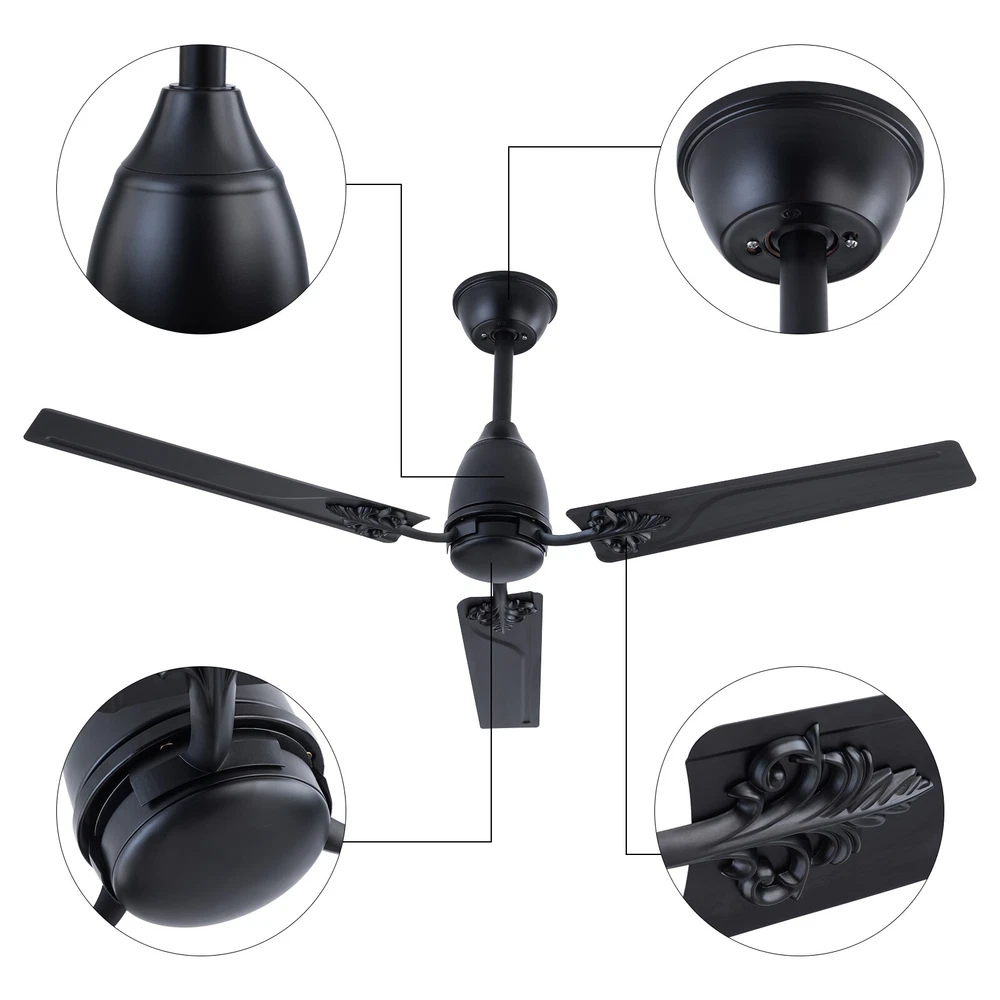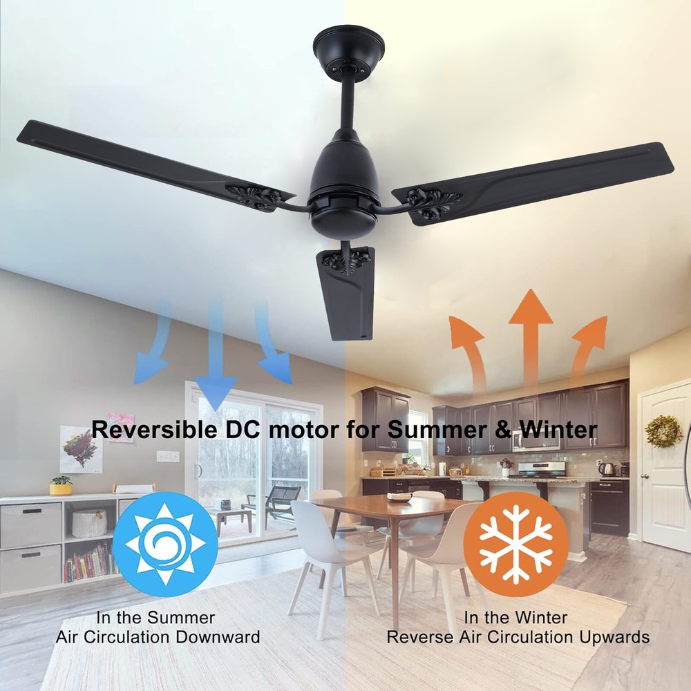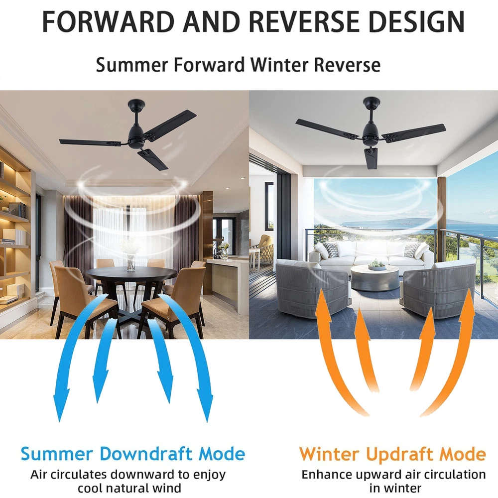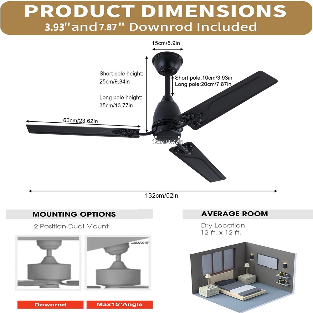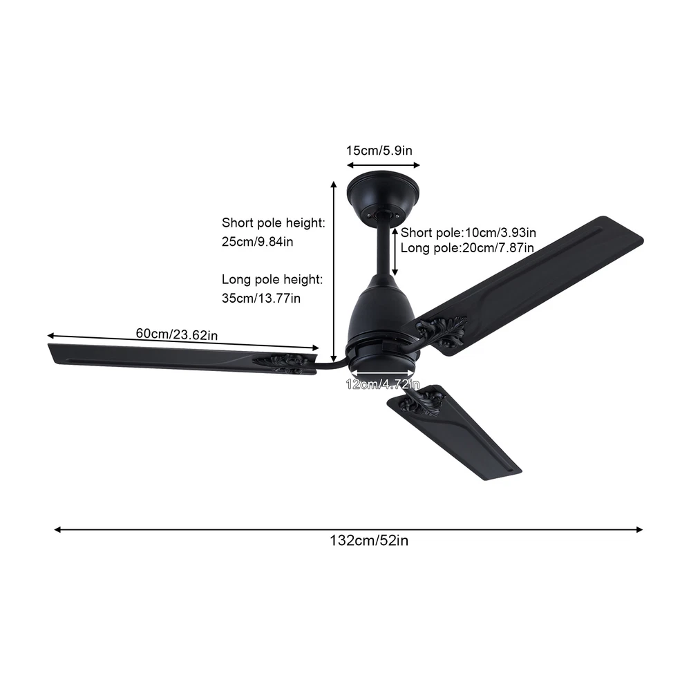 Description When a light breeze meets in your living room or bedroom, every ordinary moment of daily life becomes extraordinary. This ceiling fan ensures strong wind coverage and the wind dances with rotation, adding a flowing artistic beauty to the space. It is not only a choice for home appliances, but also a symbol of your pursuit of quality of life. Let it help you explore new dimensions of elegance, making every strand of wind a warm and artistic presence in your home. Specification Material: Iron Style: Modern Color: Black Control Method: Remote Mounting Type: Ceiling Mount Motor: DC Pure Copper Motor Remote Control Battery: 2*AAA Batteries (Included) Waterproof Level: IP44 Wattage: 22W Air Volume: 7230CFM Time Setting: 1/4/8H Noise Level: <30dB Voltage: 85-265V Ceiling Fan - 52 inch Ceiling Fan with Remote Control for Indoor Patio Bedroom Description When a light breeze meets in your living room or bedroom, every ordinary moment of daily life becomes extraordinary. This ceiling fan ensures strong wind coverage and the wind dances with rotation, adding a flowing artistic beauty to the space. It is not only a choice for home appliances, but also a symbol of your pursuit of quality of life. Let it help you explore new dimensions of elegance, making every strand of wind a warm and artistic presence in your home. Key Features Easy to Install: This ceiling fan is easy to install. You only need to follow the simple steps shown in the instructions and install it patiently. It can be put into use soon. Easy to Clean: Due to its metal material, the surface is smooth and easy to clean. You just need to wipe the stains with a cloth to keep it clean and hyg ienic. Excellent Motor: It adopts a DC pure copper motor with silent bearings ( < 30dB), providing a quiet resting environment. Compared with traditional AC motors, it features stable operation, high efficiency, and energy conservation . Built to Last: Its blade is designed with high-quality iron with an IP44 waterproof level, which is sturdy and durable. It has great anti-corrosion capability guaranteeing a long service life. Easy to Operate: It is equipped with a remote control, which can adjust the fan speed (six gears), and has timing and memory functions, making it easy to operate. Efficient Fanning: Its 3 blades and 52in diameter can generate 7230CFM air volume, allowing airflow to cover larger spaces. It can rotate in a forward/reverse direction, allowing you to enjoy a cool natural breeze or make indoor airflow smooth. You can flexibly adjust it according to seasonal changes to improve indoor comfort. Protective Packaging: We use protective foam to avoid damage to the machine during transportation, maximizing its safe arrival. Satisfaction Guarantee: No matter what problem you encounter or have any questions, please contact us. We will reply and solve the problem for you as soon as possible. Details Blade Pattern: The combination of metal blade and pattern design adds a personalized artistic atmosphere to your home space. Two Downrods: The package includes two sizes of downrods (3.93in/7.87in), allowin g for use on both high and low floors. Application It is suitable for installation in living rooms, bedrooms, kitchens, courtyards, offices, restaurants, shops, factories, barns, and other places . Specification Material: Iron Style: Modern Color: Black Control Method: Remote Mounting Type: Ceiling Mount Motor: DC Pure Copper Motor Remote Control Battery: 2*AAA Batteries (Included) Waterproof Level: IP44 Wattage: 22W Air Volume: 7230CFM Time Setting: 1/4/8H Noise Level: <30dB Voltage: 85-265V Wind Speed: 6 Gears Number of Blades: 3 Fan Diameter: 132cm/52in Blade Length: 60cm/23.62in Short Downrod Length: 10cm/3.93in Long Downrod Length: 20cm/7.87in Suspended Ceiling Diameter: 15cm/5.9in Product Height: 25cm/9.84in (with Short Downrod); 35cm/13.77in (with Long Downrod) Package Included 1* Ceiling Fan 1* Remote Control 1* Short Downrod 1* Long Downrod 1* English Manual Other Accessories for Installation Notes Please note that it can only be installed on the ceiling. If inclined installation is required, the inclination angle cannot exceed 15°. Please allow the slight color difference caused by the shooting light and 1-3cm error due to manual measurement, and make sure you do not mind before ordering. Payment Delivery details Terms of sales About us Contact us Payment We accept ebay payment 。 Fees such as import duties, taxes are not included in the item price or shipping costs. These charges are the buyer's responsibility. Delivery details Shipping: 2-9 working days to: USA Terms of sales We maintain high standards of excellence and strive for hundred percent customer satisfaction. Feedback is very important to us. We hope that you contact us immediately before you give neutral or negative feedback, so that we can address your concerns. It is impossible to address issues if we do not know about them! About us Your satis faction is our ultimate goal. We work hard to earn your trust and future business. Our certified technicians have tested each item before shipping. The unit comes with 1 year limited warranty on all manufacturing defects. a) If you receive a defective item, you may return it or ask for a discount. Please contact us within 14 days after you receive the package. b) What you returned must be intact and in its original packaging as re? u. Customer is responsible for shipping costs of the returned item. c) We will cover the cost of shipping back t with the shipping rate indicated in the registration page. We will send you a new unit or refund the full payment you paid. Thank you. Contact us Business Hour Business Hour: Monday To Friday: 8:30 AM to 5:00 PM (Beijing China time) Due to time zones, our reply to your questions may not be immediately. But within above working time, we will reply your email within 24 hours. If it's non-workdays, please kindly be patient and wait till Monday. Please contact us with ebay message. P