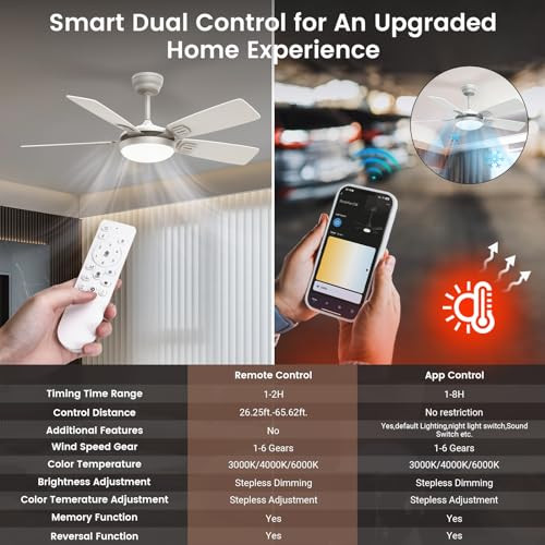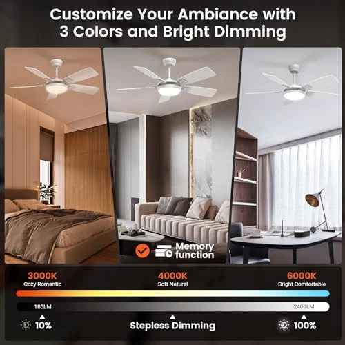 This ceiling fan is a game-changer! The sleek 52" flush mount design fits perfectly in my bedroom, and the quiet reversible motor keeps the air flowing without any noise. Love the convenience of controlling it via the app or remote—adjusting speeds, dimming the lights, and setting timers is effortless. The memory function is a nice touch, and the three color options let me set the perfect mood. Installation was straightforward, and it looks modern yet timeless. Highly recommend for anyone wanting style, comfort, and smart functionality!