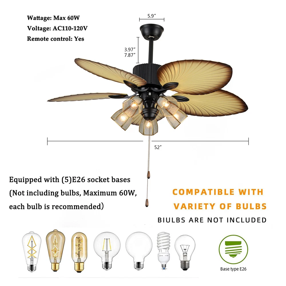 The Feature of Product Specification: 52inch Control Method:remote control (included) Blade Material: wood leaves lampshade Material:glass Light Kit: E26light bulbs *5 (not included。Edison bulb/LED/CFL/incandescent lamp is required, 20-60W is recommended,。) Downrod Length: 2 downrod of3.97 and 7.87inch (included) remote battery: 12V 23A (Included) Applicable Space:107-312square feet Applicable Place: living room/ bedroom /office and restaurant Installation Instruction ①For your safety, Please turn off the power before installation ② Please check parts against the packing list to see if the accessories are available. ③We provide install instructions for you. please referred to install manual or have a professional electrician. If need any help, please contact us. Ceiling Fan with Light Remote Control Reversible 5 Palm Tropical Blades 52 inch **Description of yybshop02** 52 Inch Palm Ceiling Fan Lights 3 Speed Remote Premium Light Fixtures 5 Lights 5 Palm Blades Tropical Ceiling Fan Decorations for Living Room Chandelier Fan Description Premium Material : A unique metal round arched lampshade is used, bright crystal decoration is placed on the outside. simple but elegant, 5 wood blade for great air movement. 2 downrod provide Great Looking: 3 speed sets, E26*5 light bulb, completely silent, fantastic air circulation, great looking, It adds so much to the room without being over the top Reverse Function : 3 speed choosing, reversible ceiling fan can change the direction of the fan from updraft mode during the summer to the downdraft mode during the winter WhisperWind Motorsilver ceiling fan with shiny metal body is designed the imported silicon steel sheet and imported premium bearings, It can extend longer life and smooth operation The Feature of Product Detail: 52inch Control Method:remote control (included) Blade Material: wood leaves lampshade Materialglass Light Kit: E26light bulbs *5 (not includedEdison bulb/LED/CFL/incandescent lamp is required, 20-60W is recommended,) Downrod Length: 2 downrod of3.97 and 7.87inch (included) remote battery: 12V 23A (Included) Applicable Space:107-312square feet Applicable Place: living room/ bedroom /office and restaurant Installation Instruction For your safety, Please turn off the power before installation Please check parts against the packing list to see if the accessories are available. We provide install instructions for you. please referred to install manual or have a professional electrician. If need any help, please contact us. What will you get: ceiling fan x 1 Screws sets x 1 Down rods x 2 (10CM & 20CM) Remote control x 1 Instruction Manual x 1 **Description of yybshop02** If you have any question , please contact us , and we will reply you as soon as possible. Description Welcome to Saletyyy111 ~ Payment Delivery details Terms of sales About us Contact us Payment We accept ebay payment 。 Fees such as import duties, taxes are not included in the item price or shipping costs. These charges are the buyer's responsibility. Delivery details Shipping: 2-9 working days to: USA Terms of sales We maintain high standards of excellence and strive for hundred percent customer satisfaction. Feedback is very important to us. We hope that you contact us immediately before you give neutral or negative feedback, so that we can address your concerns. It is impossible to address issues if we do not know about them! About us Your satis faction is our ultimate goal. We work hard to earn your trust and future business. Our certified technicians have tested each item before shipping. The unit comes with 1 year limited warranty on all manufacturing defects. a) If you receive a defective item, you may return it or ask for a discount. Please contact us within 14 days after you receive the package. b) What you returned must be intact and in its original packaging as re? u. Customer is responsible for shipping costs of the returned item. c) We will cover the cost of shipping back t with the shipping rate indicated in the registration page. We will send you a new unit or refund the full payment you paid. Thank you. Contact us Business Hour Business Hour: Monday To Friday: 8:30 AM to 5:00 PM (Beijing China time) Due to time zones, our reply to your questions may not be immediately. But within above working time, we will reply your email within 24 hours. If it's non-workdays, please kindly be patient and wait till Monday. Please contact us with ebay message. Please feel free to contact us if you have any questions. Monday To Friday: 8:30 AM to 5:00 PM (Beijing China time) Due to time zones, our reply to your questions may not be immediately. But within above working time, we will reply your email within 24 hours. If it's non-workdays, please kindly be patient and wait till Monday. Please contact us with ebay message. Please feel free to contact us if you have any questions.