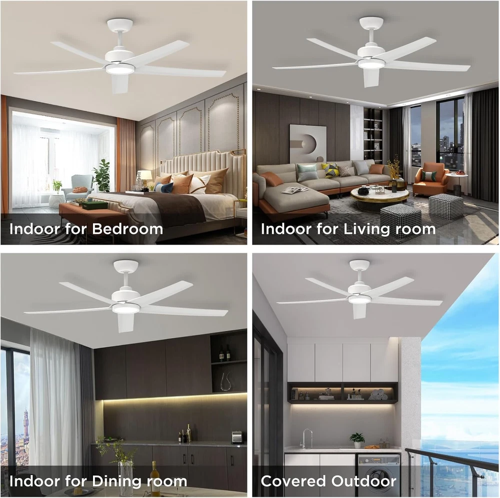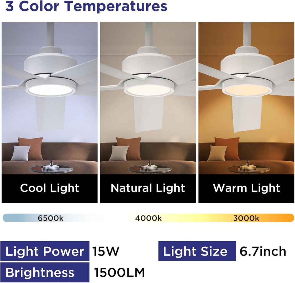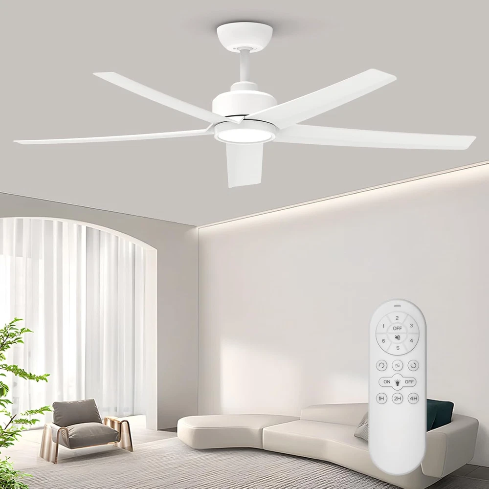Store New Arrivals Add to Favorite View Feedback Contact Ceiling Fans with Lights, 52 Inch White Ceiling Fan with Light and Remote Control, 3CCT, Quiet DC Motor, 5 Blades Modern Ceiling Fan for Living Room Indoor/Covered Outdoor Description Light Source Type LED Included Components 1 LED Integrated Light Kit, 1 Ceiling Bracket, 1 Remote and Holder(No equipped with battery), 6 inch Downrod, 1 User Manual Style Contemporary Number of Items 1 Power Source Corded Electric Fixture Type Removable Number of Light Sources 1 Control Method Remote Warranty Type Limited Theme Modern Batteries Included? No Lighting Method Downlight Controller Type Remote Control Unit Count 1.0 Count Room Type Living Room, Bedroom, Home Office, Dining Room Assembly Required Yes Product Dimensions 52"L x 52"W x 12.2"H Material Plastic, Metal Installation Type Semi Flush Mount Finish Type Painted Specific Uses For Product Garage, Balcony, Patio, Home Indoor/Outdoor Usage Indoor Brightness 1500 Lumen Country of Origin China Light Color White Batteries Required? No Item Weight 10.36 pounds Light fixture form Close to Ceiling Special Features Remote Controlled, Adjustable Color Temperature, Reversible Airflow, Multi-Speed(1 to 6), Timer(1/2/4H) Special Feature Remote Controlled, Adjustable Color Temperature, Reversible Airflow, Multi-Speed(1 to 6), Timer(1/2/4H) Shade Color White Mounting Type Downrod Mount Color White Wattage 50 watts Shape Round Voltage 120 Volts (AC) Recommended Uses For Product Cooling, Air Circulation Shade Material Plastic Finish types Painted Number of Blades 5 Switch Type Push Button Large Airflow Ceiling Fan: The ocioc 52-inch ceiling fan with light, featuring five excellent quality plastic blades and a quiet DC motor, ensures powerful airflow, reaching a maximum of 6000CMF. Ideal for expansive areas such as living rooms, farmhouse,bedrooms,basements,and shops; Note: Ceiling fans are suitable for both indoor and covered outdoor use, but they are not suitable for damp or rain-exposed areas Silent Reversible DC Motor: Our white ceiling fan are equipped with a premium reversible DC motor; Seamlessly transition between the downshift mode for summer and the upshift mode for winter comfort; Unlike traditional AC motors, these bedroom ceiling fans provide large airflow and operate at under 30 dB; With the convenient buzzer on/off function, easily mute the beep, creating a peaceful environment ideal for restful sleep or focused learning Three CCT Settings with MEMORY FUNCTION: Our ceiling fan with remote features an integrated LED light that provides soft illumination in three color temperatures – 3000 K (Warm White), 4000 K (Neutral White), and 5000 K (Cool White); The ceiling fan light retains its color temperature setting: WAITING FOR SEVEN SECONDS AFTER TURNING IT OFF KEEPS THE SAME SETTING WHEN TURNED BACK ON; If you turn it on within seven seconds, the color temperature will change Ceiling Fans with Lights and Remote: This ceiling fan includes a remote control (Note: Remote control requires two AAA batteries, not included), allowing you to customize fan direction, LED light color temperature, select from six wind speeds, and schedule timers (1 H, 2 H, 4 H); You have the flexibility to control the fan or lighting independently. Please be aware that utilizing a dimmer switch may result in excessive noise. It is advisable to use a standard on/off wall switch Simple Installation: Effortlessly install our fan on flat or slightly angled ceilings (up to 12 degrees); The ceiling fan with light remote control comes with all necessary mounting hardware and clear installation instructions; Following the instructional video ensures a hassle-free setup; Additionally, enjoy peace of mind with our round-the-clock customer service support Product Description ocioc 52 Inch Ceiling Fan with Light and Remote Featuring a 5-blade plastic design that enhances airflow, our ceiling fan outperforms three-blade alternatives in terms of air volume at equivalent speeds. Conversely, when both have the same air volume, the five-blade fan operates at lower speeds, reducing wind noise compared to its three-blade counterparts. Buzzer ON/OFF Function: Mute the beep effortlessly using the remote control's dedicated button, ensuring a peaceful sleep without concerns about the disturbance. Convenient Remote Control: Unlike conventional AC fans, DC motor fans can effortlessly switch between forward and reverse modes with a simple touch, eliminating the necessity for manual adjustments on the fan unit. Summer and Winter Modes : Our outdoor ceiling fan is equipped with both summer and winter modes, ensuring precise air circulation for your comfort. During summer, it delivers a refreshing breeze by directing air downward, while in winter, it evenly disperses warm air generated by indoor heating equipment by reversing the airflow. Three Color Temperature: Illuminate your space with our ceiling fan light kits, offering high-quality lighting in three color temperature options (warm light 3000K, natural light 4000K, cool light 5000K). Material: The motor and downrod components in this fan light are crafted from premium metal to ensure optimal performance and stability, while other parts are made from high-quality plastic to provide a lightweight and practical design. This minimalist white ceiling fan with lights and remote is suitable for various settings, from modern city homes to charming farmhouses and covered outdoor patios. NOTICE: Please avoid exposing the fan to rain and direct sunlight. Use only standard on/off switches; dimmer switches are not supported. ABOUT US We offer the best prices around on high quality products. Our E-store includes media such as books, movies, music and games while offering electronics, toys, sporting apparel, clothing, tools, general home, garden items and more. SHIPPING We are always working hard to ensure your package arrives as soon as possible. Please understand that some factors like weather, high po