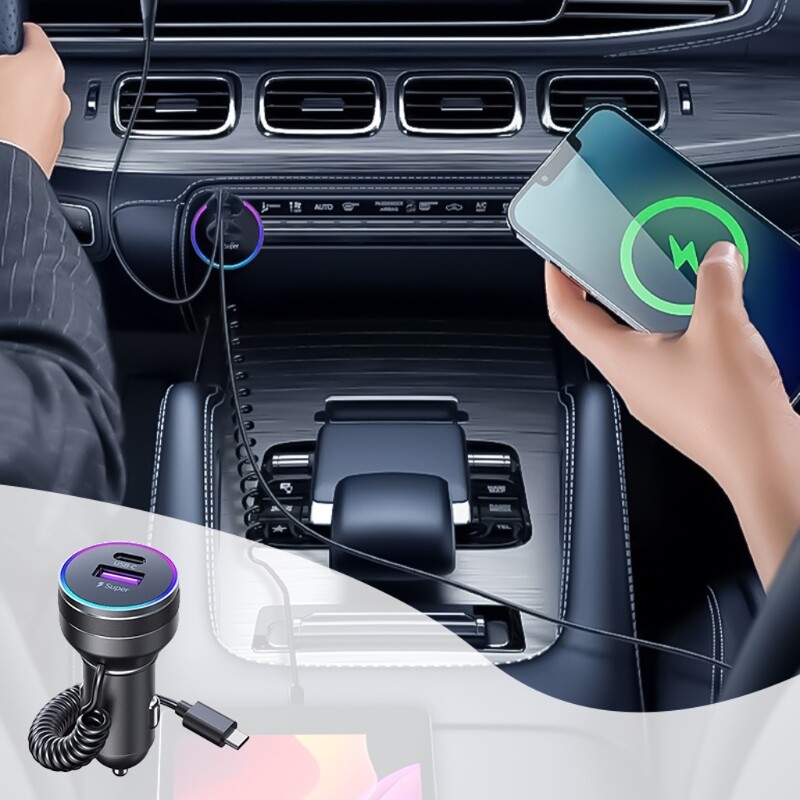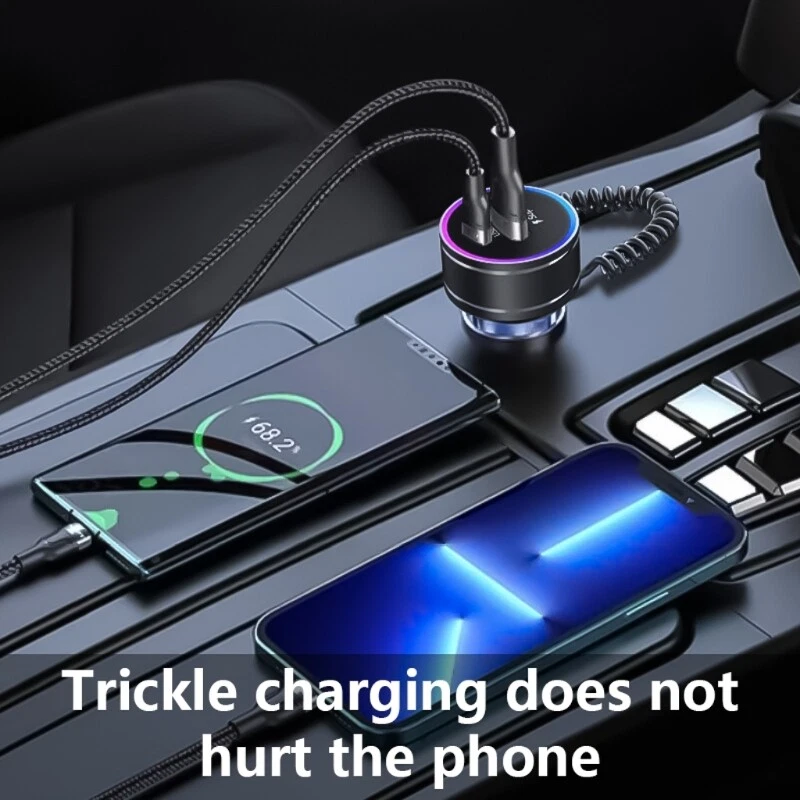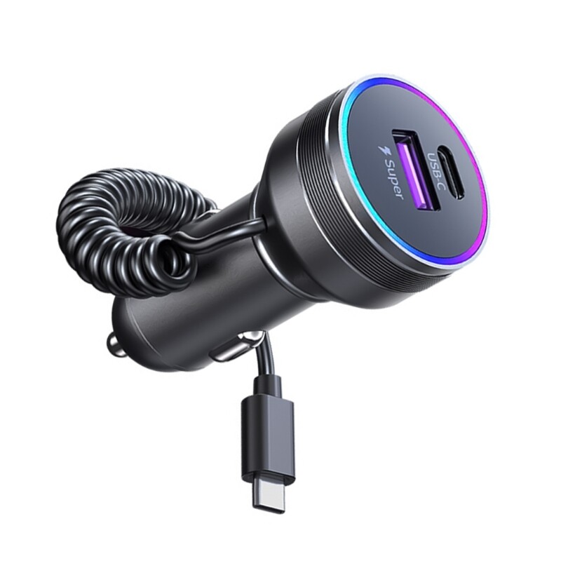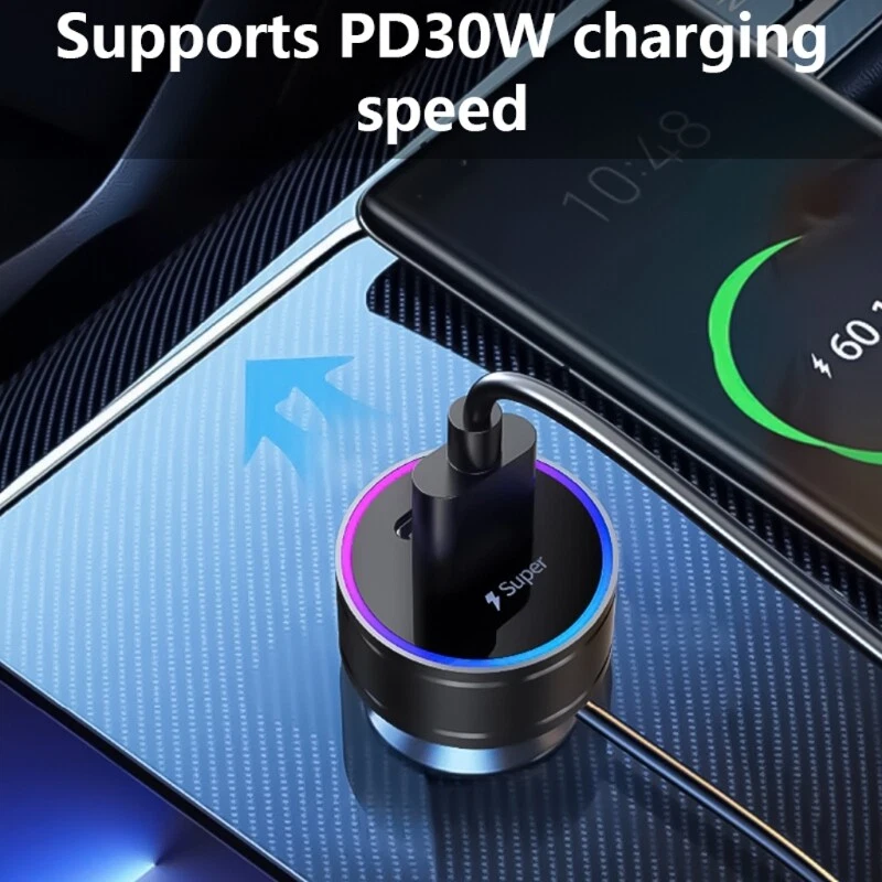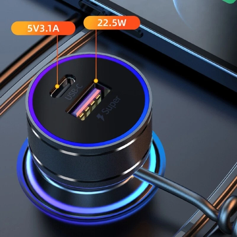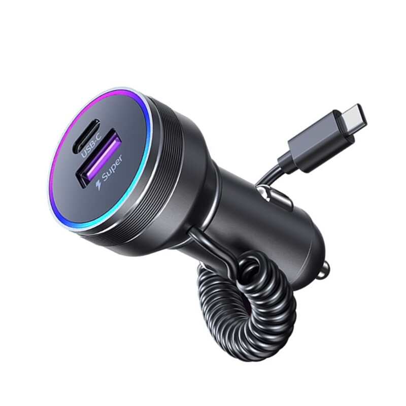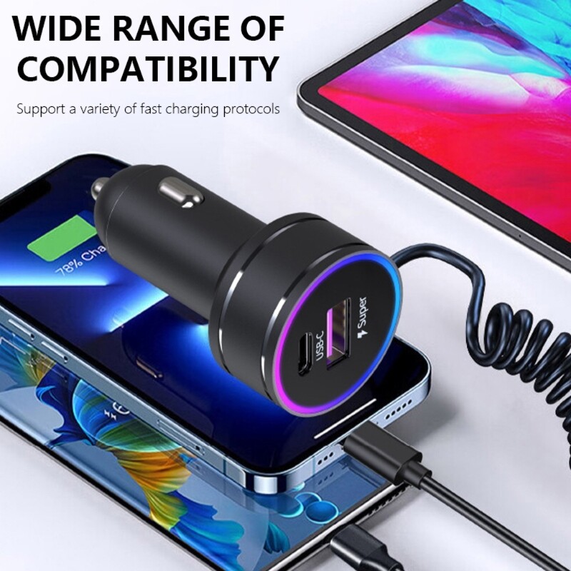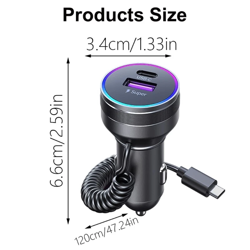 Features: Super fast charging car integrated spring coiled wire car with 120cm Type C charging cable. Newly USB+PD30W+1.2m cable interfaces with sufficient output, safe and environmentally friendly. USB and USB C port work simultaneously, allowing multiple devices to be charging simultaneously. Suitable for 12V-24V vehicles, with a colorful breathing light, making it easy to at night. Double port independent charging, USB supports 22.5W super fast charging, TYPE C port 5V3.1Amp charging. Specifications: Material: Plastic+Metal Color: black Size: about 6.6x3.4cm/2.59x1.33" Cable Length: up to about 1.2m/3.9ft Input: DC12V-24V Output: USB1: QC3.0 DC5V-4.5A 9V-2A 12V-1.5A 22.5W Type-C: DC5V-3A Type-C cable: DC5V-3A 9V-3A 12V-2.5A (supports PD30W, supports for 66W 100W) suitable for electronic devices such as phones and tablets Indication: LED Colorful Light Package Includes: 1pc Super Fast Charging Car note: Please allow 1-2cm errors due to manual measurement. Please allow for slight color differences due to different display resolution.