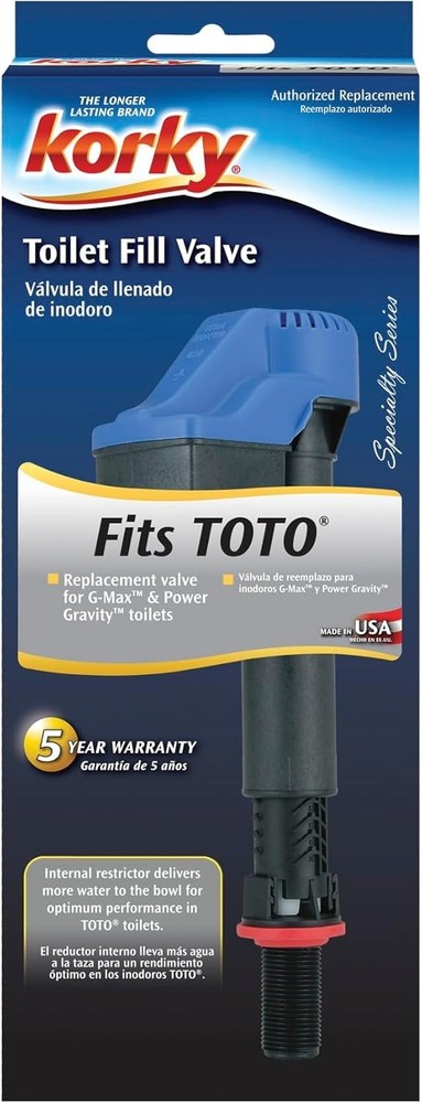 bout this item TOTO FILL FALVE: Designed to replace G-Max & Power Gravity Toilets. Designed to fix no/slow refilling, running, & noisy toilets, the fill valve is quieter than other fill valves. Adjustable sizing. EASY TO INSTALL: Simply remove your old fill valve or ballcock, insert your new Korky fill valve, & adjust. The innovative twist-lock adjustment makes installation easy. Adjusts from 7-3/4" to 13-1/2". INCLUDES: The universal fill valve set includes fill valve, refill tube, metal refill tube clip, mounting nut, cone washer, coupling nut, tamper proof key and instructions. WHY KORKY: Our high quality toilet products are universal & specific to both older & modern toilet models. Our repair parts are easy to install & made exclusively from long lasting chlorazone red rubber.