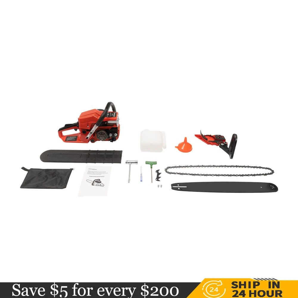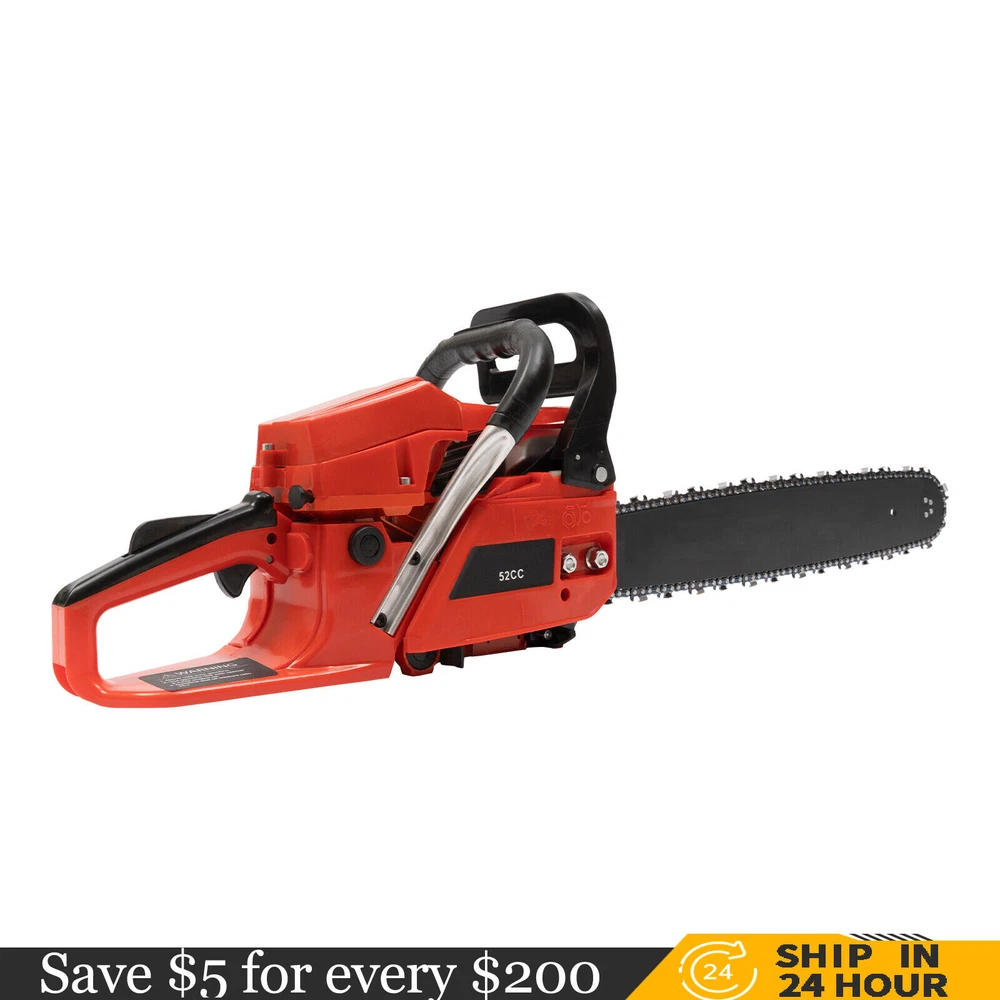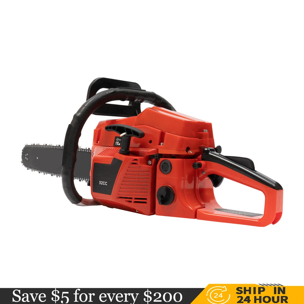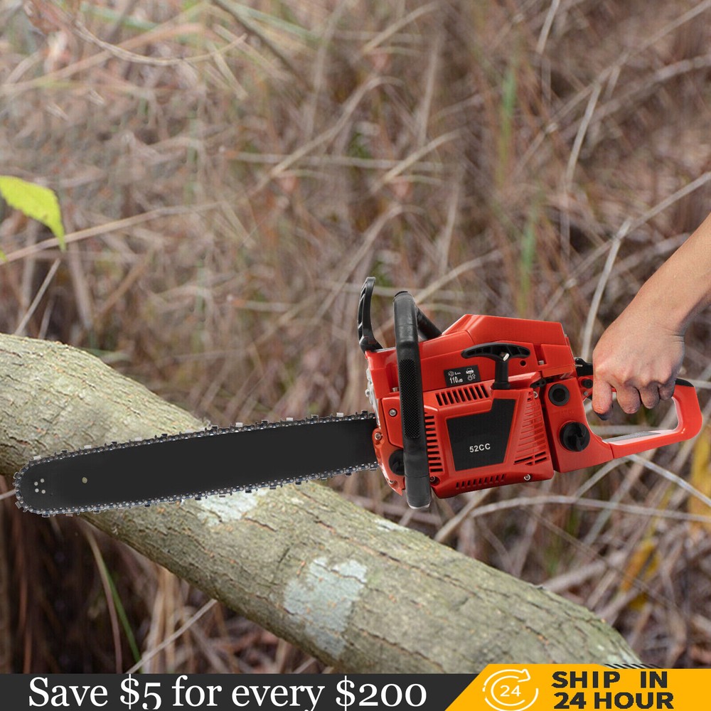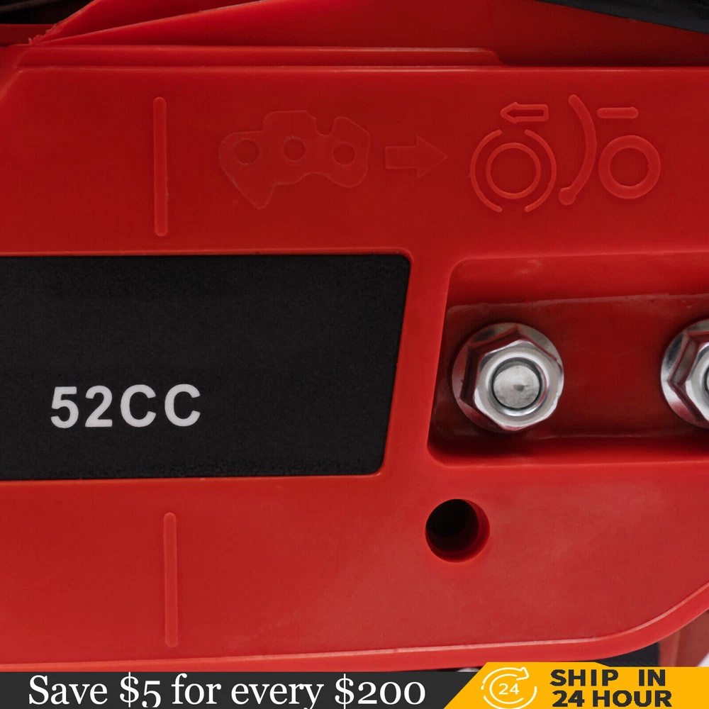52CC 2-Stroke 20 Inch Chainsaw Gasoline Power Wood Cutting Limbing Chainsaw Gasoline Chainsaw, 52cc 2.2Kw, 2-Stroke Engine, 20 Inch Chainsaw, For Wood Cutting, Light Felling, and Limbing Description This gasoline chainsaw has the advantages of high quality(PP and Mn steel material), superior performance(10500rpm speed), powerful engine(2.2kw power), providing you with a professional cutting tool that saves you time and labor. With silencing and damping designs, an ergonomic handle, dual switches, a braking baffle, and a pull-start ignition method, it is comfortable and safe to use. How to Assemble the Chainsaw Install the jam teeth in the right direction. Install the guide bar. Install the chain. Cover the side cover. Adjust the chain tightness. Tighten the screw. Specification Color: Red, Black, Silver Material: PP, Mn Steel Style: Modern Assembly Required: Yes Engine Type: Single Cylinder, Air-cooled, 2-Stroke Ignition System: Self-reset Pull Start Fuel Tank Capacity: 550ml/18.6Oz Chain Fuel Tank Capacity: 260ml/8.8Oz Chain Pitch: 0.325# Bore: 45mm/1.77inch Power: 2.2kw Speed: 10500rpm Displacement: 52cc Oil Mixture: 25:1(Gasoline: Oil) Chain Length: 50.8cm/20inch Max. Cutting Diameter: About 48cm/18.9inch Product Size: 88*23*28cm/34.64*9.05*11.02inch Package Size: 56*27*34cm/22.04*10.6*13.38inch Gross Weight: 8.5kg/18.74 lbs Package Included 1* Gas Chainsaw 1* Chain 1* Guide Bar 1* Guide Bar Cover 1* Fuel Mixing Bottle 1* Oil Hopper 1* Tool Bag 1* English Manual Other Accessories for Assembly Key Features High-quality Material: This product is made of high-quality PP housing and Mn steel guide bar&chain, which is strong, durable, wear-resistant, and not easy to deform. Excellent Performance : The 2-stoke engine with 52cc displacement, 10500rpm high speed, and 2.2KW high power, the high-magnetic flywheel with thickened blade design, and the carburetor with the function of atomizing fuel help this machine keep normal and economical operation, reduce emissions, achieve fast cutting, thus providing excellent performance(about 18.9" cutting diameter). High Safety: The double protection switches that must be pressed at the same time to work can prevent the machine from accidentally starting, thus guaranteeing the safety of cutting work. Moreover, the high-quality brake baffle can make emergency braking, protect your hands from hurting, avoid sawdust splashing, and improve safety. Muti-Angle Cutting: You can achieve muti-angle cutting by changing the direction of the machine, which is convenient for you to use. Convenient and Comfortable: With a hand-pull spring-loaded starter handle, premium spark plug, safety switch, and throttle switch, it's convenient to use. Its cordless design allows you to operate more easily and freely. Moreover, the silencing and damping designs can effectively reduce noise and vibration, providing you with a comfortable environment when cutting. Automatic Lubricating Oil: Automatic lubricating oil can provide a stable and economical supply of chain and bar, reduce friction and oil consumption by 20%, thus improving cutting performance and extending service life. Easy to Install: The simple structure, complete accessories, and English manual allow you to install this product in minutes, saving you time and labor. Protective Package: To prevent the product from being damaged and bumped during transportation, we packed it with foam to protect your products to the maximum extent possible. Guaranteed Customer Service: We aim to provide quality products and services. If you have problems, please feel free to contact us. We will reply and solve the problem for you as soon as possible. Details Heat Dissipation Holes: The heat-sink holes on the side of the product can dissipate heat in time and prolong the service life of this product. 20-inch Guide Chain: It can meet the needs of cutting wood that need a longer bar. Tool Bag: You can put the equipped tools into the tool bag to avoid losing them while protecting the tools well to extend their service life. Guide Bar Cover: It allows for convenient storage of the guide bar when not in use and protects it well. Fuel Tanks: The 18.6Oz chainsaw fuel tank, 8.8Oz chain fuel tank, and equipped translucent fuel bottle allows for large capacity, a convenient mixture of fuels, and long-term use without frequent filling. Oil Hopper: The equipped oil hopper helps you add fuel to the machine easier without splashing. Ergonomic Handles: The ergonomic handles on the machine head and top have textured skin can give you a comfortable grip without slipping, absorb shock, and reduce hand fatigue even in long-time use for better balance&high-cutting performance. Application It is suitable for forest harvesting, cutting wood, pruning branches, gardening, home woodworking, bamboo sawing, logging, light felling, DIY crafts, ranches, farms, and so on to meet different needs. Notes Before starting the gasoline chainsaw, please ensure that it fits well with the guide bar, and use a wrench to adjust the chain. When installing the guide bar, please note that the screw column on the side cover must be aligned with the guide bar hole before installation(The function of the screw column is to adjust the chain tightness.). Please use gasoline 90# with special 2-cycle engine oil and never use pure gasoline. Gasoline and oil mixture ratio: 25:1. Adjustment of oil output: the oil output can be controlled to turn larger to the left and smaller to the right. Please note that after the first ignition sound, closing the choke and repeatedly pulling the start handle will suck in too much fuel and prevent the engine from starting. If the choke knob is not fully pushed back after pulling the starter handle up to 6 times, the engine preheating may be missed. Too much fuel will flow out and submerge the spark plug. Then you can't start the chainsaw. The damper is used to regulate air intake. When the engine is cold or not used for a long time, the damper needs to be 