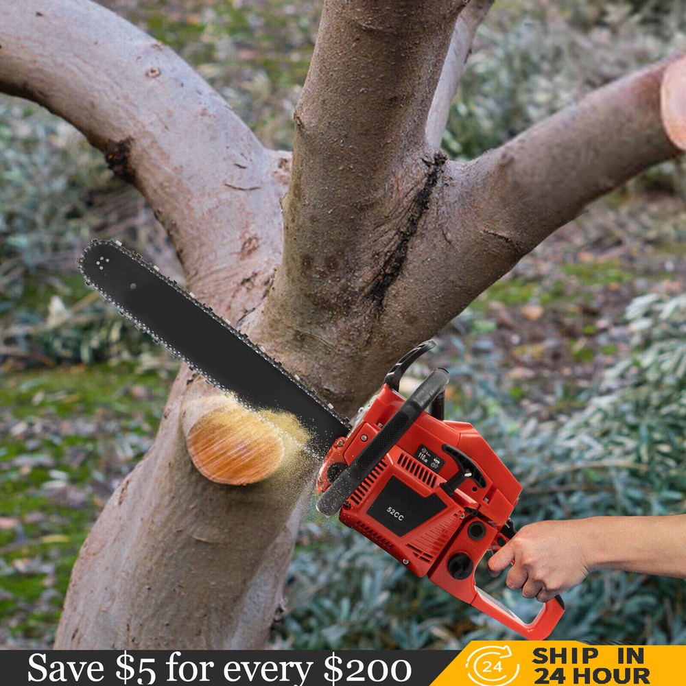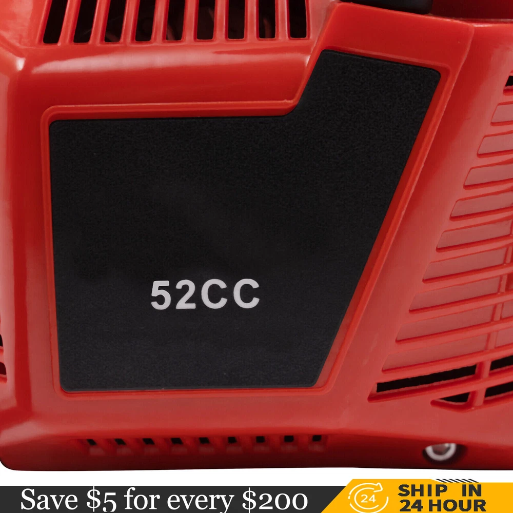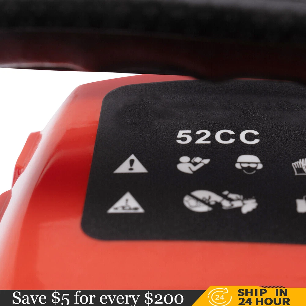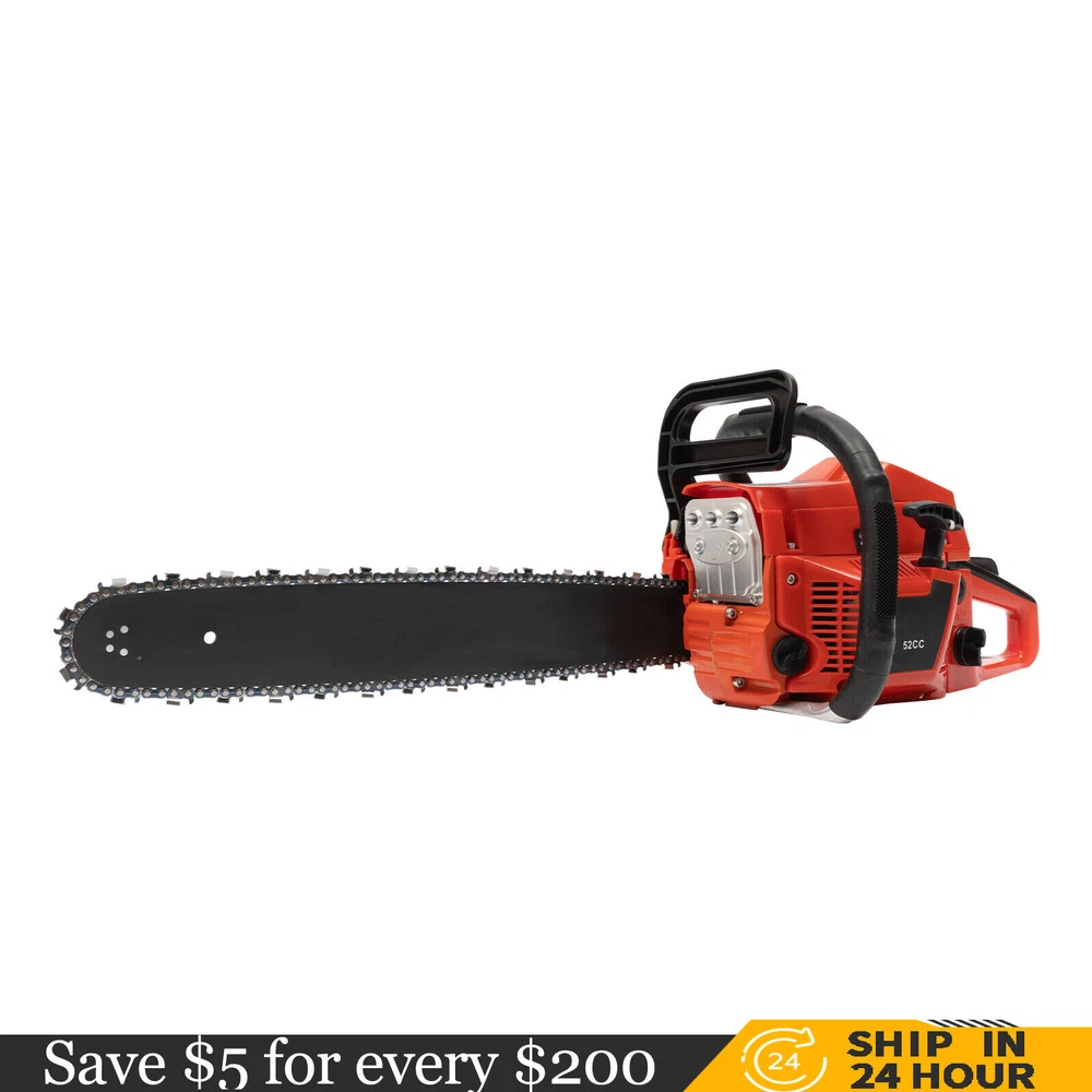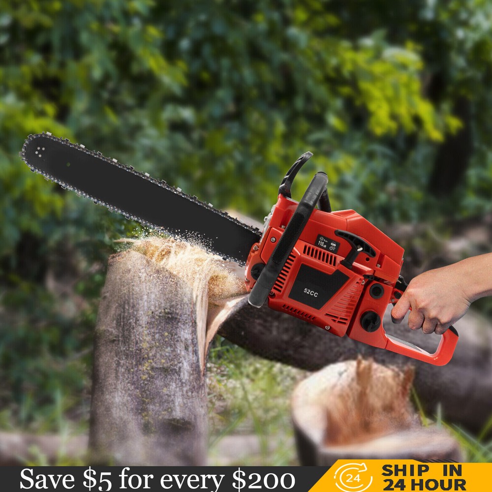 52CC 2-Stroke 20 Inch Chainsaw Gasoline Power Wood Cutting Limbing Chainsaw Gasoline Chainsaw, 52cc 2.2Kw, 2-Stroke Engine, 20 Inch Chainsaw, For Wood Cutting, Light Felling, and Limbing Description This gasoline chainsaw has the advantages of high quality(PP and Mn steel material), superior performance(10500rpm speed), powerful engine(2.2kw power), providing you with a professional cutting tool that saves you time and labor. With silencing and damping designs, an ergonomic handle, dual switches, a braking baffle, and a pull-start ignition method, it is comfortable and safe to use. How to Assemble the Chainsaw Install the jam teeth in the right direction. Install the guide bar. Install the chain. Cover the side cover. Adjust the chain tightness. Tighten the screw. Specification Color: Red, Black, Silver Material: PP, Mn Steel Style: Modern Assembly Required: Yes Engine Type: Single Cylinder, Air-cooled, 2-Stroke Ignition System: Self-reset Pull Start Fuel Tank Capacity: 550ml/18.6Oz Chain Fuel Tank Capacity: 260ml/8.8Oz Chain Pitch: 0.325# Bore: 45mm/1.77inch Power: 2.2kw Speed: 10500rpm Displacement: 52cc Oil Mixture: 25:1(Gasoline: Oil) Chain Length: 50.8cm/20inch Max. Cutting Diameter: About 48cm/18.9inch Product Size: 88*23*28cm/34.64*9.05*11.02inch Package Size: 56*27*34cm/22.04*10.6*13.38inch Gross Weight: 8.5kg/18.74 lbs Package Included 1* Gas Chainsaw 1* Chain 1* Guide Bar 1* Guide Bar Cover 1* Fuel Mixing Bottle 1* Oil Hopper 1* Tool Bag 1* English Manual Other Accessories for Assembly Key Features High-quality Material: This product is made of high-quality PP housing and Mn steel guide bar&chain, which is strong, durable, wear-resistant, and not easy to deform. Excellent Performance : The 2-stoke engine with 52cc displacement, 10500rpm high speed, and 2.2KW high power, the high-magnetic flywheel with thickened blade design, and the carburetor with the function of atomizing fuel help this machine keep normal and economical operation, reduce emissions, achieve fast cutting, thus providing excellent performance(about 18.9" cutting diameter). High Safety: The double protection switches that must be pressed at the same time to work can prevent the machine from accidentally starting, thus guaranteeing the safety of cutting work. Moreover, the high-quality brake baffle can make emergency braking, protect your hands from hurting, avoid sawdust splashing, and improve safety. Muti-Angle Cutting: You can achieve muti-angle cutting by changing the direction of the machine, which is convenient for you to use. Convenient and Comfortable: With a hand-pull spring-loaded starter handle, premium spark plug, safety switch, and throttle switch, it's convenient to use. Its cordless design allows you to operate more easily and freely. Moreover, the silencing and damping designs can effectively reduce noise and vibration, providing you with a comfortable environment when cutting. Automatic Lubricating Oil: Automatic lubricating oil can provide a stable and economical supply of chain and bar, reduce friction and oil consumption by 20%, thus improving cutting performance and extending service life. Easy to Install: The simple structure, complete accessories, and English manual allow you to install this product in minutes, saving you time and labor. Protective Package: To prevent the product from being damaged and bumped during transportation, we packed it with foam to protect your products to the maximum extent possible. Guaranteed Customer Service: We aim to provide quality products and services. If you have problems, please feel free to contact us. We will reply and solve the problem for you as soon as possible. Details Heat Dissipation Holes: The heat-sink holes on the side of the product can dissipate heat in time and prolong the service life of this product. 20-inch Guide Chain: It can meet the needs of cutting wood that need a longer bar. Tool Bag: You can put the equipped tools into the tool bag to avoid losing them while protecting the tools well to extend their service life. Guide Bar Cover: It allows for convenient storage of the guide bar when not in use and protects it well. Fuel Tanks: The 18.6Oz chainsaw fuel tank, 8.8Oz chain fuel tank, and equipped translucent fuel bottle allows for large capacity, a convenient mixture of fuels, and long-term use without frequent filling. Oil Hopper: The equipped oil hopper helps you add fuel to the machine easier without splashing. Ergonomic Handles: The ergonomic handles on the machine head and top have textured skin can give you a comfortable grip without slipping, absorb shock, and reduce hand fatigue even in long-time use for better balance&high-cutting performance. Application It is suitable for forest harvesting, cutting wood, pruning branches, gardening, home woodworking, bamboo sawing, logging, light felling, DIY crafts, ranches, farms, and so on to meet different needs. Notes Before starting the gasoline chainsaw, please ensure that it fits well with the guide bar, and use a wrench to adjust the chain. When installing the guide bar, please note that the screw column on the side cover must be aligned with the guide bar hole before installation(The function of the screw column is to adjust the chain tightness.). Please use gasoline 90# with special 2-cycle engine oil and never use pure gasoline. Gasoline and oil mixture ratio: 25:1. Adjustment of oil output: the oil output can be controlled to turn larger to the left and smaller to the right. Please note that after the first ignition sound, closing the choke and repeatedly pulling the start handle will suck in too much fuel and prevent the engine from starting. If the choke knob is not fully pushed back after pulling the starter handle up to 6 times, the engine preheating may be missed. Too much fuel will flow out and submerge the spark plug. Then you can't start the chainsaw. The damper is used to regulate air intake. When the engine is cold or not used for a long time, the damper needs to be 