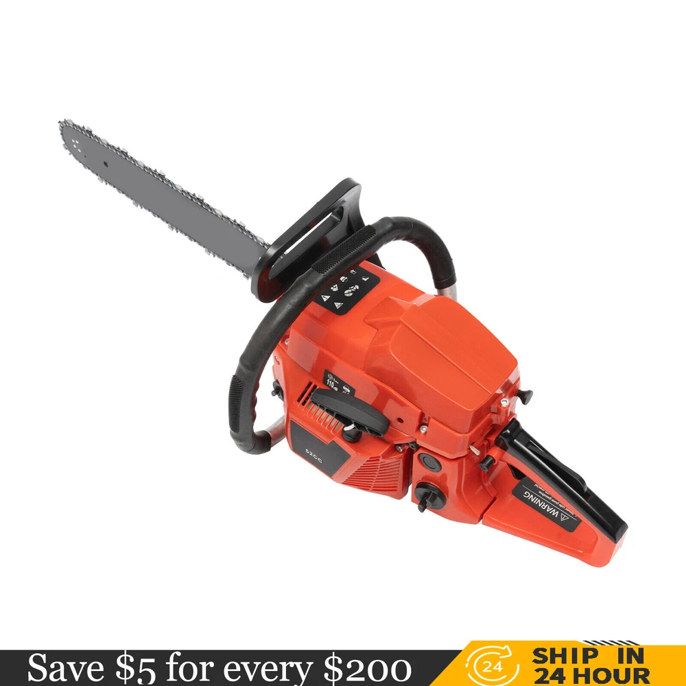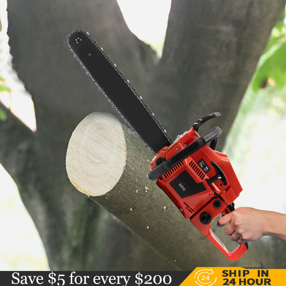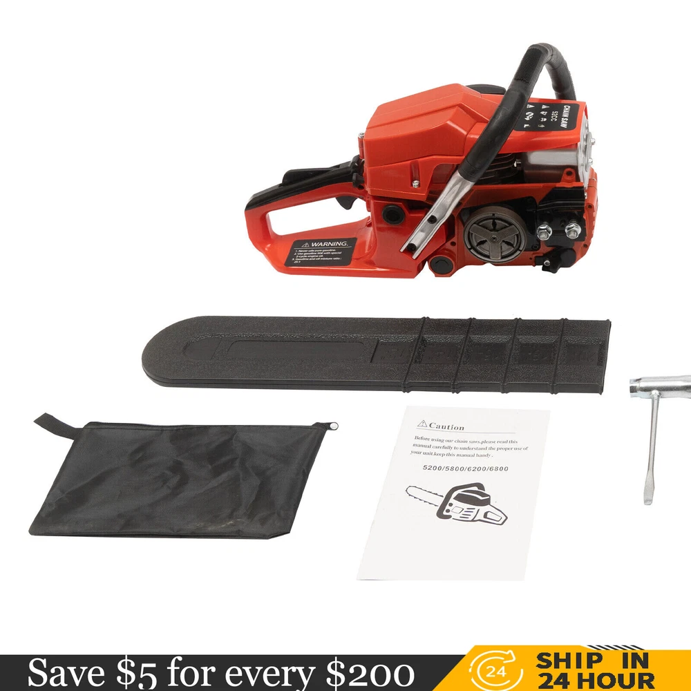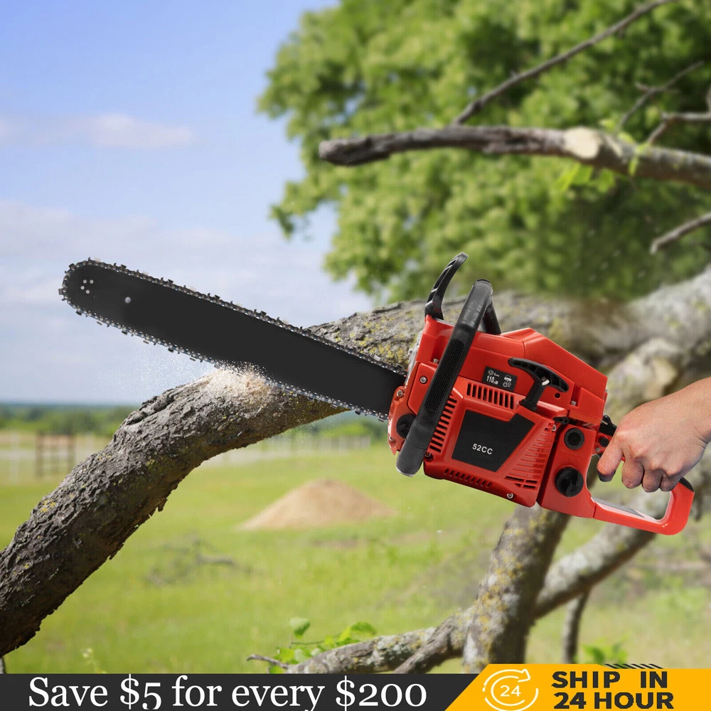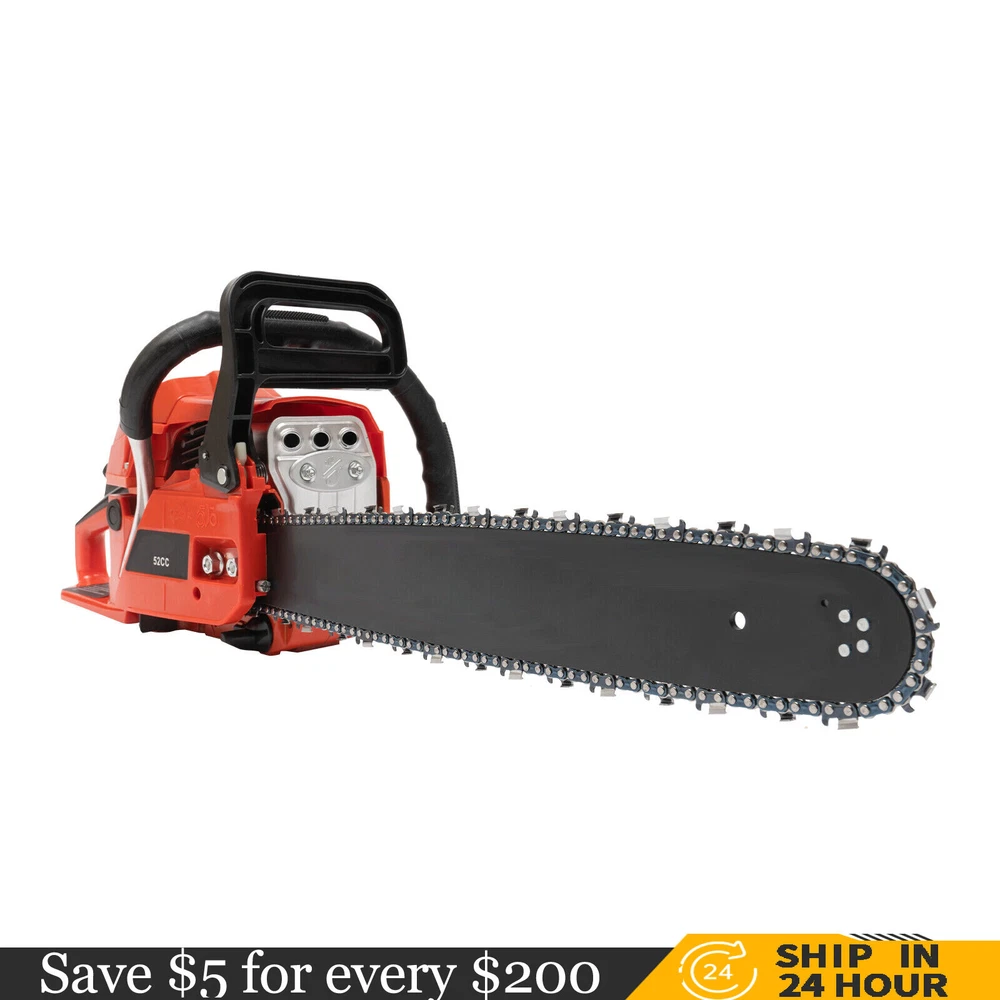 52CC 2-Stroke 20 Inch Chainsaw Gasoline Power Wood Cutting Limbing Chainsaw Gasoline Chainsaw, 52cc 2.2Kw, 2-Stroke Engine, 20 Inch Chainsaw, For Wood Cutting, Light Felling, and Limbing Description This gasoline chainsaw has the advantages of high quality(PP and Mn steel material), superior performance(10500rpm speed), powerful engine(2.2kw power), providing you with a professional cutting tool that saves you time and labor. With silencing and damping designs, an ergonomic handle, dual switches, a braking baffle, and a pull-start ignition method, it is comfortable and safe to use. How to Assemble the Chainsaw Install the jam teeth in the right direction. Install the guide bar. Install the chain. Cover the side cover. Adjust the chain tightness. Tighten the screw. Specification Color: Red, Black, Silver Material: PP, Mn Steel Style: Modern Assembly Required: Yes Engine Type: Single Cylinder, Air-cooled, 2-Stroke Ignition System: Self-reset Pull Start Fuel Tank Capacity: 550ml/18.6Oz Chain Fuel Tank Capacity: 260ml/8.8Oz Chain Pitch: 0.325# Bore: 45mm/1.77inch Power: 2.2kw Speed: 10500rpm Displacement: 52cc Oil Mixture: 25:1(Gasoline: Oil) Chain Length: 50.8cm/20inch Max. Cutting Diameter: About 48cm/18.9inch Product Size: 88*23*28cm/34.64*9.05*11.02inch Package Size: 56*27*34cm/22.04*10.6*13.38inch Gross Weight: 8.5kg/18.74 lbs Package Included 1* Gas Chainsaw 1* Chain 1* Guide Bar 1* Guide Bar Cover 1* Fuel Mixing Bottle 1* Oil Hopper 1* Tool Bag 1* English Manual Other Accessories for Assembly Key Features High-quality Material: This product is made of high-quality PP housing and Mn steel guide bar&chain, which is strong, durable, wear-resistant, and not easy to deform. Excellent Performance : The 2-stoke engine with 52cc displacement, 10500rpm high speed, and 2.2KW high power, the high-magnetic flywheel with thickened blade design, and the carburetor with the function of atomizing fuel help this machine keep normal and economical operation, reduce emissions, achieve fast cutting, thus providing excellent performance(about 18.9" cutting diameter). High Safety: The double protection switches that must be pressed at the same time to work can prevent the machine from accidentally starting, thus guaranteeing the safety of cutting work. Moreover, the high-quality brake baffle can make emergency braking, protect your hands from hurting, avoid sawdust splashing, and improve safety. Muti-Angle Cutting: You can achieve muti-angle cutting by changing the direction of the machine, which is convenient for you to use. Convenient and Comfortable: With a hand-pull spring-loaded starter handle, premium spark plug, safety switch, and throttle switch, it's convenient to use. Its cordless design allows you to operate more easily and freely. Moreover, the silencing and damping designs can effectively reduce noise and vibration, providing you with a comfortable environment when cutting. Automatic Lubricating Oil: Automatic lubricating oil can provide a stable and economical supply of chain and bar, reduce friction and oil consumption by 20%, thus improving cutting performance and extending service life. Easy to Install: The simple structure, complete accessories, and English manual allow you to install this product in minutes, saving you time and labor. Protective Package: To prevent the product from being damaged and bumped during transportation, we packed it with foam to protect your products to the maximum extent possible. Guaranteed Customer Service: We aim to provide quality products and services. If you have problems, please feel free to contact us. We will reply and solve the problem for you as soon as possible. Details Heat Dissipation Holes: The heat-sink holes on the side of the product can dissipate heat in time and prolong the service life of this product. 20-inch Guide Chain: It can meet the needs of cutting wood that need a longer bar. Tool Bag: You can put the equipped tools into the tool bag to avoid losing them while protecting the tools well to extend their service life. Guide Bar Cover: It allows for convenient storage of the guide bar when not in use and protects it well. Fuel Tanks: The 18.6Oz chainsaw fuel tank, 8.8Oz chain fuel tank, and equipped translucent fuel bottle allows for large capacity, a convenient mixture of fuels, and long-term use without frequent filling. Oil Hopper: The equipped oil hopper helps you add fuel to the machine easier without splashing. Ergonomic Handles: The ergonomic handles on the machine head and top have textured skin can give you a comfortable grip without slipping, absorb shock, and reduce hand fatigue even in long-time use for better balance&high-cutting performance. Application It is suitable for forest harvesting, cutting wood, pruning branches, gardening, home woodworking, bamboo sawing, logging, light felling, DIY crafts, ranches, farms, and so on to meet different needs. Notes Before starting the gasoline chainsaw, please ensure that it fits well with the guide bar, and use a wrench to adjust the chain. When installing the guide bar, please note that the screw column on the side cover must be aligned with the guide bar hole before installation(The function of the screw column is to adjust the chain tightness.). Please use gasoline 90# with special 2-cycle engine oil and never use pure gasoline. Gasoline and oil mixture ratio: 25:1. Adjustment of oil output: the oil output can be controlled to turn larger to the left and smaller to the right. Please note that after the first ignition sound, closing the choke and repeatedly pulling the start handle will suck in too much fuel and prevent the engine from starting. If the choke knob is not fully pushed back after pulling the starter handle up to 6 times, the engine preheating may be missed. Too much fuel will flow out and submerge the spark plug. Then you can't start the chainsaw. The damper is used to regulate air intake. When the engine is cold or not used for a long time, the damper needs to be 