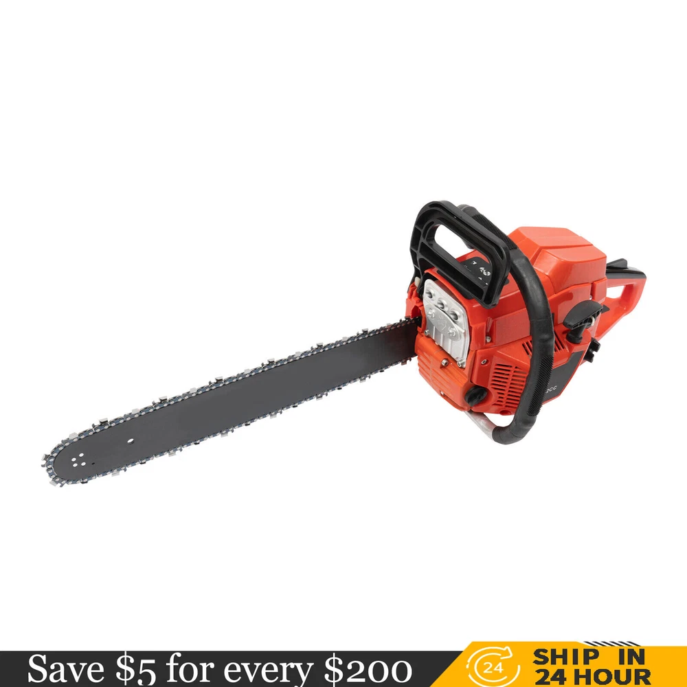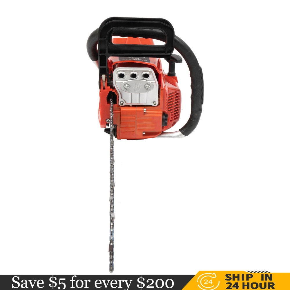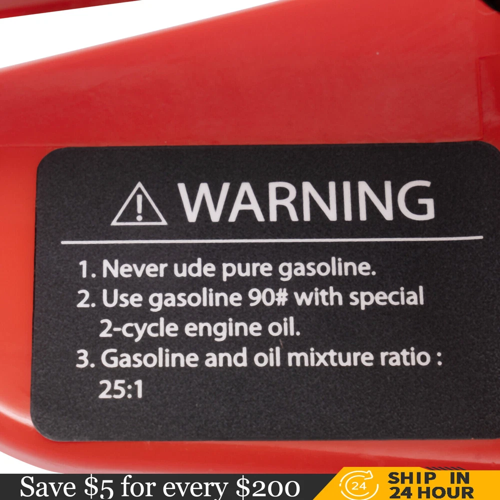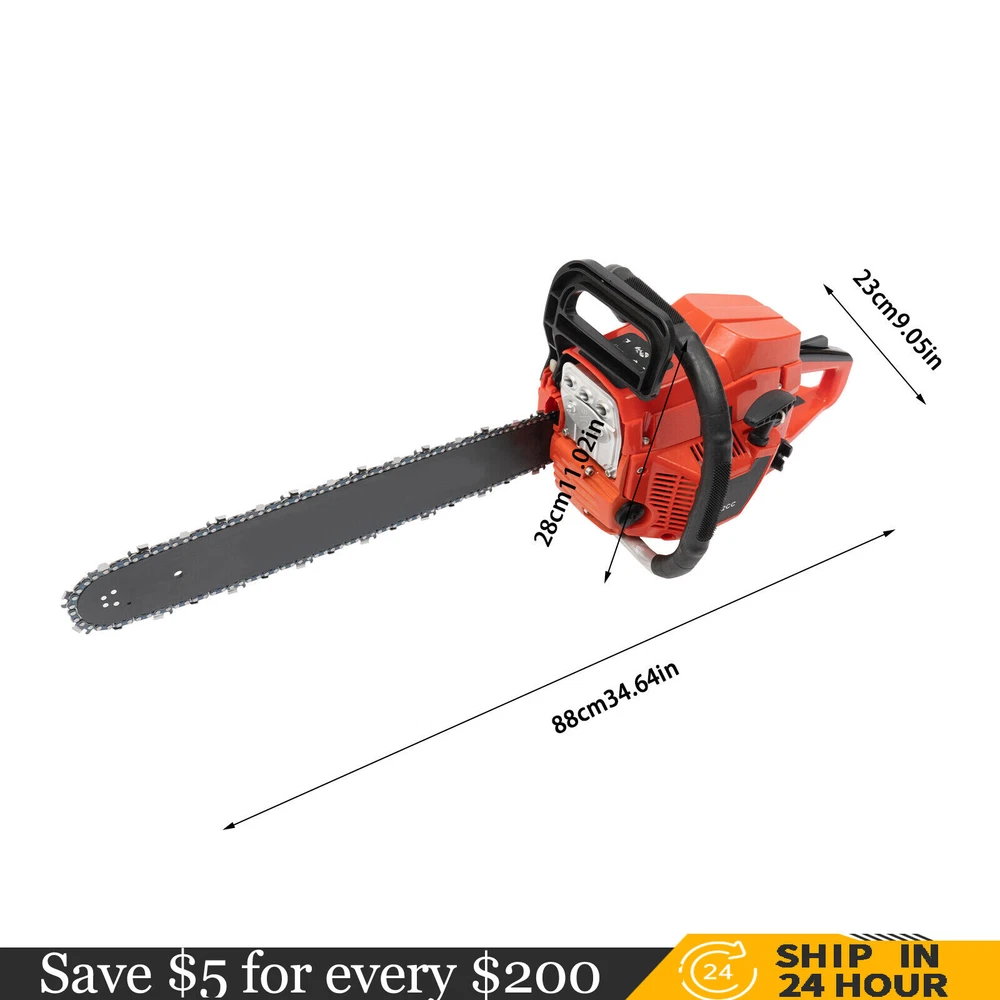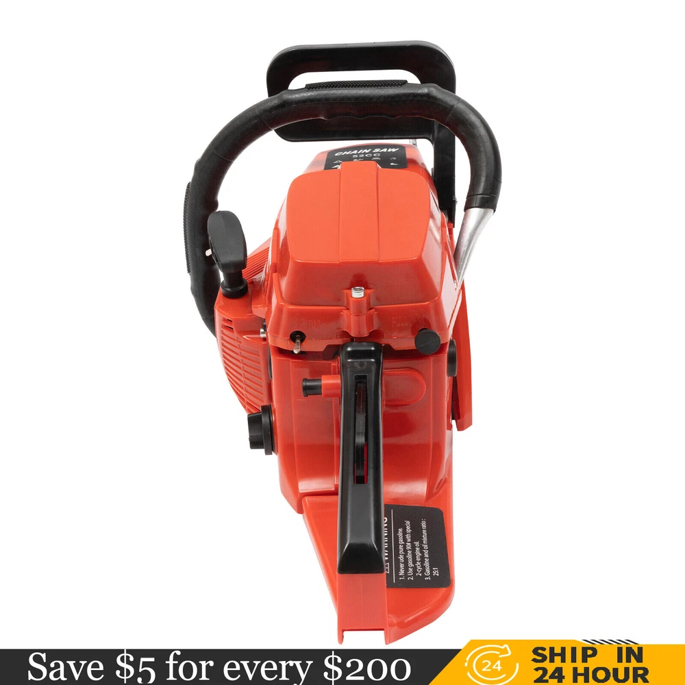 52CC 2-Stroke 20 Inch Chainsaw Gasoline Power Wood Cutting Limbing Chainsaw Gasoline Chainsaw, 52cc 2.2Kw, 2-Stroke Engine, 20 Inch Chainsaw, For Wood Cutting, Light Felling, and Limbing Description This gasoline chainsaw has the advantages of high quality(PP and Mn steel material), superior performance(10500rpm speed), powerful engine(2.2kw power), providing you with a professional cutting tool that saves you time and labor. With silencing and damping designs, an ergonomic handle, dual switches, a braking baffle, and a pull-start ignition method, it is comfortable and safe to use. How to Assemble the Chainsaw Install the jam teeth in the right direction. Install the guide bar. Install the chain. Cover the side cover. Adjust the chain tightness. Tighten the screw. Specification Color: Red, Black, Silver Material: PP, Mn Steel Style: Modern Assembly Required: Yes Engine Type: Single Cylinder, Air-cooled, 2-Stroke Ignition System: Self-reset Pull Start Fuel Tank Capacity: 550ml/18.6Oz Chain Fuel Tank Capacity: 260ml/8.8Oz Chain Pitch: 0.325# Bore: 45mm/1.77inch Power: 2.2kw Speed: 10500rpm Displacement: 52cc Oil Mixture: 25:1(Gasoline: Oil) Chain Length: 50.8cm/20inch Max. Cutting Diameter: About 48cm/18.9inch Product Size: 88*23*28cm/34.64*9.05*11.02inch Package Size: 56*27*34cm/22.04*10.6*13.38inch Gross Weight: 8.5kg/18.74 lbs Package Included 1* Gas Chainsaw 1* Chain 1* Guide Bar 1* Guide Bar Cover 1* Fuel Mixing Bottle 1* Oil Hopper 1* Tool Bag 1* English Manual Other Accessories for Assembly Key Features High-quality Material: This product is made of high-quality PP housing and Mn steel guide bar&chain, which is strong, durable, wear-resistant, and not easy to deform. Excellent Performance : The 2-stoke engine with 52cc displacement, 10500rpm high speed, and 2.2KW high power, the high-magnetic flywheel with thickened blade design, and the carburetor with the function of atomizing fuel help this machine keep normal and economical operation, reduce emissions, achieve fast cutting, thus providing excellent performance(about 18.9" cutting diameter). High Safety: The double protection switches that must be pressed at the same time to work can prevent the machine from accidentally starting, thus guaranteeing the safety of cutting work. Moreover, the high-quality brake baffle can make emergency braking, protect your hands from hurting, avoid sawdust splashing, and improve safety. Muti-Angle Cutting: You can achieve muti-angle cutting by changing the direction of the machine, which is convenient for you to use. Convenient and Comfortable: With a hand-pull spring-loaded starter handle, premium spark plug, safety switch, and throttle switch, it's convenient to use. Its cordless design allows you to operate more easily and freely. Moreover, the silencing and damping designs can effectively reduce noise and vibration, providing you with a comfortable environment when cutting. Automatic Lubricating Oil: Automatic lubricating oil can provide a stable and economical supply of chain and bar, reduce friction and oil consumption by 20%, thus improving cutting performance and extending service life. Easy to Install: The simple structure, complete accessories, and English manual allow you to install this product in minutes, saving you time and labor. Protective Package: To prevent the product from being damaged and bumped during transportation, we packed it with foam to protect your products to the maximum extent possible. Guaranteed Customer Service: We aim to provide quality products and services. If you have problems, please feel free to contact us. We will reply and solve the problem for you as soon as possible. Details Heat Dissipation Holes: The heat-sink holes on the side of the product can dissipate heat in time and prolong the service life of this product. 20-inch Guide Chain: It can meet the needs of cutting wood that need a longer bar. Tool Bag: You can put the equipped tools into the tool bag to avoid losing them while protecting the tools well to extend their service life. Guide Bar Cover: It allows for convenient storage of the guide bar when not in use and protects it well. Fuel Tanks: The 18.6Oz chainsaw fuel tank, 8.8Oz chain fuel tank, and equipped translucent fuel bottle allows for large capacity, a convenient mixture of fuels, and long-term use without frequent filling. Oil Hopper: The equipped oil hopper helps you add fuel to the machine easier without splashing. Ergonomic Handles: The ergonomic handles on the machine head and top have textured skin can give you a comfortable grip without slipping, absorb shock, and reduce hand fatigue even in long-time use for better balance&high-cutting performance. Application It is suitable for forest harvesting, cutting wood, pruning branches, gardening, home woodworking, bamboo sawing, logging, light felling, DIY crafts, ranches, farms, and so on to meet different needs. Notes Before starting the gasoline chainsaw, please ensure that it fits well with the guide bar, and use a wrench to adjust the chain. When installing the guide bar, please note that the screw column on the side cover must be aligned with the guide bar hole before installation(The function of the screw column is to adjust the chain tightness.). Please use gasoline 90# with special 2-cycle engine oil and never use pure gasoline. Gasoline and oil mixture ratio: 25:1. Adjustment of oil output: the oil output can be controlled to turn larger to the left and smaller to the right. Please note that after the first ignition sound, closing the choke and repeatedly pulling the start handle will suck in too much fuel and prevent the engine from starting. If the choke knob is not fully pushed back after pulling the starter handle up to 6 times, the engine preheating may be missed. Too much fuel will flow out and submerge the spark plug. Then you can't start the chainsaw. The damper is used to regulate air intake. When the engine is cold or not used for a long time, the damper needs to be 