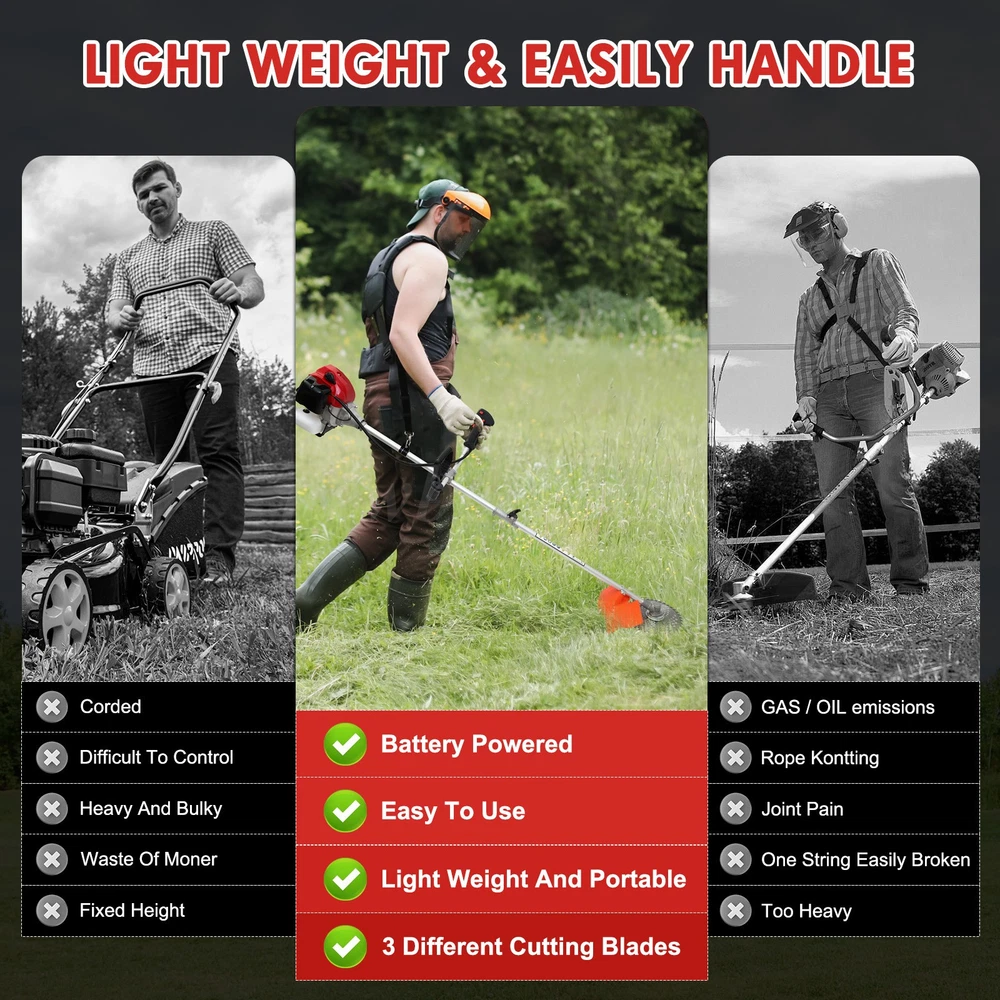 Description: It is an efficient and reliable weed wacker for lawn care. Brush Cutter and String trimmer are ideal for trimming around the garden and heavy work on brambles and thick brushes. It only takes a few seconds to convert, so you can use it quickly and easily trim around flowerbeds, sidewalks, and foundations. Gas Weed Eater String Trimmer/Brushcutter contains 4 cutter heads, one 3T blade, two dual thread head,and one Hedge trimmer head. Weed wacker has an 18'' Cutting Path to cover more ground in less time, which makes lawn work more simple and more efficient. The wide safety guard is designed to help protect the operator by deflecting debris produced during the trimming operation. Do not operate the unit without a shield. Trimmer line without bumping, adjustable u-handle, shoulder strap, and ultra-lightweight design, along with superior ergonomics allow for reduced user fatigue. This trimmer/edger has everything to keep your yard looking fantastic. 52cc 2-cycle Efficient Working 4 IN 1 Multi-use Trimming Heads Protective Cover Caring for Your Safety Easy-to-use&safe Double Switch Control Adjustable Shaft Design for Different People Adjustable Shoulder Strap Lightening Your Load Specification: Type: Gasoline Lawn Mower Engine Type: Single cylinder, air-cooled, 2-stroke Carburetor Type: Diaphragm type Displacement: 52cc Starting System: Recoil start Fuel Tank Capacity: 1.25L Drive Shaft Type: Hard shaft/soft shaft Operation Type: Backpack/side-mounted High Stability Speed: 10800r/min Ignition Type: Non-contact Max Power: 1.75kw Net Weight: 9.5kg Cutting Diameter: Blade 250mm, Nylon head 400mm Features: 【Adjustable Straight Shaft Design, Customize Your Trimming Experience】This gasoline lawn mower features an adjustable straight shaft design, making it easy to trim hard-to-reach areas under bushes and perform precise trimming in specific areas of your lawn. Simply adjust the straight shaft to meet your personalized needs. 【Ergonomic Handle Design for Effortless Control】The handle is ergonomically designed to ensure comfort during extended use, eliminating wrist strain. The height and angle of the handle are adjustable, allowing every user to find the most comfortable operating position. 【52cc Two-Stroke Gasoline Engine, Powerful Performance】Equipped with a 52cc two-stroke gasoline engine, the 1750W power effortlessly tackles various lawn challenges. Whether it's thick grass, weeds, or shrubs, it can cut through them quickly, revitalizing your garden. 【4-in-1 Trimmer Heads for Versatile Use】Comes with 4-in-1 trimmer heads including a three-tooth blade, nylon trimmer head, pole saw head, and hedge trimmer head. One machine handles all garden issues with ease. 【Large Capacity Fuel Tank for Long-Lasting Operation】The 1250ml fuel tank capacity ensures continuous work. With up to 45 minutes of runtime, you can focus on trimming and beautifying your garden without frequent refueling. 【Easy-to-Remove Baffle for Safe Operation】The easy-to-remove baffle prevents debris from splashing, ensuring safe operation. The transparent fuel tank allows you to monitor the fuel level at any time, ensuring smooth work. 【Powerful and Stable Gasoline Weed Eater】Compared to electric weed eaters, gasoline weed eaters are more powerful and stable. There's no need to worry about battery aging or power cord length, making your work more free and unrestricted. Package Contents: 1 x Lawn Mower 4 x Detachable Trimmer Heads (Three-tooth blade, Nylon trimmer head, Pole saw head, Hedge trimmer head) 1 x Plastic Mixing Bottle 1 x Shoulder Strap 1 x Protective Cover 1 x Installation Tool Kit (Hex wrench, socket wrench, double-headed screwdriver, handle, aluminum tube, tightening screws) 1 x User Manual Note: 1. Please allow slight errors due to manual measurement. 2. Due to display and lighting differences, the actual product may slightly differ from the pictures. 3. Product details may vary due to different production batches. If you are concerned about price differences, please purchase with caution. Thank you for your understanding. 4. If you have any questions about the product, please contact us. On Jul 18, 2025 at 07:15:17 PDT, seller added the following information: