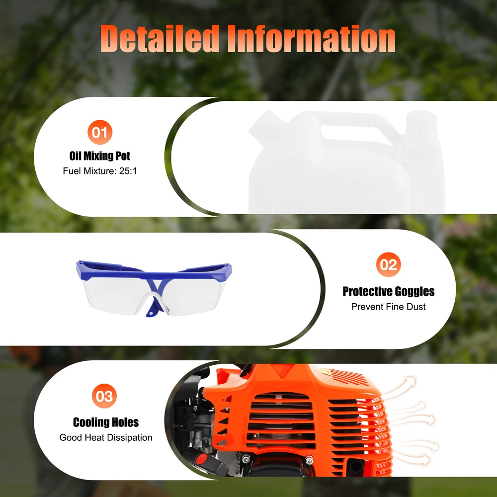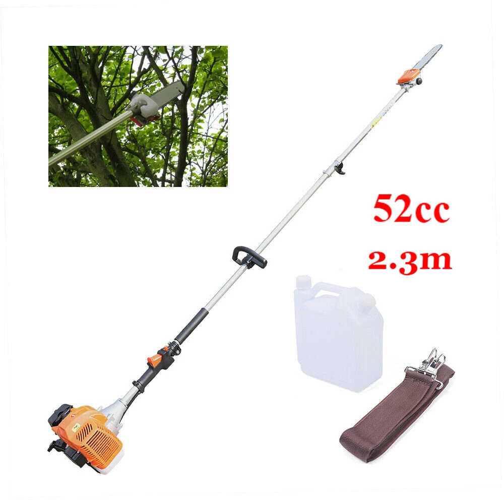 Specification Material: Aluminum Alloy Engine Type: Single Cylinder, Air-cooled, 2-stroke Gasoline Engine Fuel Consumption Rate: 480g/kw.h(1.05lbs/kw.h) Engine Displacement: 52cc Maximum No Load: 9500r/min Maximum Power: 1.25KW/6500RPM Fuel oil Mixture: 25:1 (2T engine oil) Fuel Tank Capacity: 1.2L/0.32gal Machine Weight: About 9kg/19.84lb Pole Length: 2.3m/90.55in Size: 35*35*250cm/13.78*13.78*98.43in (Plus Pole) Packing Size: 35*33*28cm/13.77*12.99*11in Package Included 1* High branch saw 1* Fuel Tank 1* Shoulder Strap 2 Stroke 52CC Chainsaw Pole Saw 3-HP Shaft Chainsaw Pruner Tree Trimmer Pole Description Are you still bothered by the unmanageable high branches in your yard? Then you can try our high branch saw. With it, you no longer need to risk climbing up a ladder or tree to trim branches. With its powerful 52cc engine, it gets the pruning job done easily and quickly. Its compact saw head can easily reach any corner without leaving a single weed or excess leaf behind. It will be your ideal choice! Key Features Powerful Engine: This high branch saw is powered by a two-stroke engine with a maximum power of 1.25 kW, so the powerful engine makes it possible to saw branches quickly and with less time and effort. Good Heat Dissipation: The engine housing has many cooling holes for heat dissipation, which prevent engine burn-out caused by long-term use and effectively extends its service life. Large Fuel Tank: The fuel tank has a capacity of 0.32gal, allowing the engine to work for long periods of time. You don't have to refill the tank frequently, which is very convenient. Great Durability: This high branch saw is mainly made of sturdy and durable aluminum alloy. This material will be uneasy to deform and rust. So the high branch has a long service life and you can use it with confidence. Safer: With this high branch saw you don't have to climb up the high trees to cut branches. The pole of this high branch saw is 90.55in long, so you can easily saw off high branches while standing on the ground, which is much safer for the user. Easy to Carry: This high branch saw is small and lightweight(19.84lb), and also comes with a shoulder strap and handle, making it easy to carry. User-friendly Design: The fuel tank is carefully designed to be visible in white and has a capacity of 0.32 gallons, making it easy for you to track the fuel level and refill in time for your convenience. Adjustable Height : You can remove the first section and reattach the bar with the saw head to the engine to get a shorter high branch saw for use at close range Low Fuel Consumption: With a fuel consumption rate as low as 480g/kw.h, it is very economical as it does not consume large amounts of fuel even after long periods of use. Guaranteed Customer Service: We aim to provide quality products and services. If you have any problems, please feel free to contact us. We will reply and solve the problem for you as soon as possible. Details Non-slip Handle: This high branch machine has a comfortable non-slip handle. This handle allows you to hold the saw more firmly and makes the operation more precise. Extension Pole: This high branch saw has a 90.55in pole so you can easily saw off high branches in a very safe and efficient way. Fuel Tank: The fuel tank has been carefully designed. It separates the oil and petrol tanks to facilitate accurate oil and petrol dispensing. Wide Shoulder Strap: This high branch saw comes with a wide shoulder strap, so you can carry it on your shoulder. This way, the operation will be more stable and help reduce vibration and fatigue. Application It is suitable for agriculture, forest fire fighting, horticulture, and other fields, to saw through high-altitude branches, small trees, etc. Specification Material: Aluminum Alloy Engine Type: Single Cylinder, Air-cooled, 2-stroke Gasoline Engine Fuel Consumption Rate: 480g/kw.h(1.05lbs/kw.h) Engine Displacement: 52cc Maximum No Load: 9500r/min Maximum Power: 1.25KW/6500RPM Fuel oil Mixture: 25:1 (2T engine oil) Fuel Tank Capacity: 1.2L/0.32gal Machine Weight: About 9kg/19.84lb Pole Length: 2.3m/90.55in Size: 35*35*250cm/13.78*13.78*98.43in (Plus Pole) Packing Size: 35*33*28cm/13.77*12.99*11in Package Included 1* High branch saw 1* Fuel Tank 1* Shoulder Strap Notes It is necessary to add oil to the engine oil tank and gasoline tank to mix, shake it evenly before use Please note that you must use two-stroke oil, not four-stroke oil or other engine oil, otherwise it will easily lead to pulling or other problems. Please allow the slight color difference caused by the shooting light and 1-3 cm error due to manual measurement, and make sure you do not mind before ordering. Payment Delivery details Terms of sales About us Contact us Payment We accept ebay payment 。 Fees such as import duties, taxes are not included in the item price or shipping costs. These charges are the buyer's responsibility. Delivery details Shipping: 2-9 working days to: USA Terms of sales We maintain high standards of excellence and strive for hundred percent customer satisfaction. Feedback is very important to us. We hope that you contact us immediately before you give neutral or negative feedback, so that we can address your concerns. It is impossible to address issues if we do not know about them! About us Your satis faction is our ultimate goal. We work hard to earn your trust and future business. Our certified technicians have tested each item before shipping. The unit comes with 1 year limited warranty on all manufacturing defects. a) If you receive a defective item, you may return it or ask for a discount. Please contact us within 14 days after you receive the package. b) What you returned must be intact and in its original packaging as re? u. Customer is responsible for shipping costs of the returned item. c) We will cover the cost of shipping back t with the shipping rate indicated in the registration page. We will send you a new unit or refund the full payment you paid. 