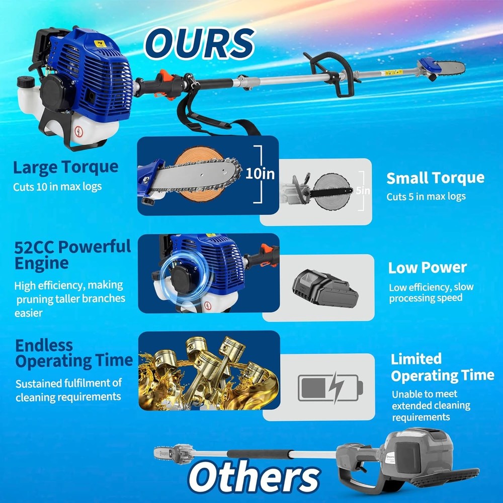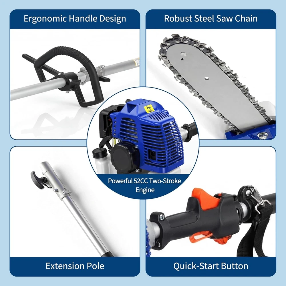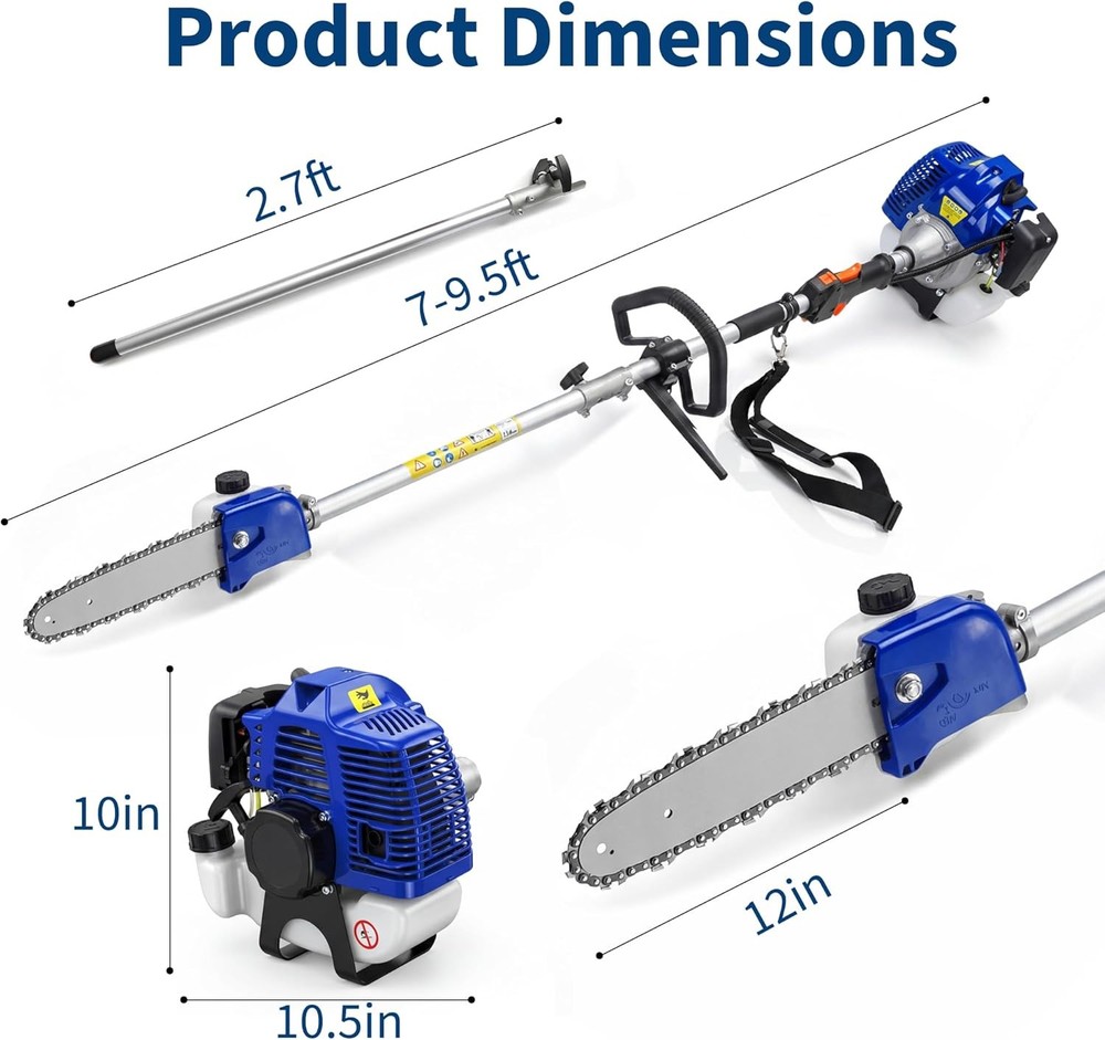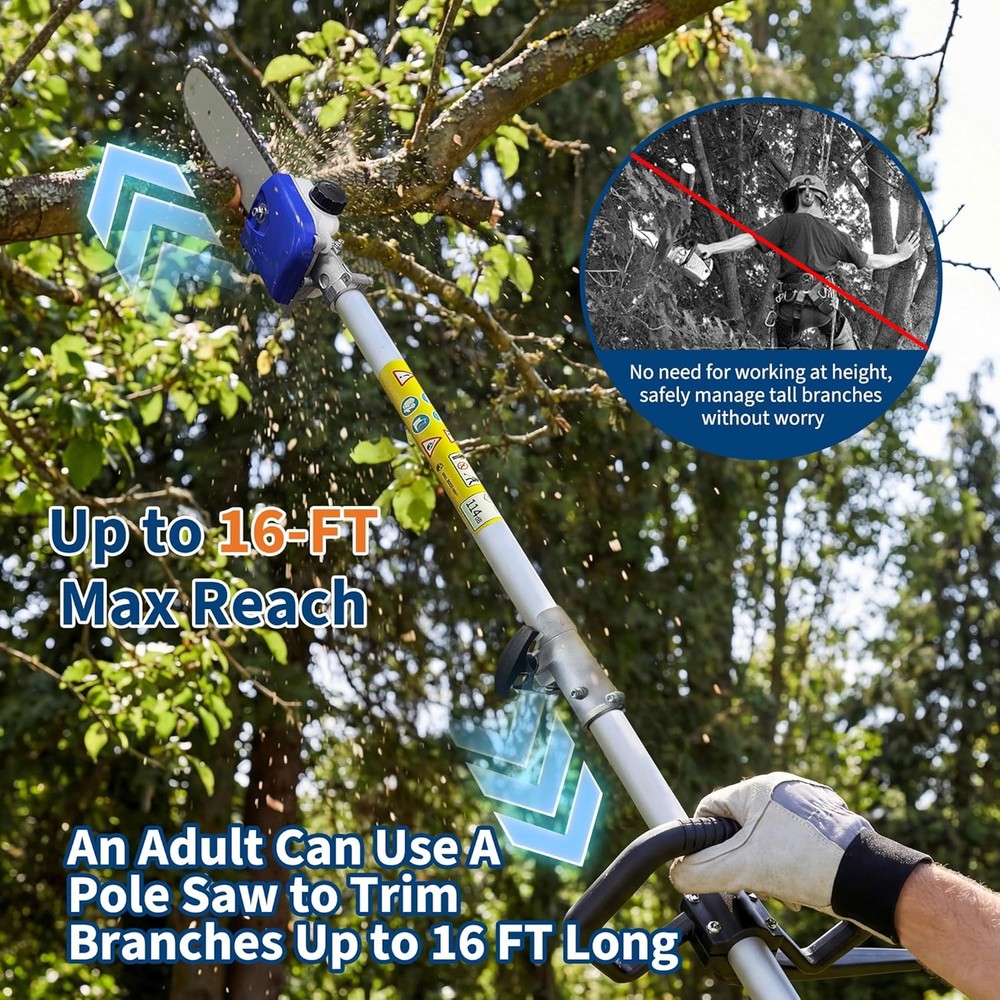 52CC Pole Saw 2 Stroke Gas Powered 16 Ft Triming Height for Tree Trimming Branch About this item 【Two-Stroke High-Power Engine】 This pole saws for tree trimming feature a 52cc two-stroke engine delivering 2.0 horsepower of robust power at 3000 RPM. This high-performance capability enables rapid cutting through 8-inch thick branches, meeting demanding cutting requirements. 【16-Ft Height Safety Pruning】 This gas-powered pole saw reaches up to 16 feet (including operator height), enabling safe pruning of high branches without ladders. With both feet firmly planted on the ground, you can focus on trimming tall branches while maintaining efficiency and safety. 【Smooth and Precise Cutting】 The gas-powered pole saw features a 12-inch guide bar paired with a high-hardness steel chain, delivering smooth and precise cutting performance to significantly boost pruning efficiency. As a reliable heavy-duty tree maintenance saw, it excels in various outdoor tasks including tree felling and pruning. 【Upgrade to Energy-Efficient Engine】 The pole saw features an upgraded energy-efficient engine paired with a 1200ml high-capacity fuel tank. A single full tank enables continuous operation without worrying about cord length or charging issues, reducing the frequency of refueling. Note: The recommended fuel mixture ratio for the two-stroke engine is oil:gasoline = 1:25. 【Balanced Design】 The pole chainsaw features an anti-slip handle and shoulder strap, combined with balanced power distribution to effectively reduce hand pressure and minimize fatigue during extended trimming sessions. Its comfortable handling experience is tailored for professional landscaping applications, enabling longer-lasting pruning operations. Assembly Required Yes Brand Unbranded Cutting Length 12 in Engine Size 52CC Engine Type 2-Stroke Features Ergonomic Power Source Gasoline Type Pole Chainsaw