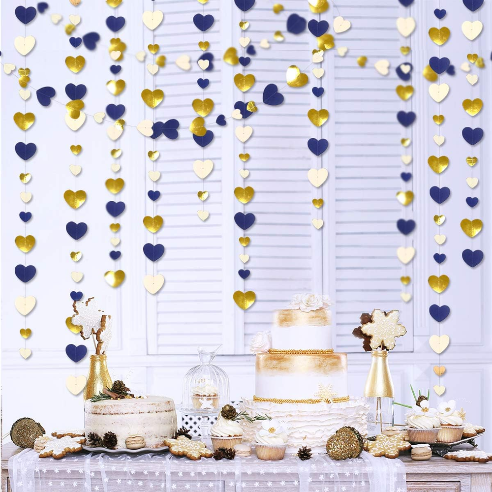 Package Contains - 4 packs of gold and beige white and royal blue heart party decoration garland,each string is 13 feet/ 4 meters. High Quality- Our blue gold backdrop garlands streamer are made of two different materials paper alternately.Double sided metallic paper and high quality cardstock , with neat cut,strong,durable and reusable. Unique Design - Different sizes(lovely little love heart and large heart love)and different material(metallic paper and cardstock),This design will let your party decor more eye-catching and special. Using Occasion - Perfect for decorating any parties.such as wedding,baby shower,birthday,bachelorette,engagement,bridal shower,graduation ceremony,valentines day,anniversary,Christmas,hen party navy blue party,gold party decoration and so on.Also ideal for nursery showcase backdrop decor. Product Warranty and Customer Service - We provide 48-day money-back and 24-month warranty. So feel free to contact us if you have any question. Product Description Pinkblume is specialized in designing and producing decoration products of house,party,wedding Our enterprise purpose is provide high quality products Please search our brand name: pinkblume Be sure to check out our other creations for your party!! Our creamy-white gold dark blue party decorations kit includes: 4 packs of blue gold heart garland Dimension: Each string of this navy blue gold heart garland is 13 feet/ 4 meters.Total length is 52 feet/ 16 meters. MULTIPLE OCCASION: Anniversary decorations Bachelorette decorations Baby shower decorations Bridal Shower decorations Valentines day decorations Blue Gold party decorations Navy blue party decorations Royal blue party decorations Engagement party decorations PERFECT FOR: Birthday decorations Wedding decorations Hen party decorations Blue party decorations Christmas decorations Gold party decorations Graduation decorations Heart party decorations Fiesta party decorations NOTICE: Unroll & unwrap garlands carefully. Due to delicate nature of thread, may tangle. There may be dimension errors to some degree due to manual measurement. There may be some slight differences between the color tone of the pictures and that of the actual items due to lighting effects, monitor's brightness and contrast settings, etc.