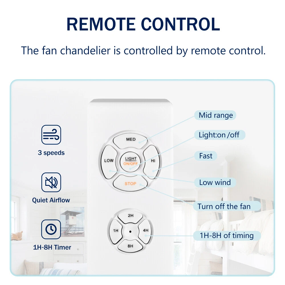【3 Speed & Quiet Motor】The motor runs smoothly, providing powerful airflow and multiple vents for powerful wind power. Low noise provides a non-interfering home environment. There are 3 speeds of high, medium and low that can be adjusted to meet your different needs and maintain the ideal comfort level. 【Durable 5 Reversible Fan Blades】In summer, the ceiling fan crystal light rotates clockwise to provide a cool wind. And the fan lamp rotates counterclockwise, promoting indoor air circulation during the winter to reduce energy costs. The reverse air flow feature allows you to quickly change the direction of the fan, for a proper distribution of air. 【Safe & Durable Ceiling Fan Light】The sturdy wooden blades are well machined to ensure smooth operation of the fan lamp without swaying. It has 3 functions of lighting, decoration and fan to meet your various needs 【SILENT MOTOR】:100% copper AC motor with balanced blade assembly ensures smooth and noiseless operation