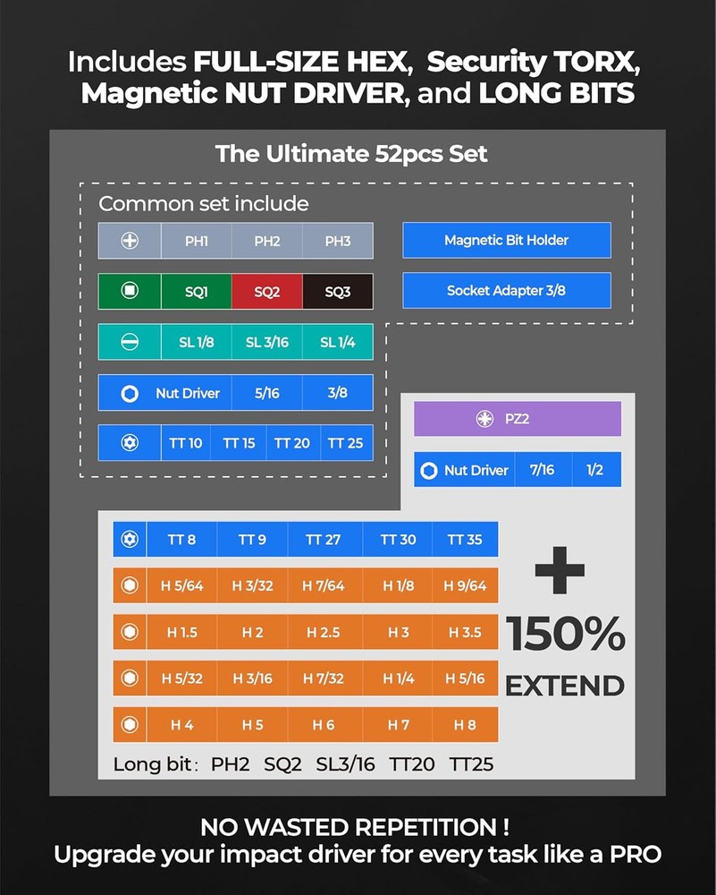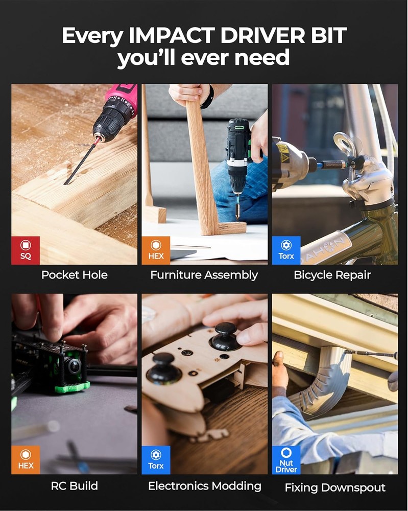 toolant Impact Driver Bit Set,52-Piece S2 Steel Screwdriver Bit Set,Hex,Torx,Phillips,Slotted,Square Bits and Nut Driver with Case Description Features: Complete range of products: The toolant impact driver bit set includes hex, torx, philips, SQ, SL, PZ screwdriver bits, nut drivers, bit holder and socket adapter, meeting the requirements for various screw fasteners.Compatible with all 1/4'' universal prower drills and impact drivers, such as Dewalt and Milwaukee Impact-resistant bits: The toolant impact bits are crafted using impact-resistant materials, capable of withstanding high torque, reducing the risk of breakage, and extending the lifespan well beyond that of standard bits.;Manganese Phosphate surface to prevent rust. Magnetic impact torx bits and nut driver helps you easy pick up screws.Magnetic bit holder can enhance the magnetic of 1" bits.The magnetism doesn’t decay after multiple uses. Easy identification: Different colors correspond to different types of screwdriver bits for easy identification. Additionally, each type in the set is marked with a colored ring following the toolant bit color-coding system for quick recognition. Thoughtfully designed:Screwdriver bit set with box for easy storage;Transparent box for clear visibility of contents, and a clip ensures secure closure. If you have any questions, please tell us and we will provide you with a solution Product Details: Manufacturer: toolant Item Weight: 1.57 pounds Package Dimensions: 8.86 x 8.66 x 1.34 inches Batteries Included?: No Batteries Required?: No Handling We will ship all orders within 3 business day of payment. Delivery We take pride in offering fast and reliable delivery for your orders! We are committed to getting your products to you as quickly as possible. Generally, we would like to inform you that all orders will be delivered to you within 1-3 business days after processing.However, in some cases, delivery times may vary depending on the buyer's location. Especially in remote or rural areas, the expected delivery time may be extended. In such situations, we do our best to ensure that your order reaches you as quickly as possible.If there are any delays, we will be happy to contact you to explain the situation. Our goal is to enhance your satisfaction with our fast delivery times. We work diligently to ensure that your order arrives safely.Trust us and enjoy our speedy delivery! Return Policy All items qualify for returns within 30 days of receipt. Buyer is responsible for return shipping on any item that is not damaged. Feedback We take our reputation seriously, we buy and sell online, so we understand the value of trust. If you are unsatisfied with your order, please contact us and we will work with you to resolve it to your satisfaction.