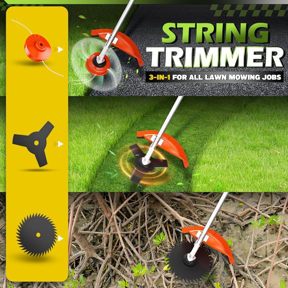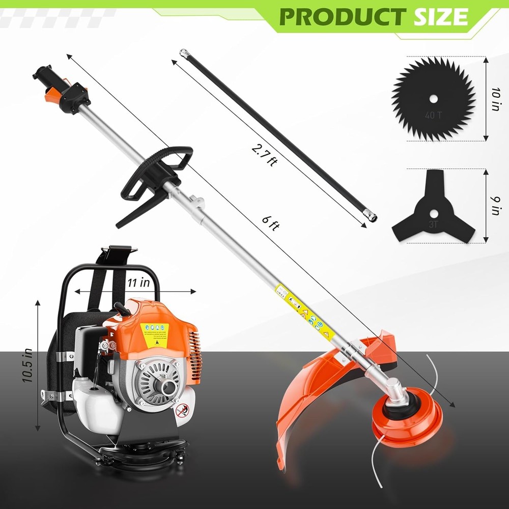 52cc 2-Stroke Weed Eater Gas Powered, 3 in 1 Gas Brush Cutter,Gas String Trimmer and Gas Weed Wacker Trimmer for Weeds and Grass About this item 1. Powerful 52cc 2-Stroke Engine Features a robust 1100W gas-powered engine that delivers reliable cutting performance through dense weeds and tough vegetation. Fuel-efficient design reduces consumption while maintaining maximum power output. 2. Versatile 3-in-1 Cutting System Includes three interchangeable heads: 5-inch string trimmer, 9-inch 3-tooth blade, and 10-inch 40-tooth circular blade. Handles everything from fine grass trimming to heavy brush clearing with quick-change convenience. 3. Ergonomic Backpack Design Padded shoulder straps and balanced weight distribution minimize user fatigue. Front handle provides optimal control for extended operation in large areas. 4. Professional-Grade Applications Ideal for maintaining gardens, fences, pathways, and property perimeters. Effectively clears overgrown vegetation that standard trimmers cannot handle. 5. Complete Ready-to-Use Kit Includes engine unit, backpack frame, wrench, fuel mixing bottle, all cutting heads, and necessary accessories. Fuel mix ratio: 1:25 (oil to gasoline). Product information Specification: Power source: 2-storke Engine power:1100W Fuel capacity:1000ml Idle speed:3000rpm Shaft type:straight Package: 1x 1000ml fule engine head 1x backpack holder 2x blades(3-T&40-T) 1x trimmer head 1x shouder blet 1x wrench 1x proportioning pot 1x instruction On Oct 2, 2025 at 08:11:55 PDT, seller added the following information: