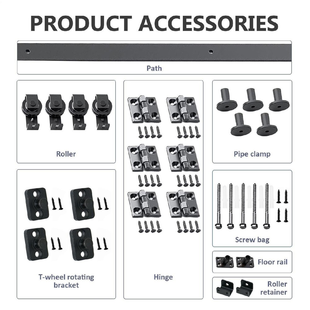 52in Bifold Sliding Door Track,Sliding barn door hardware kit,Black,Brand New-- Bullet Points: Optimized Durability Implementation: With stable construction and wonderful durability from excellent carbon steel, this bifold barn door hardware kit assures long-lasting and stable service Advanced Technology Integration: Blending excellent bearings and nylon wheels for enhanced weight support, providing a wonderful silent, seamless sliding experience on a sturdy 6mm track post rigorous testing Save Time and Money: Detailed instructions facilitate easy and convenient installation, streamlining the process and cutting down on expenses for users Optimizes Space Utilization: The space-saving design of the bifold barn door hardware kit efficiently maximizes room layout, allowing for better organization and functionality Wide Range of Applications: Perfectly complements diverse living areas like dining rooms, study nooks, and entryways, creating a stylish and cohesive design element Transform your space with our Folding Barn Door Hardware Kit! Stable construction with high-quality bearings and nylon wheels create a smooth sliding experience. Easy installation guide included. Ideal for dining rooms. Save space in style! Specifications: Product name: bifold barn door hardware kit Color: Black Material: carbon steel Track size: 52 inches (132CM) Track splicing method: 4 pieces Applicable scope: door panel thickness 0.5-50mm/0.01-1.96in Packing List: 4x FT track 4x rollers 4x roller swivel brackets 2x roller holders 6x hinges 2x ground guides 2x sealing strips 1x screw pack 1x instruction manual 5x pipe clamps 35mm 5x Wood Screws M8x90 Notes: 1. Due to different lighting and screen settings, the item color may be slightly different from the picture. 2. Due to different manual measurements, please allow a 1-2cm difference in size. Payment should be completed within 2 days after auction closed, or unpaid dispute will be filed for an closing auction. An unpaid case will be filled after 4 days ● We strive for 100% customer satisfaction ! ● Positive Feedback is very important to us. ● We hope that you contact us immediately BEFORE you give us neutral or negative feedback, so that we can satisfactorily address your concerns. ● We promise to offer the lowest price and high quality produce. Our working time: Monday to Friday (9:00 am to 18:00pm)(Beijing Time) Saturday (9:00 am to 12:00am),except International Holiday. Dear buyers : ● Welcome to my store ! ● Your satisfaction is our top goal,we appreciate your patronizing. ● If you have any questions, please contact us before leave negative or neutral feedback, we will try our best to solve the issue to your satisfaction, thanks ! ● If you are satisfied with our service, please rate the details of the transaction (Detailed Seller Ratings) on eBay. ● Please always talk to us via ebay Message . ● We appreciate your business and look forward to growing our e-Bay sales with satisfied customers.