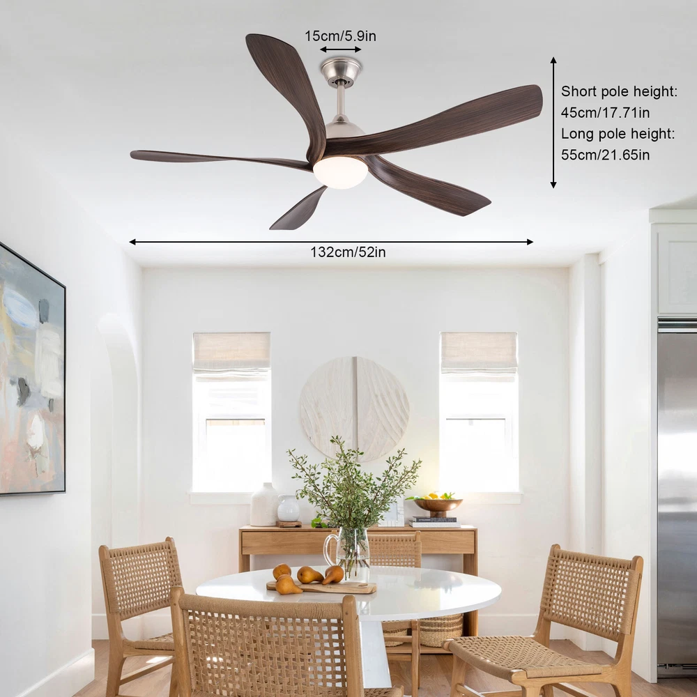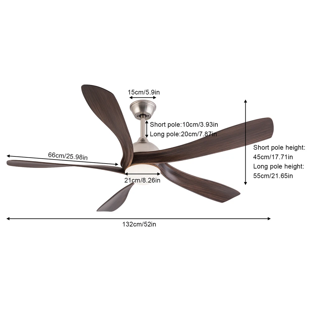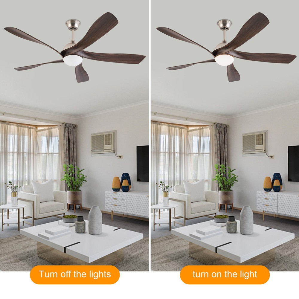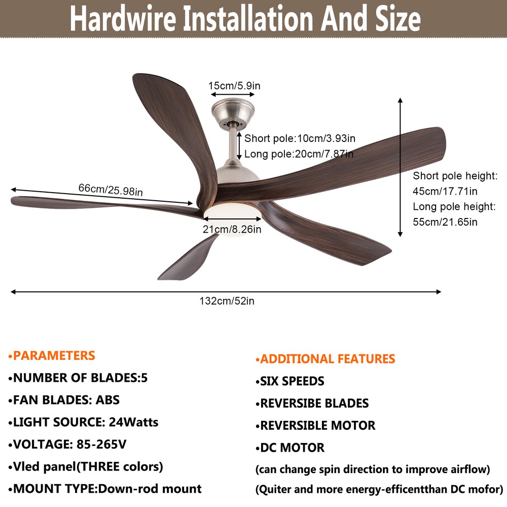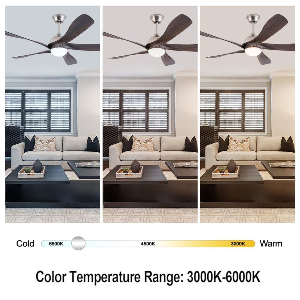 52in LED Ceiling Fan Light 3 Colors Ceiling Fan Lamp Bedroom w/ Remote Control Description This ceiling fan light allows you to feel the bright light and enjoy the coolness at the same time. It has six gears of wind speeds with a timing function to meet your daily usage needs, and y ou can also reverse the direction of the fan in winter. It can be integrated with different decoration styles and is ideal to create an excellent life and sleep environment to accompany you in all seasons. Key Features Sturdy and Durable: This product is made of iron, ABS and hardware with a painting process, with high hardness, high abrasion resistance , anti-corrosion , anti-rust to ensure your long-term use. Suitable for Winter and Summer: It has a forward and reverse function that the normal mode of the fan can bring coolness in summer, while the winter reverse mode can be combined with heating to press down the warm air and increase the air convection rate, creating a 360-degree ambient heating flow. Outstanding Lighting Effect: With the powerful light source, this product provides you with an excellent lighting effect within 86.11-161.46ft² , while protecting your eyes as the lighting will not flicker. Healthy and Energy-saving: The ceiling fan light provides more comprehensive air circulation and cooling, thereby reducing the frequency and time of air conditioning use, saving energy, and reducing expenses. It can avoid direct blowing and reduce the risk of air conditioning diseases. Adjustable Design: This product has three adjustable light colors (white, warm, and neutral ) and adjustable color temperature, so you can adjust it to meet your different needs. The fan's airspeed can be adjusted by 6 gears. In addition, you can control its working time in advance (1/2/4 hours) through the remote control (9.84-16.4ft), which will provide more convenience. Low Noise: I t uses a pure copper motor and runs with very little noise(35dB). Whether you're sleeping, working, or just trying to relax, it runs gently without disturbing others. High Applicability: A wide voltage range of 85-265V can be applied to most of the household's electricity needs. Fashionable Appearance: The ABS fan blades and simple brown color create a minimalist atmosphere that can be blended with different décor styles to add flair to your room. Easy to Clean: Thanks to the simple structure and smooth surface, you can easily wipe it clean with a rag (not included). Details Sturdy Base: This circular base increases the stress area, making the product more stable. Selectable Suspension Rods: The 4.72" and 7.87 " suspension rods provide you with the flexibility to install this ceiling fan according to your needs. Smooth Edges: The smooth and burr-free edges can effectively improve the safety of use. Application With an illumination area of 86.11-161.46ft² , it is suitable for a bedroom, living room, kitchen, dining room, corridor, aisle, balcony, study, reading room, living room, cafe, store, bar, office, lounge, library, club, hotel, kindergarten, and so on. It is not only suitable for indoor lighting but also can be used as a ceiling fan. Specifications Material: Hardware, Iron, ABS Process: Painting Color: Brown Efficiency: E Assembly Required: Yes Light Source: LED(Included) Motor Type: Pure Copper Motor Forward and Reverse Function: Yes Control: Remote(Included), Wall Switch(Not Included) Mount Type: Ceiling Mount Indoor/Outdoor Usage: Indoor Style: Modern Light Colors: White, Warm, Neutral Timing: 1/2/4H Wind Speed Gears: 6 Remote Control Battery Type: 2*AA Batteries(Included) Color Temperature: 3000-4500-6000K Luminous Flux: 2200LM Motor Power: 35W Light Source Power: 24W Voltage: 85-265V Noise: 35dB Remote Control Distance: 3-5m/9.84-16.4ft Irradiation Area: 8-15m²/86.11-161.46ft² Fan Suitable Area: 15-20m²/161.46-215.28ft² Gross Weight: 7.7kg/16.98lbs Net Weight: 6.5kg/14.33lbs Base Diameter: 15cm/5.91in Suspension Rods Height: 12cm/4.72in, 20cm/7.87in Overall Product Length: 132cm/52in Package Size: 80*33*29cm/31.5*12.99*11.42in Package Included 1* Ceiling Fan Light 1* Remote Control 1* English Manual All Accessories for Assembly Notes For a safe and secure installation, please ensure that the electrical box to which this fixture will be mounted is properly attached to a structural member of the building. Please make sure the power is cut off before installation. To ensure your safety, we recommend that two people install it together. Please install it by someone with an electrical license if necessary. Please wear electric insulation gloves (not included) and avoid scratching the surface of the item and the electric wire when installing. Please use it within the applicable voltage range and clean it regularly. Please cut off the power supply when you clean the item. Please wipe with a soft cotton cloth and do not use household cleaning agents. Please use it in a dry environment. It is not suitable for outdoors and bathrooms. Please keep flammable materials away from lit fixtures. Please read the operating manual completely before use. And pay particular attention to the safety instructions included. Please allow the slight color difference caused by the shooting light and 1-3cm error due to manual measurement, and make sure you do not mind before you order. Payment Delivery details Terms of sales About us Contact us Payment We accept ebay payment 。 Fees such as import duties, taxes are not included in the item price or shipping costs. These charges are the buyer's responsibility. Delivery details Shipping: 2-9 working days to: USA Terms of sales We maintain high standards of excellence and strive for hundred percent customer satisfaction. Feedback is very important to us. We hope that you contact us immediately before you give neutral or negative feedback, so that we can address your concerns. It is impossible to address issues if we do not know about them! About us Your satis faction is our ultimate goal. We work hard to e