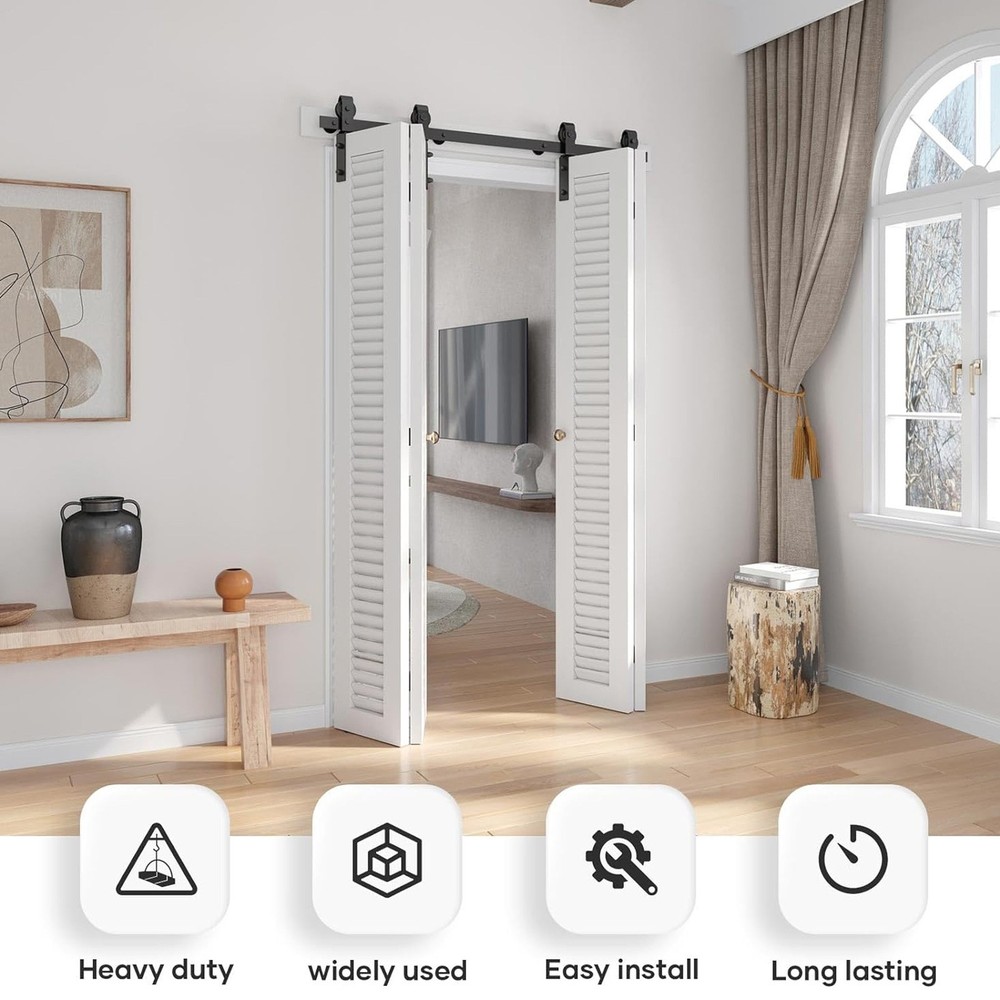 Store category Sign Up Now ! You may also like Product Description Bullet Points: Strong Durability: Crafted from high-quality carbon steel, our sliding barn door hardware kit ensures a smooth, wear-resistant journey on 6mm thick tracks; its durable rollers, combining reliable bearings with nylon wheels, offer a robust, anti-rust movement. Effortless and Time-saving: Our barn door hardware kit is perfect for hassle-free installation and transforms your folding doors with ease. The perfect space-saving solution for any household to enhance their home's efficiency. Practical and Helpful: Enhance your home's functionality with our sliding barn door hardware kit, designed for doors 1-3/8 to 1-3/4 thick, ensuring smooth operation and daily convenience. Easy Installation: Our sliding barn door hardware kit allows for an easy installation process, thanks to instructions that offer clear explanations and visual aids including diagrams and pictures. Widely Suitable: With its versatility and style, this sliding barn door hardware kit is a perfect addition to your home, restaurant, or study area. Widely applicable and equally dynamic, it can improve any living space to a whole new level of adaptability. Upgrade your home with our strong sliding barn door hardware kit! Save space and bring convenience to your daily life. Widely used in a variety of living situations, this hardware will give your home a modern and stylish touch. Specifications: Colour: Black Material: carbon steel Product Size: Track size: about 52 inches (132CM) Track splicing method: 4 pieces Scope of application: Door panel thickness of about 0.5-50MM Packing List: 4x FT track 4x roller 4x roller swivel stand 2x roller holder 5x pipe clamps 6x hinge 2x ground guide fixings 2x sealing strip 1x screw pack 1x Manual Notes: 1. Due to the lighting effects and photographing angles, there is a color difference in the product, please understand. 2. Due to manual measurement, there is a tolerance in the product size. Payment Delivery details Terms of sales About us Feedback & DSRs Payment Before you palce an order, please kindly make sure that you have a paypal account. We accept PAYPAL payment only. Payment should be completed within 2 days after auction closed, or unpaid dispute will be filed for an closing auction. An unpaid case will be filled after 4 days. Delivery details We ship to your eBay address. Each package will be shipped to US by UPS Regular Parcel with tracking number. Please check your shipping address carefully before checkout, it can't be changed if order completed. All items will be shipped within 1-2 business day upon receipt of payment.Orders placed on weekend will be shipped within 3 days. If you do not receive your item in 7-10 business days.please contact us immediately for further assistance. We will be responsible for any damages or losses incurred in the shipping process. About us We maintain high standards of excellence FIVE STAR and strive for 100% customer satisfaction! Positive Feedback is very important to us. We hope that you contact us immediately Before you give us neutral or negative feedback, so that we can satisfactorily address your concerns. We promise to offer the lowest price and high quality produce. Our working time: From Monday to Friday(9:30 am to 18:00pm), we don't working on holidays ,hope you can understand and know that , thank you. Please always talk to us via ebay Message. We appreciate your business and look forward to growing our e-Bay sales with satisfied customers. Feedback Contact us If you have any questions, please feel free to contact with us by ebay Message during our business hours ( 9:30a.m. to 5:30 p.m.), or email us through eBay, we will try our best to help you to resolve it. For any presale or after-sale questions,please do feel free to email us! Due to the time difference, each email will be replied within 1 working day,and weekend will be delayed a bit. Feedback