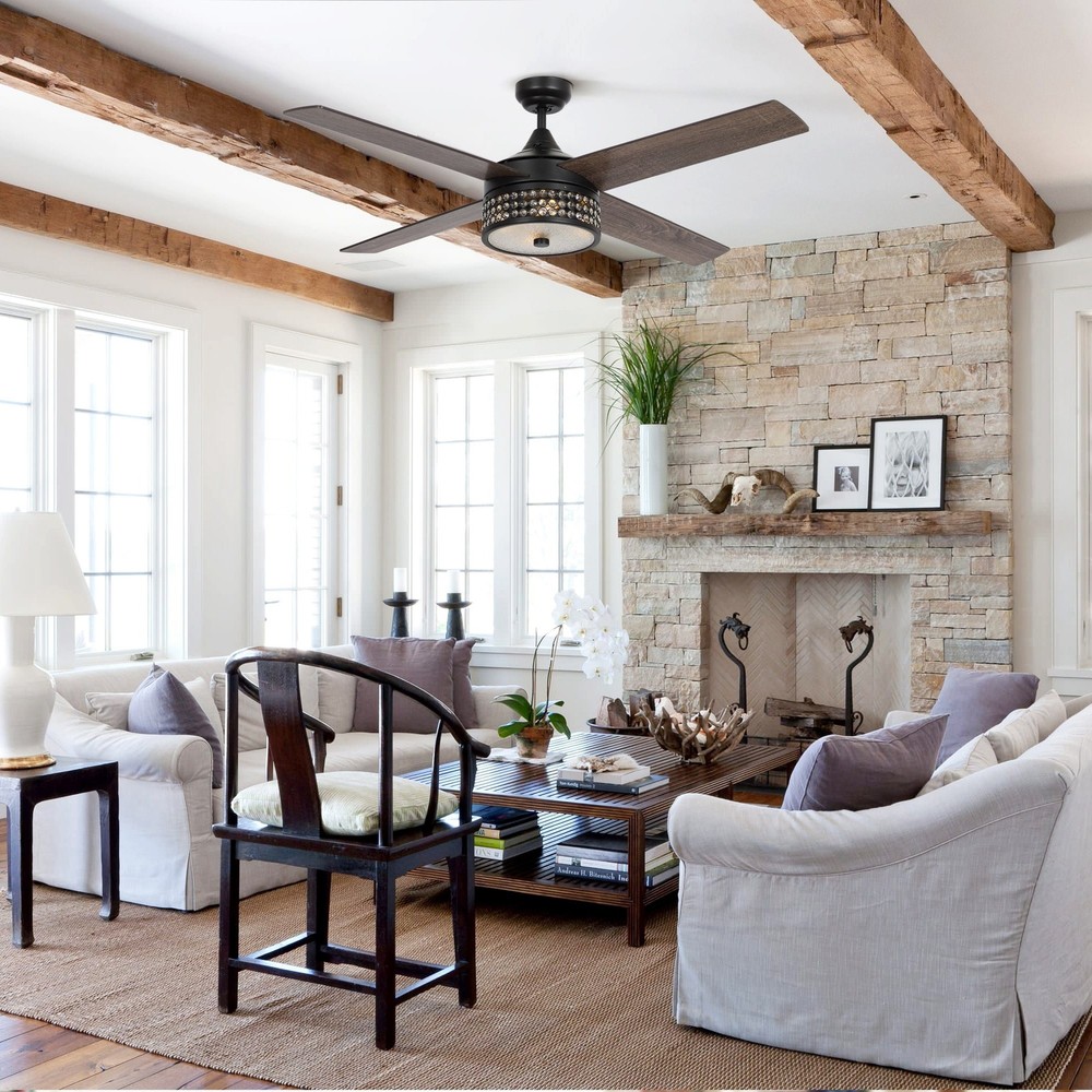 This 52-in reversible ceiling fan combines chandelier and fan functions 2 in 1. The downrod design is perfect for large rooms. It helps keep your space well-lit and at the perfect temperature. This chandelier fan features four wood blades with crystal and glass shade which is both practical and ornamental. Remote control comes included and offers an easy way to switch on and off or choose one of 3 speeds of the blade's rotation.Features: Farmhouse ceiling fan made of iron,glass and crystal 4 brown plywood blades included Matte black reversible motor included Handheld remote included 4 inch and 10 inch downrods included for standard profile mounting Max 15 degree sloped ceiling adaptable Easy control function: Use the remote control to adjust the fan speed and turn on/off the light. Free Shipping Over $49.99* Details 52-in Farmhouse 4-Blade Black Reversible Crystal Shade Ceiling Fan with Remote Product Description: This 52-in reversible ceiling fan combines chandelier and fan functions 2 in 1. The downrod design is perfect for large rooms. It helps keep your space well-lit and at the perfect temperature. This chandelier fan features four wood blades with crystal and glass shade which is both practical and ornamental. Remote control comes included and offers an easy way to switch on and off or choose one of 3 speeds of the blade's rotation. Features: Farmhouse ceiling fan made of iron,glass and crystal 4 brown plywood blades included Matte black reversible motor included Handheld remote included 4 inch and 10 inch downrods included for standard profile mounting Max 15 degree sloped ceiling adaptable Easy control function Use the remote control to adjust the fan speed and turn on/off the light. Silent AC motor 3 fan speeds, max 3380CFM, reversible motor for cool/ warm performance in summer and winter. Large room fan: Ideal for living rooms, bedrooms, dining rooms, kitchens, and patio areas up to 400 square feet. Includes all required hardware for easy installation Bulbs: Requires 4 E12 bulbs (not included) Bulb recommendation Type B for max 40W per light bulb or equivalent LED bulb Measures: 52" blade span. 17" ceiling to bottom of light ( with 4" downrod); 23" ceiling to bottom of light( with 10" downrod)