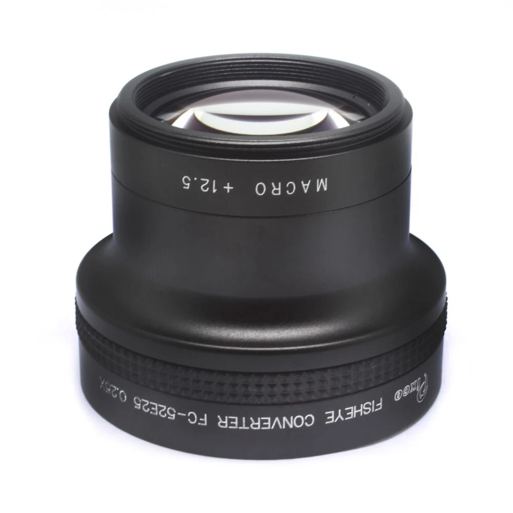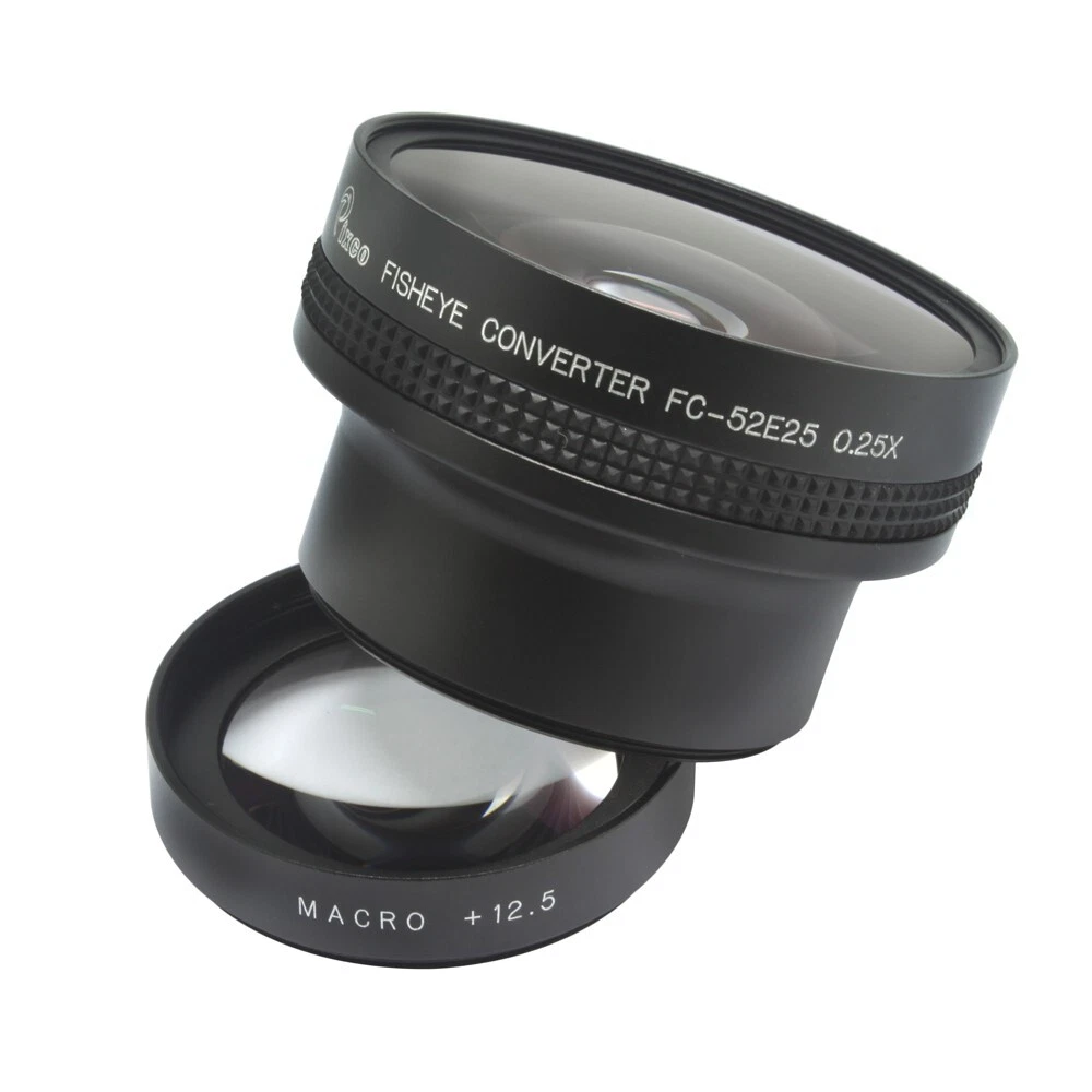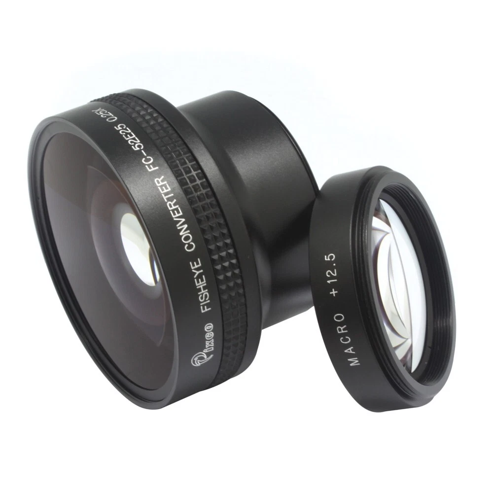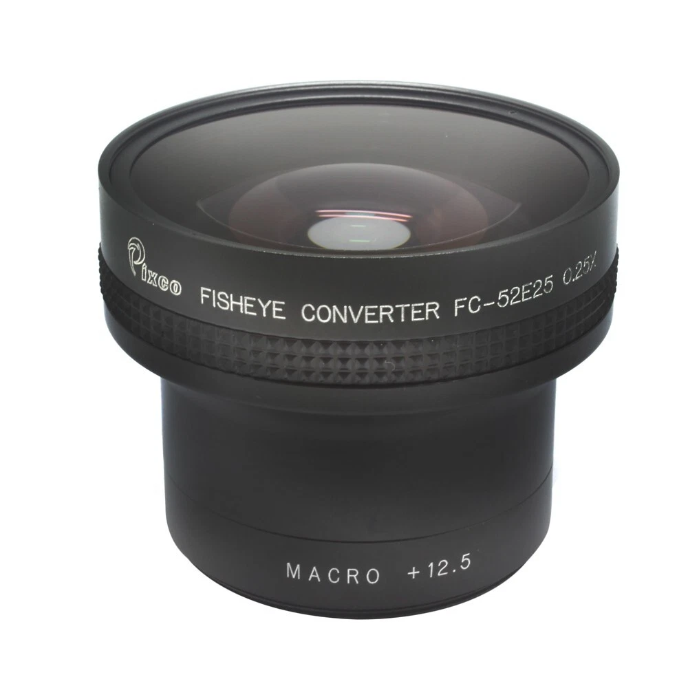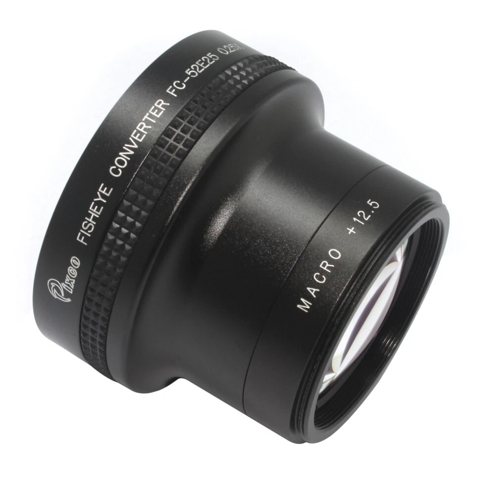 Pixco 52mm 0.25X Super Fisheye Wide Angle Lens Introduction Built-in detachable +12.5MACRO lens for extreme close-up shots Lens Back Threads Size 52mm Made of metal (not plastic) Color : black Compatible : ·All Camera Lens with 52mm Filter Thread Include: ·Pixco 52mm 0.25X Fisheye Wide Angle Lens Fish Eye x1 ·Lens Bag x1 ·Front Cover x1 ·Rear Cover x1 ·Original manufactory package