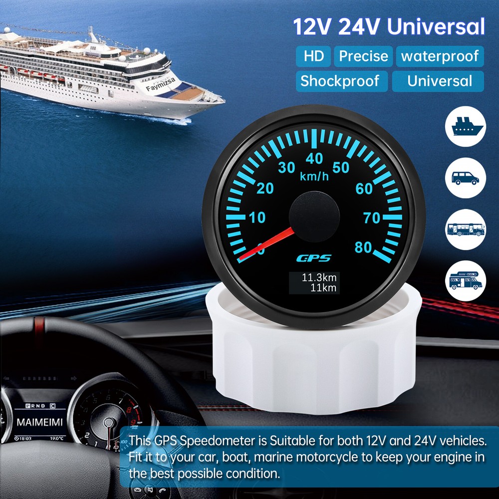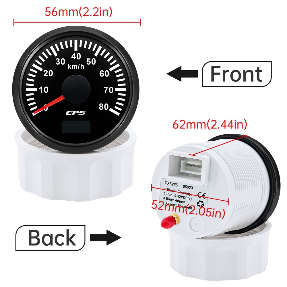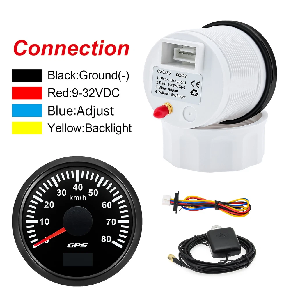 2" 52MM GPS Speedometer 0-80km/h Gauge for Motorcycle Boat Car Truck Waterproof 52mm Digital GPS Speedometer Speed Odometer Gauge 0-200Km/h for Car Boat Truck Specifications Item Name: 52mm GPS Speedometer Gauge 0-200Km/h Dial: Black Material: Stainless Steel 316L Bezel + Anti-fog Glass Install Diameter: Φ52mm or 2" Signal: GPS Working Voltage: 9~32V DC Working Current: ≤100mA Operating Temperature: -30℃ ~ 75℃ Storage Temperature: -40℃ ~ 85℃ IP67 waterproof and dustproof grade Indication Range: 0-200Km/h Backlight:7 Colors Backlight Product Descriptions High-brightness LED backlight. 316 stainless steel for long-term use even in acid-base, humid environment. IP67 waterproof and dust-proof grade. With curved glass( with anti-fog function). Suitable for all kinds of vehicle modification. Using stepper motor drive pointer, accurate display of the engine speed, and with the LCD display clear display mileage. Gauges have many kinds backlight color (red,yellow,orange,green,blue,purple,white),customers can adjust any color that you like. Connection: Black: Ground(-) Red: 9-32VDC Blue: Adjust Yellow: Backlight Package Includes: 1X 52MM Digital GPS Speedometer Gauge 1X Instruction 1X Wire Harness 1X GPS Antenna