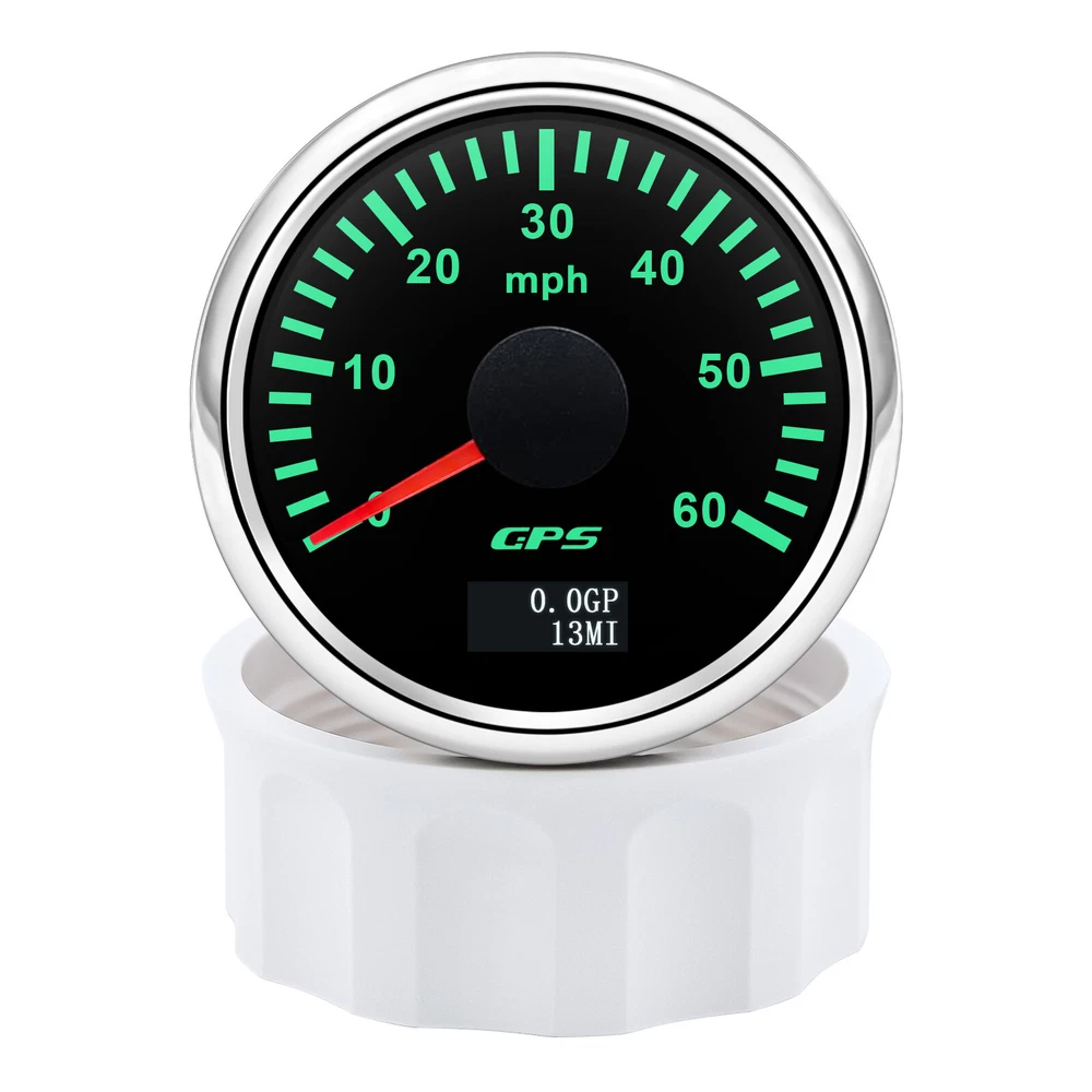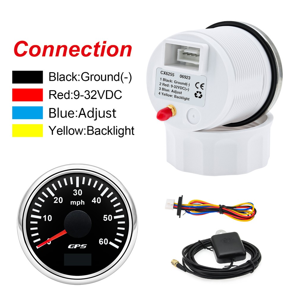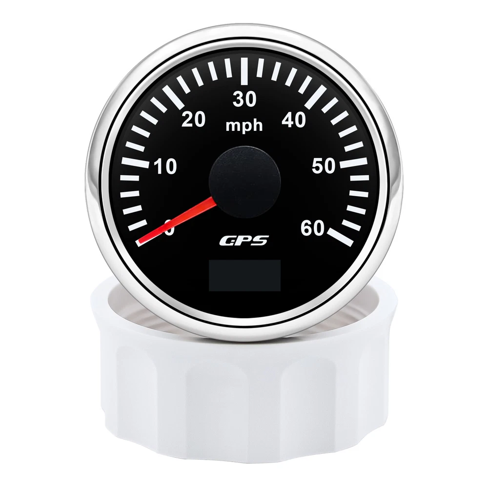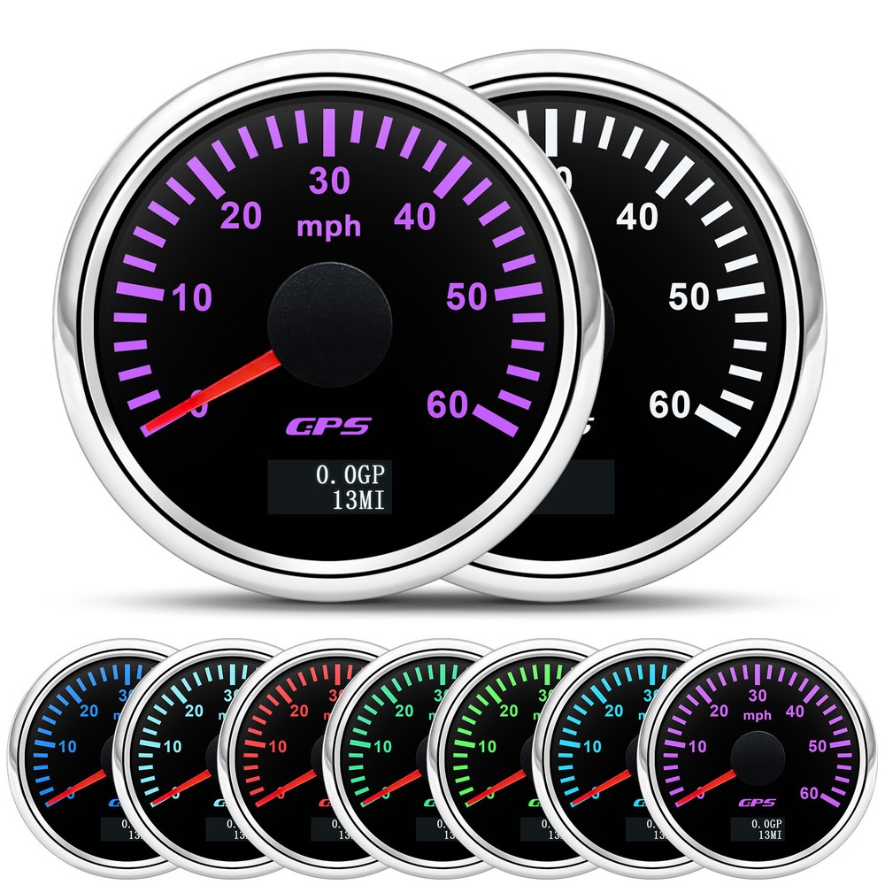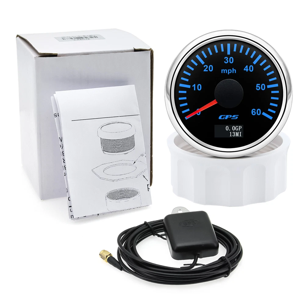 2'' 52mm Black GPS Speedometer 0-60MPH Gauge 7 Color LED For Boat Car Motorcycle 52mm GPS Speedometer Gauge 0-60 MPH Speed Odometer Stainless Waterproof for Car Boat Truck Specifications: Name: GPS Speedometer Odometer Material: PVC+Stainless steel+Glass Panel Color:Black Backlight Color: 7Colors LED Fixing Dimension: 52mm(2") Working Voltage:9~32VDC Working Current: ≤100mA Operating Temperature: -30°~75° Storage Temperature:-40°~85° Levels Of Protection: IP67 Indicating Range: 0-60MPH Suitable for car truck boats off-roadvehicles boats Features: -Protection grade is IP67. -100% brand new and high quality -With polarity reverse protection function. -The durability is good, and the seismic performance is good. -Thesignal comes directly from the satellite signal receiver(GPS Speed Sensor) -The gauge has the advantages of high precision,quick location confirmation and short start up time. -With ultra-wide working voltage design(long-term operating voltage: 9~32V,Maximum up to:36V(≤ 1 min) Installation instructions: 1.Opening a hole in the panel (your cabin board and dashboard) with a diameter of 85mm,Insert meter into the hole,The panel corresponding to the instrument panel is marked with a convex table,and open a small notch in this location,To ensure that there is at least 85mm of the instrument panel at the back of the instrument. 2.After the instrument is mounted in the panel,Screw down with a fixed ring.Opening a hole in the panel (your cabin board and dashboard) with a diameter of 85mm,Insert meter into the hole,The panel corresponding to the instrument panel is marked with a convex table,and open a small notch in this location,To ensure that there is at least 85mm of the instrument panel at the back of the instrument. 3.Connect the wire,the instrument housing is directly connected to the 9~36V power supply. 4.Insert wire harness,Firmly locked in the table. Package List: 1 x GPS Speedometer 1 x Standard Cables 1 x GPS Receiver 1 x Installation Instruction