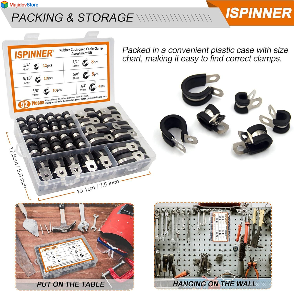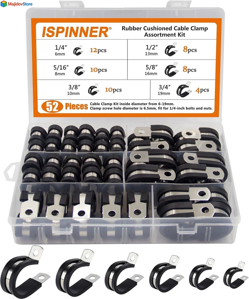 ISPINNER 52pcs Cable Clamps Assortment Kit, 304 Clamp Black Description Features: ✅【HIGH QUALITY】Made of high quality rubber cushioned stainless steel, with high performance of corrosion resistance and acid resistance, they are strong and durable. When installed, you will no longer worry about them rusting and breaking. ✅【SIZE & QUANTITY】This 52pcs cable clamps assortment kit includes 6 different sizes for you to deal with multiple different situations. It includes 1/4 inch (12pcs), 5/16 inch (10pcs), 3/8 inch (10pcs), 1/2 inch (8pcs), 5/8 inch (8pcs), 3/4 inch (4pcs). ✅【UNIQUE DESIGN】The rubber on the clamp can help prevent vibration and impact from clamp edges on the held objects. The width of whole clamp is 19mm, which is wider than most rubber cable clamps on the market. More sturdy to protect the tubes well and hold the pipes firmly in place. ✅【EASY TO USE】The installation is easy, just find a correct clamp and put it into wires/pipes, tighten it with M6 screws. Comes with a convenient plastic case with size chart, making it easy to find correct rubber clamps quickly, saves your time of running around looking for a particular size. ✅【WIDE APPLICATION】It is very suitable to apply in automotive, industrial, boat/ship, windshield, household and other indoor/outdoor application for wiring, cables, pipes, racks, line management and repair. Product Details: Manufacturer: XM Part Number: CABLE-CLAMPS-BLACK Item Weight: 1.14 pounds Package Dimensions: 7.64 x 5.47 x 1.42 inches Item model number: CABLE-CLAMPS-BLACK Size: Cable Clamp Kit Color: Black Style: Industrial Material: Stainless Steel Batteries Included?: No Batteries Required?: No Material: Stainless Steel Brand: ISPINNER Color: Black Style: Industrial Item Weight: 0.52 Kilograms Manufacturer: XM Handling We will ship all orders within 2 business day of payment. Delivery We Do Not Ship Outside of the Continental US. Return Policy All items qualify for returns within 30 days of receipt. Buyer is responsible for return shipping on any item that is not damaged. Feedback We take our reputation seriously, we buy and sell online, so we understand the value of trust. If you are unsatisfied with your order, please contact us and we will work with you to resolve it to your satisfaction.
