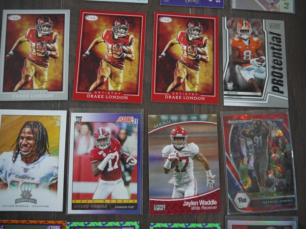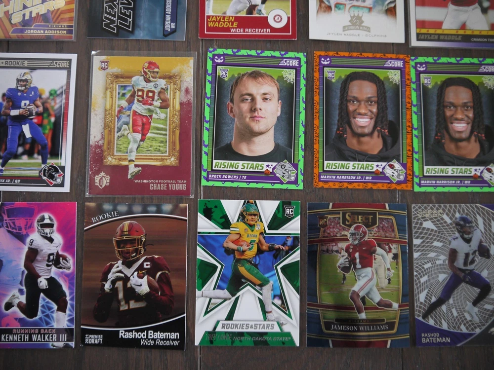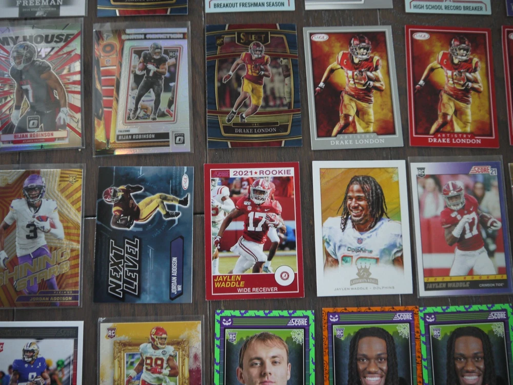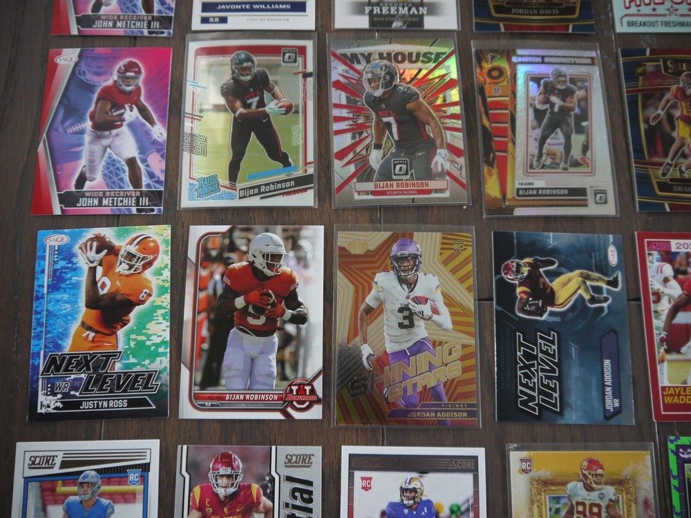 Elevate your football card collection with this substantial lot of 53 modern rookie cards, featuring big names like Bijan Robinson, Rashee Rice, Jordan Addison, Zay Flowers, John Metchie III, and Justyn Ross. Box K | Free Shipping