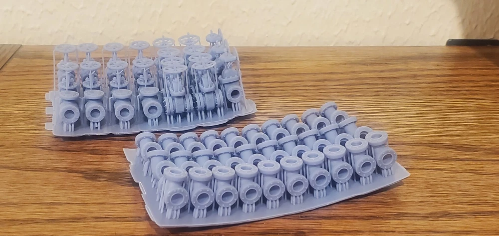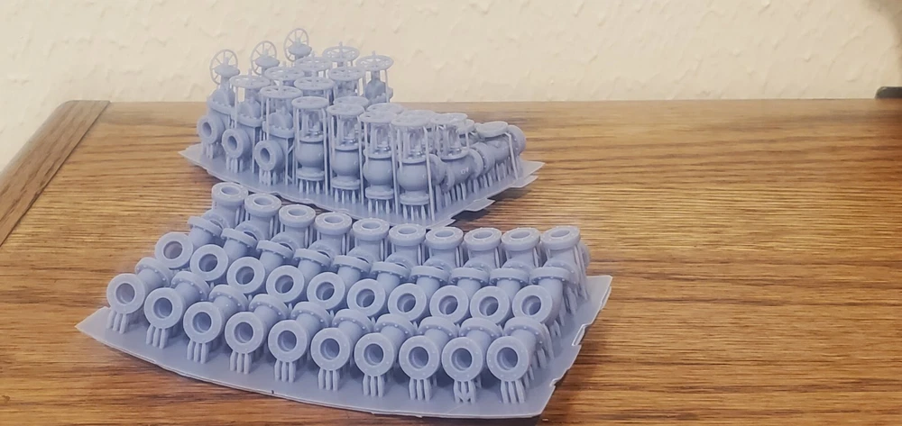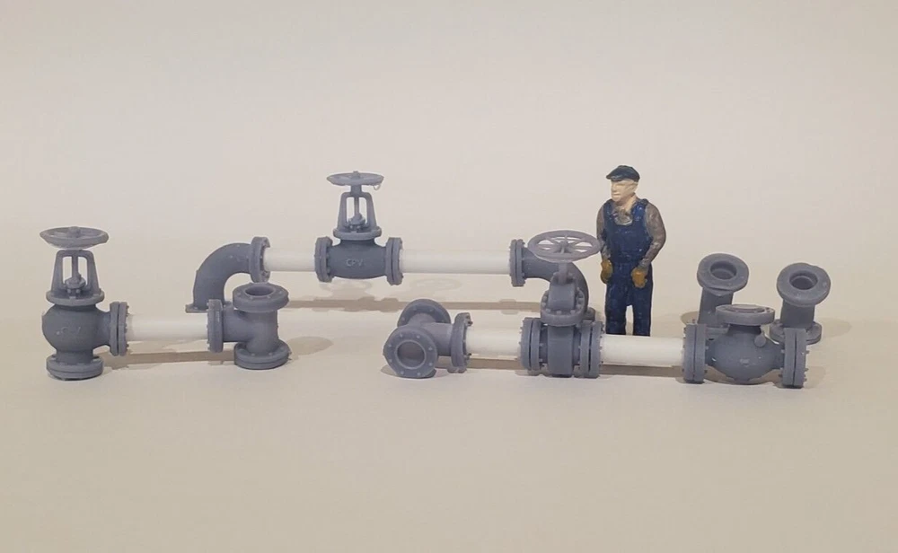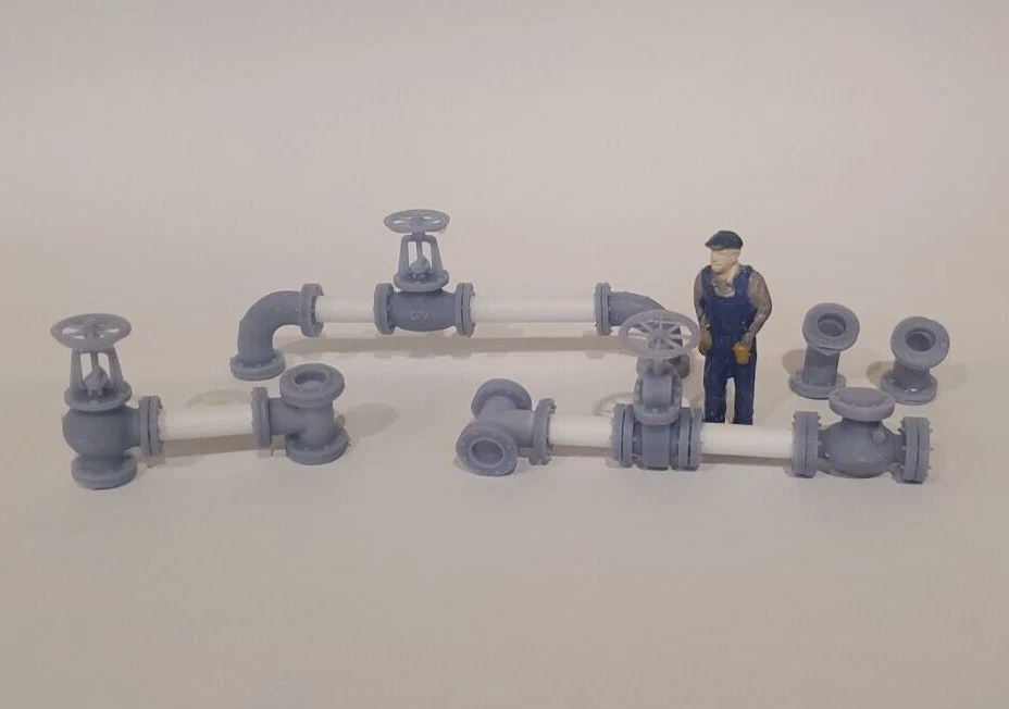O Scale Valves. 3D printed Valves - Design by me; a valves sales engineer. Designed to use with 5mm or 3/16 Plastruct tubing; or Evergreen. Tubing not included; nor are the figurines. You will receive the following quantities of each item. 10Tees; 10 90 Degree Elbows; 10 45 Degree Elbows; 11 Gate valves; 4 Right Angle Globe Valves; 4 Straight Pattern Globes; 4 swing check valves. 53 pieces total. These would be roughly 8" in O Scale. Condition is "New". Shipped with USPS First Class. Build your own water plant; oil field; refinery. Search Ebay for my next smallest size! Note: I leave supports in place on handwheels to give them strength during shipping. You can remove very easily. I now have 3 sizes available - check ebay. If you want ball valves or control valves let me know; I have them available.