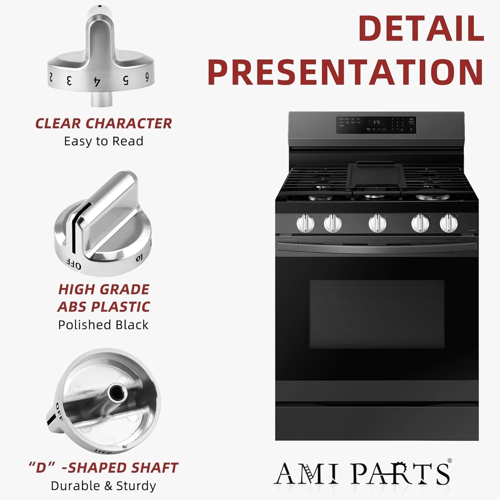 These are 5304502763 Gas Stove Knobs designed for Frigidaire Gas Range Stoves. The set includes 5 knobs made of plastic with engraved numbers for easy identification. They have a silvery chrome finish and are suitable for cooktops and conventional ovens/stoves. The knobs are designed for easy installation and are compatible with specific Frigidaire models.
