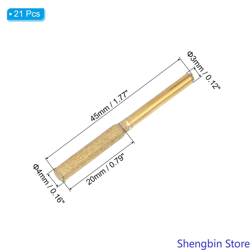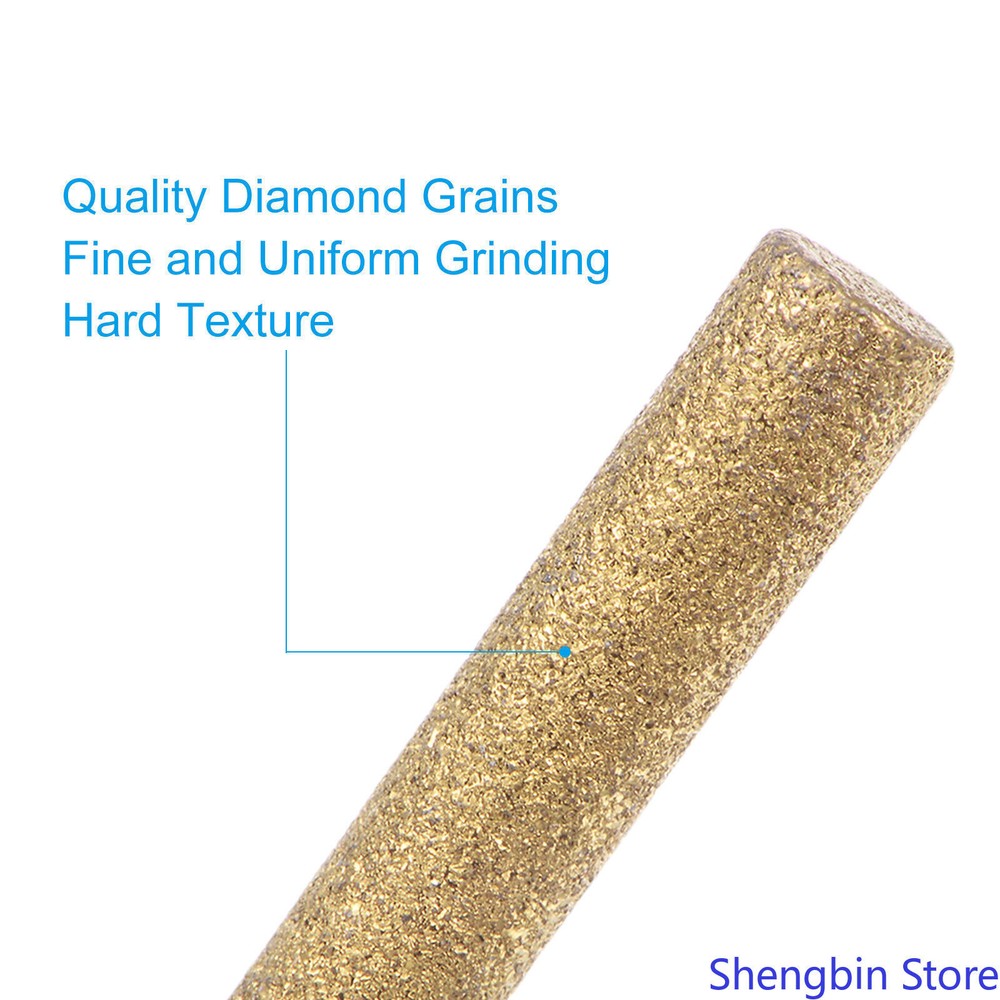 5/32" Diamond Chainsaw Sharpener Sharpening Stone Grinding File Gold 21pcs This stone file is suitable for surface graining, polishing, etc. of various materials such as metal, stainless steel, steel, copper, wood, and plastic. These diamond chainsaw sharpeners are widely used for grinding saw teeth, glass, jade, models, bearings, machinery, and metal rust removal. Specification Material: Hard Carbon Diamond Grinding Head Diameter: 4mm / 0.16 inch Grinding Head Length: 20mm / 0.79 inch Shank Diameter: 3mm / 0.12 inch Total Length: 50mm / 2 inch Packing List: 21 x Sharpening Stones Advantage 1. These chain saw sharpeners are forged with diamonds, they adhere tightly to the surface and are not easy to fall off. The particles are full and evenly distributed, which ensures the stable and efficient grinding of the chainsaw, and is hard and not easy to wear. 2. Wheel grinder replacement is easy to install and can be sanded without removing the chain. The grinding tool accessories save time and effort, and can effectively improve work efficiency, allowing you to complete grinding as soon as possible. Instruction Hold the handle and place the grinding head on the surface to be sanded and rub it back and forth. NOTE: Please check the size carefully before purchasing.